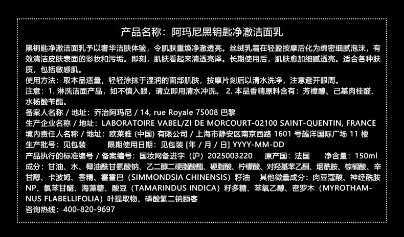 阿玛尼 黑钥匙洗面奶150ml 氨基酸洁面温和清爽