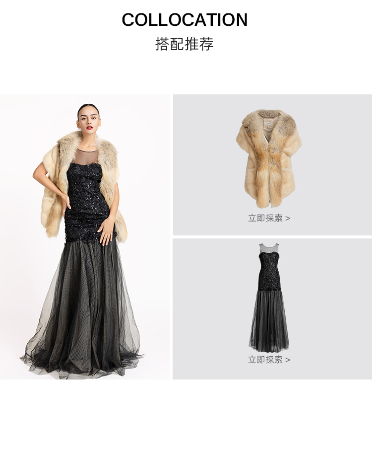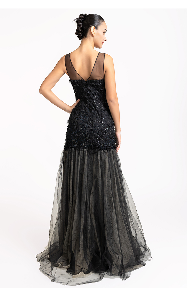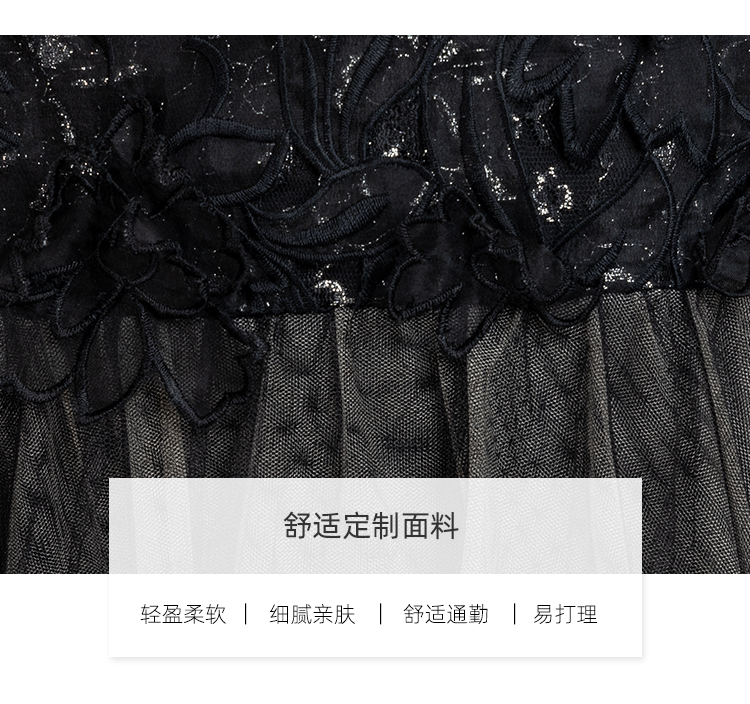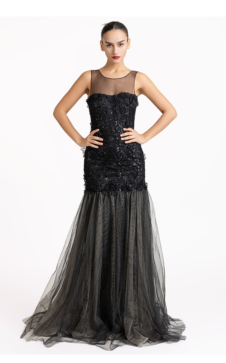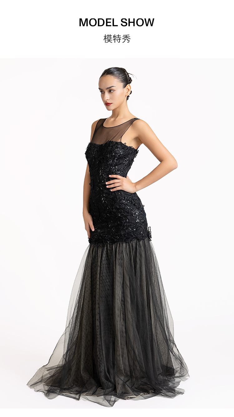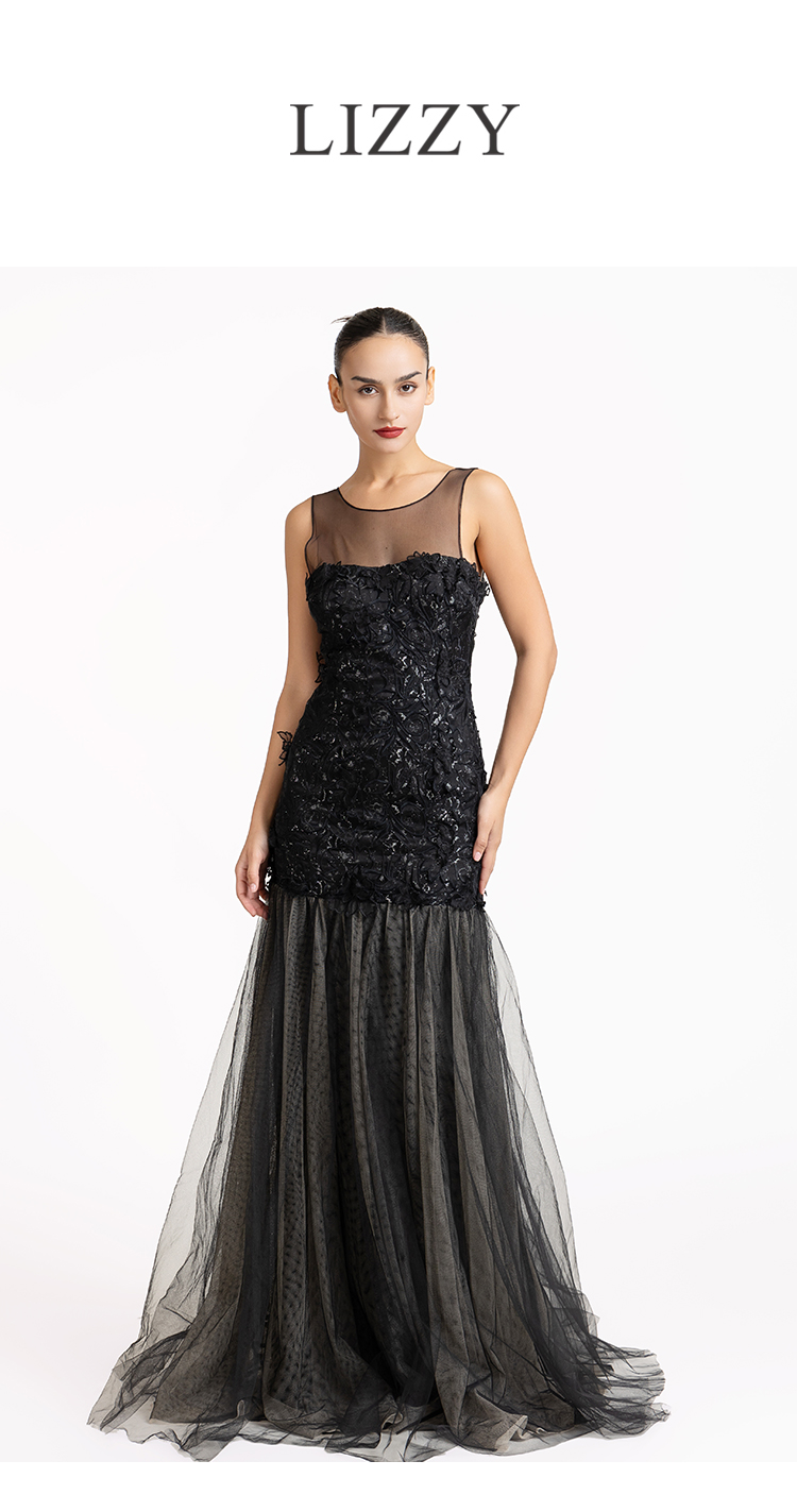 LIZZY时尚优雅重工刺绣立体钉花拼网纱裙摆长款宴会派对裙晚礼服5211