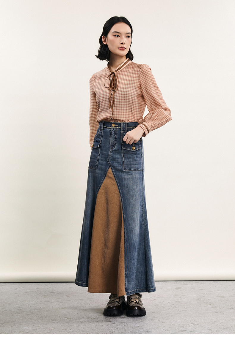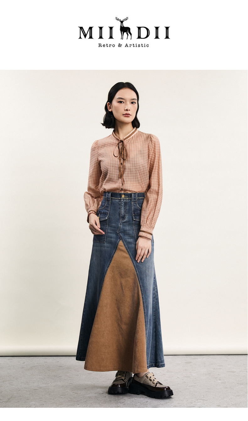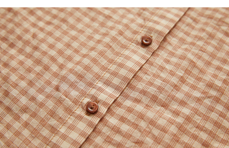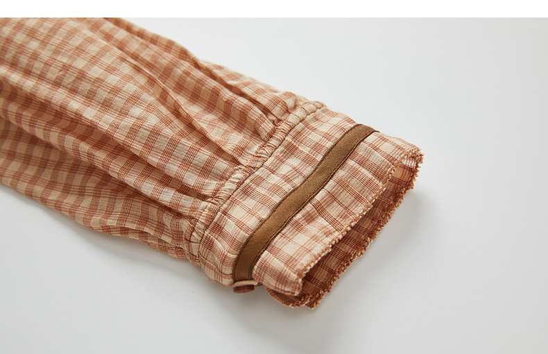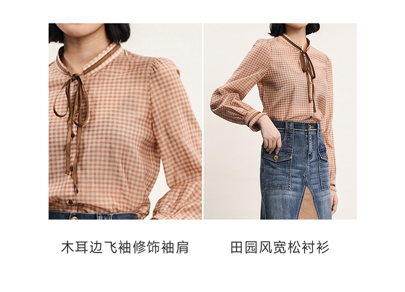 谜底格子衬衫长袖女2024春新款复古风圆领宽松格纹衬衣241MC0161