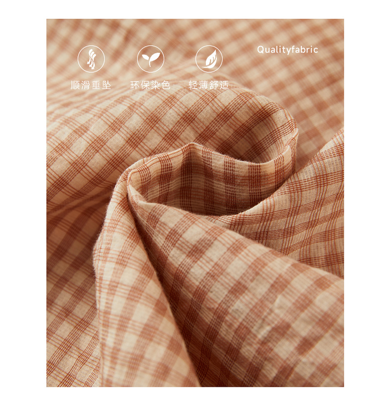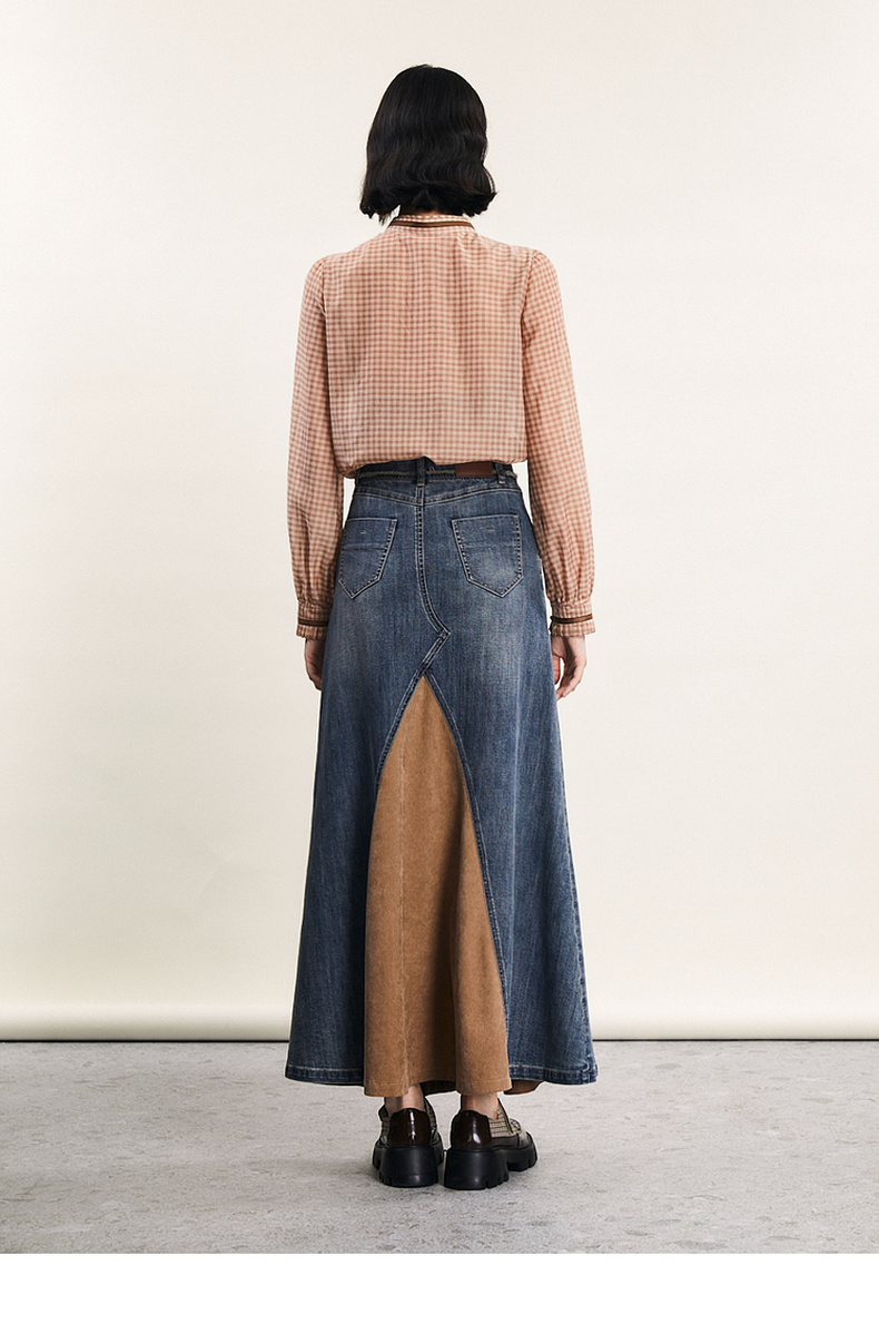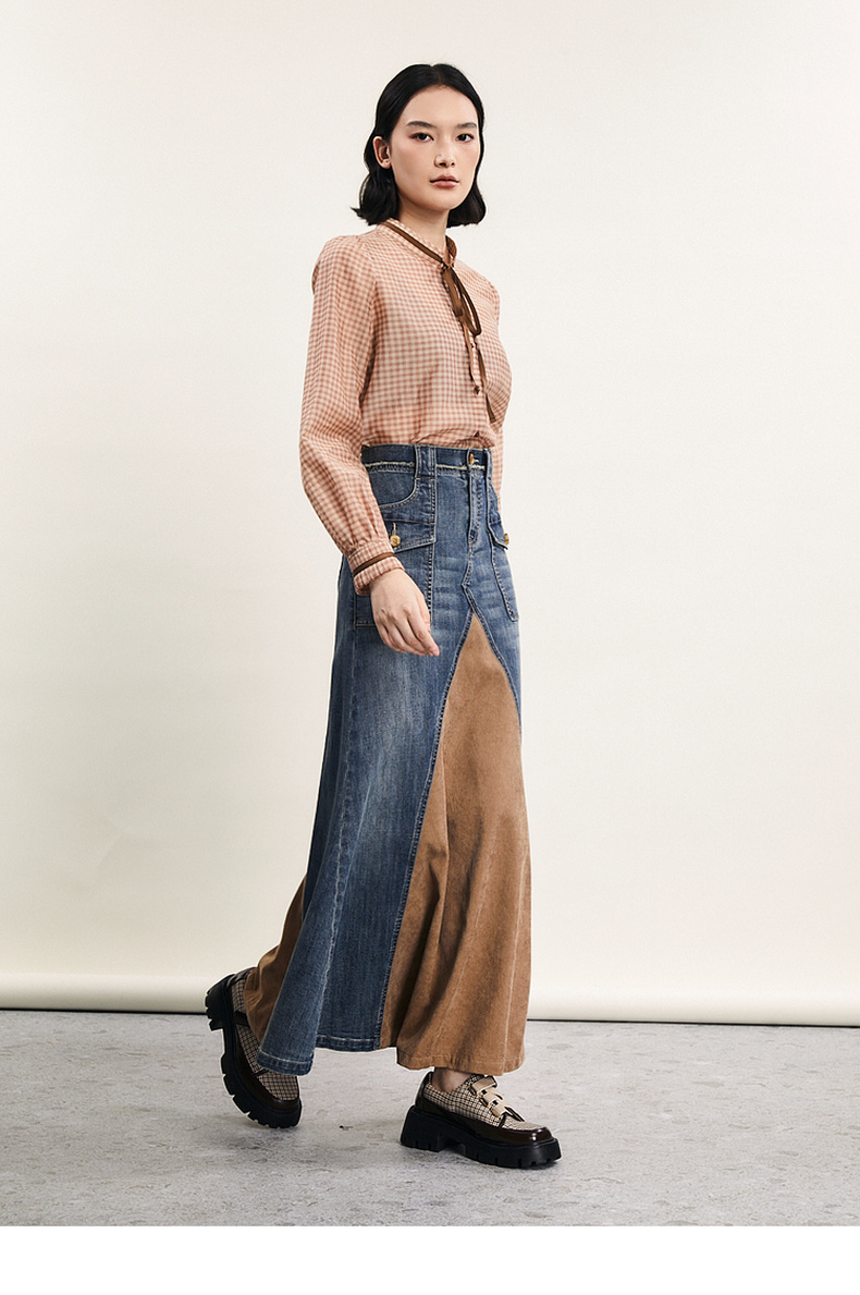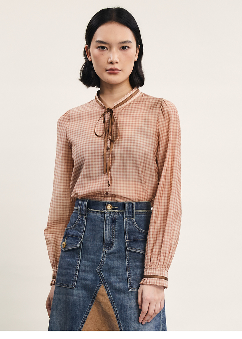 谜底格子衬衫长袖女2024春新款复古风圆领宽松格纹衬衣241MC0161