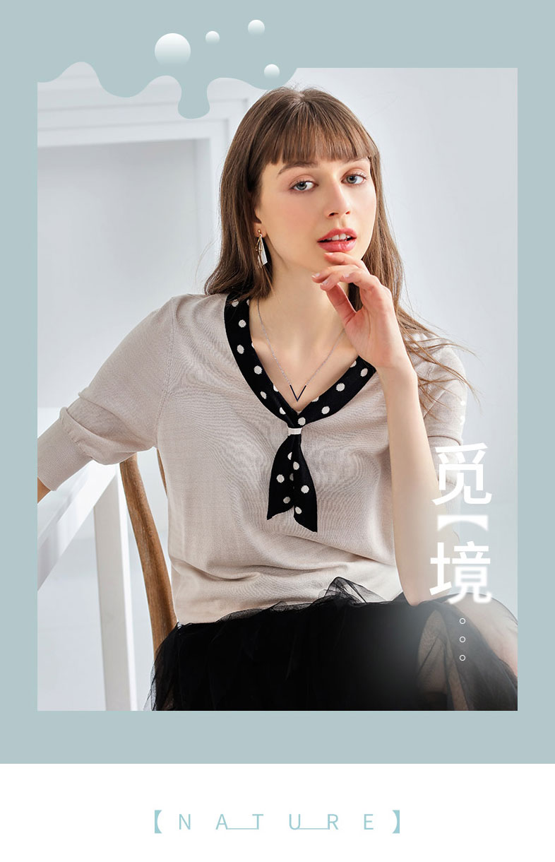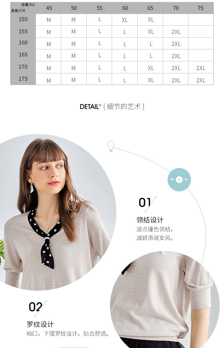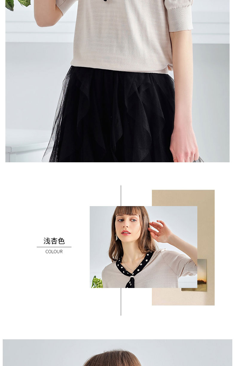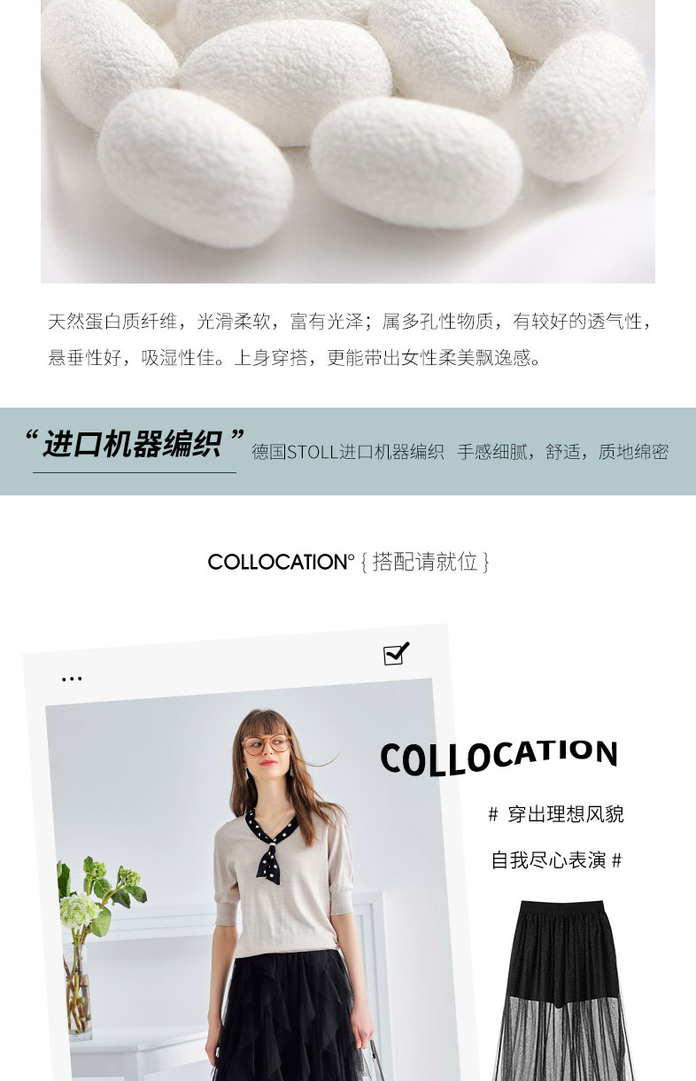 科蒙博卡春夏短袖真丝T恤女系带圆领五分袖桑蚕丝上衣小衫KSP1070H8156