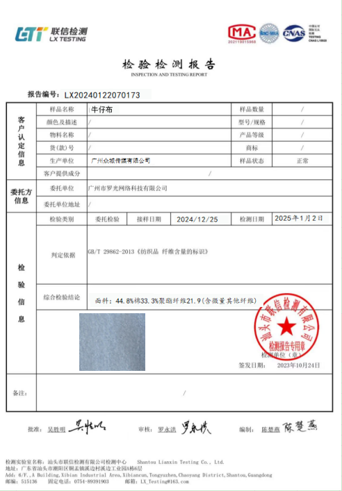面料:44.8%棉33.3%聚酯纤维21.9(含微量其他纤维)