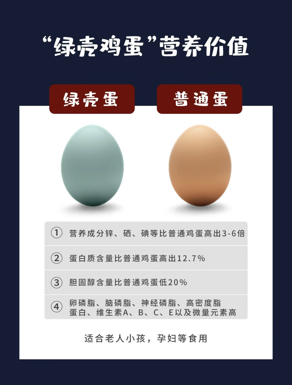 比普通鸡蛋含更多微量元素,营养更丰富;蛋黄比例大,蛋清粘稠,煮熟后特别有蛋味儿😋有机钙含量是普通鸡蛋的6倍,胆固醇低,是鸡蛋的三分之一,不管是大人还是孩子,每天吃一个对身体好!