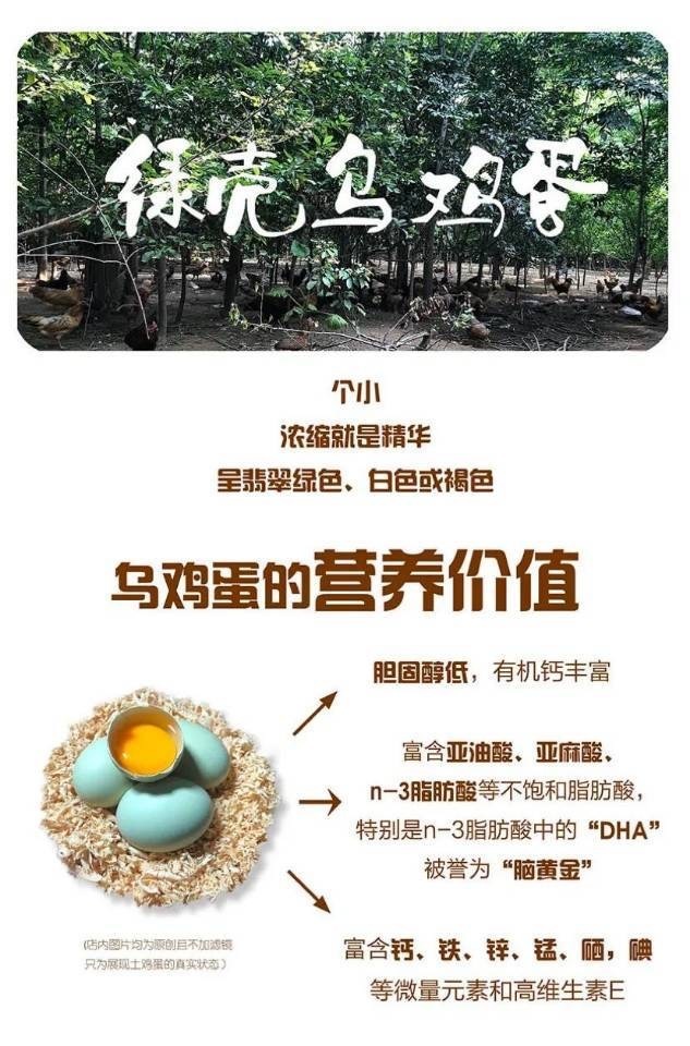 好地养好鸡,好鸡下好蛋!采用自然放养2年的方式让母鸡回归山林,自由觅食吃五谷杂粮(稻谷、麦子、大豆、玉米、薯类)、农家蔬菜长大,喝200米的深井水;放养2年的土乌母鸡,150天的时候开始下蛋,鸡蛋在鸡妈妈肚子里的时间比较长,营养成分积累时间更长,水分含量少,微量元素含量更高,不饱和脂肪酸和磷脂更多一些!