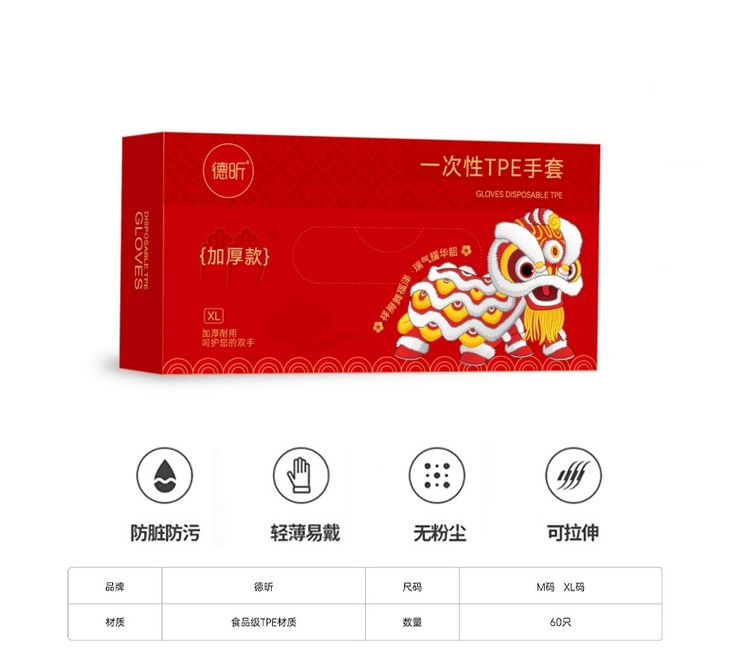 【生活好物丨德昕食品级一次性TPE手套60个/盒*6】选用TPE新型高分子材料,结实耐用牢固不易破,宽松设计不挑手型,独具匠心的抽取式盒装设计,拿取方便适用多种场合
