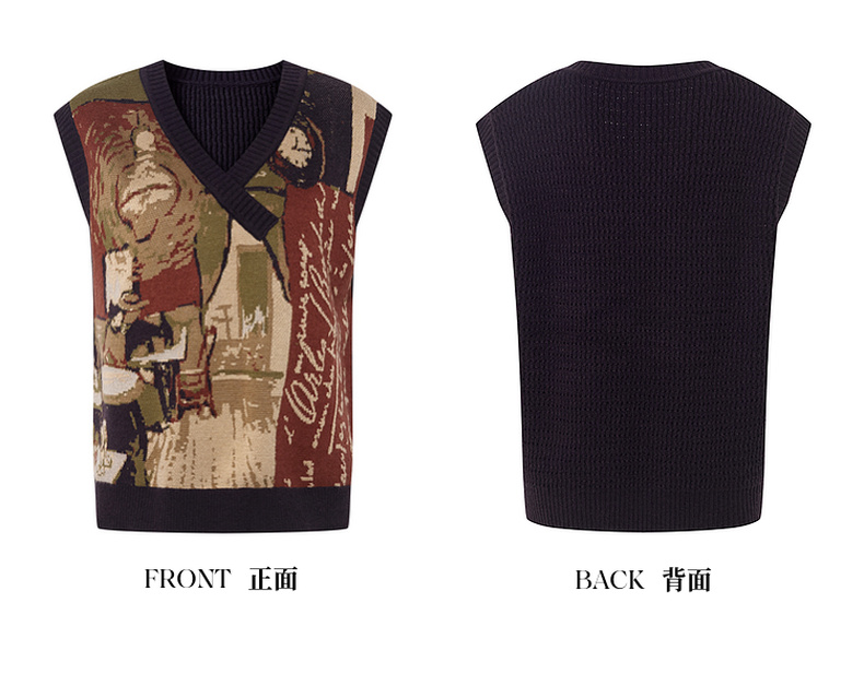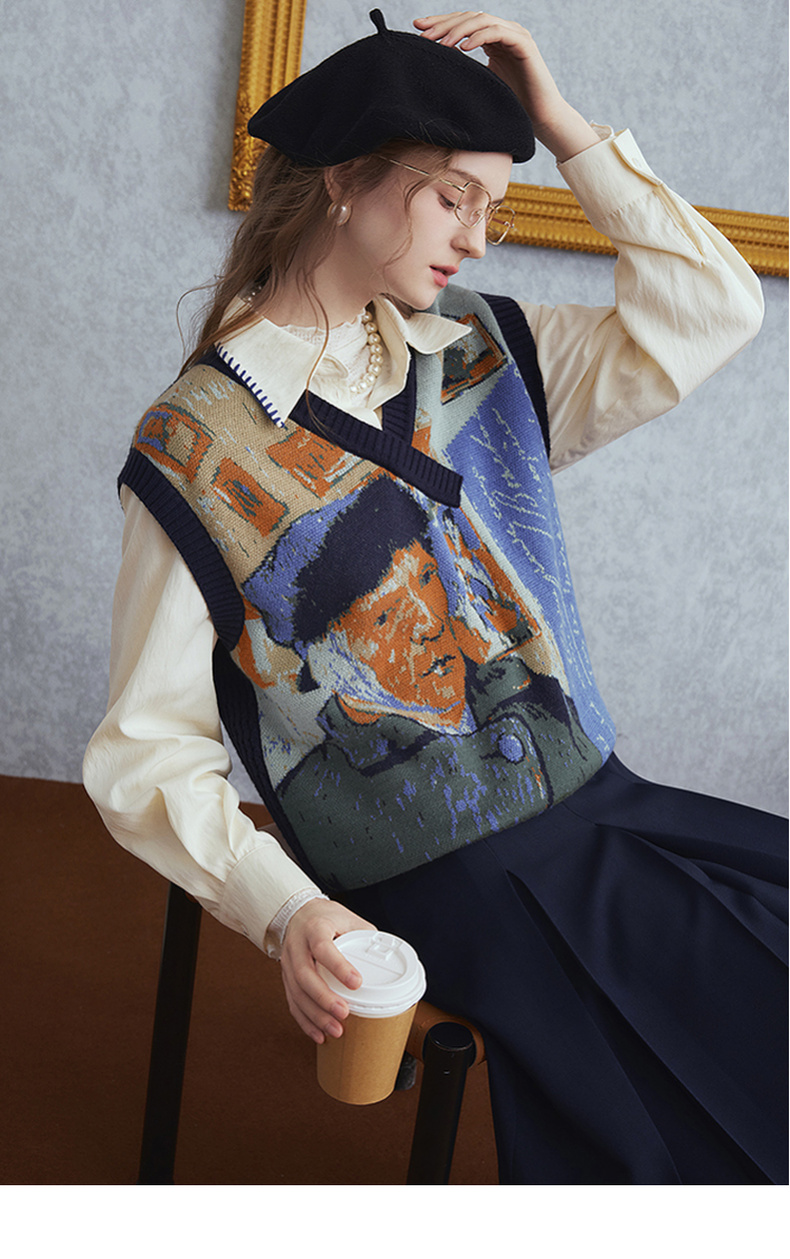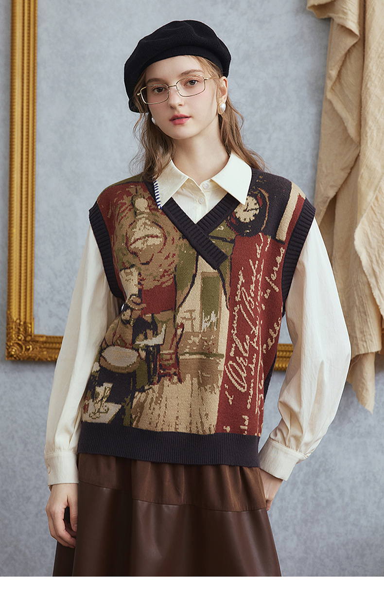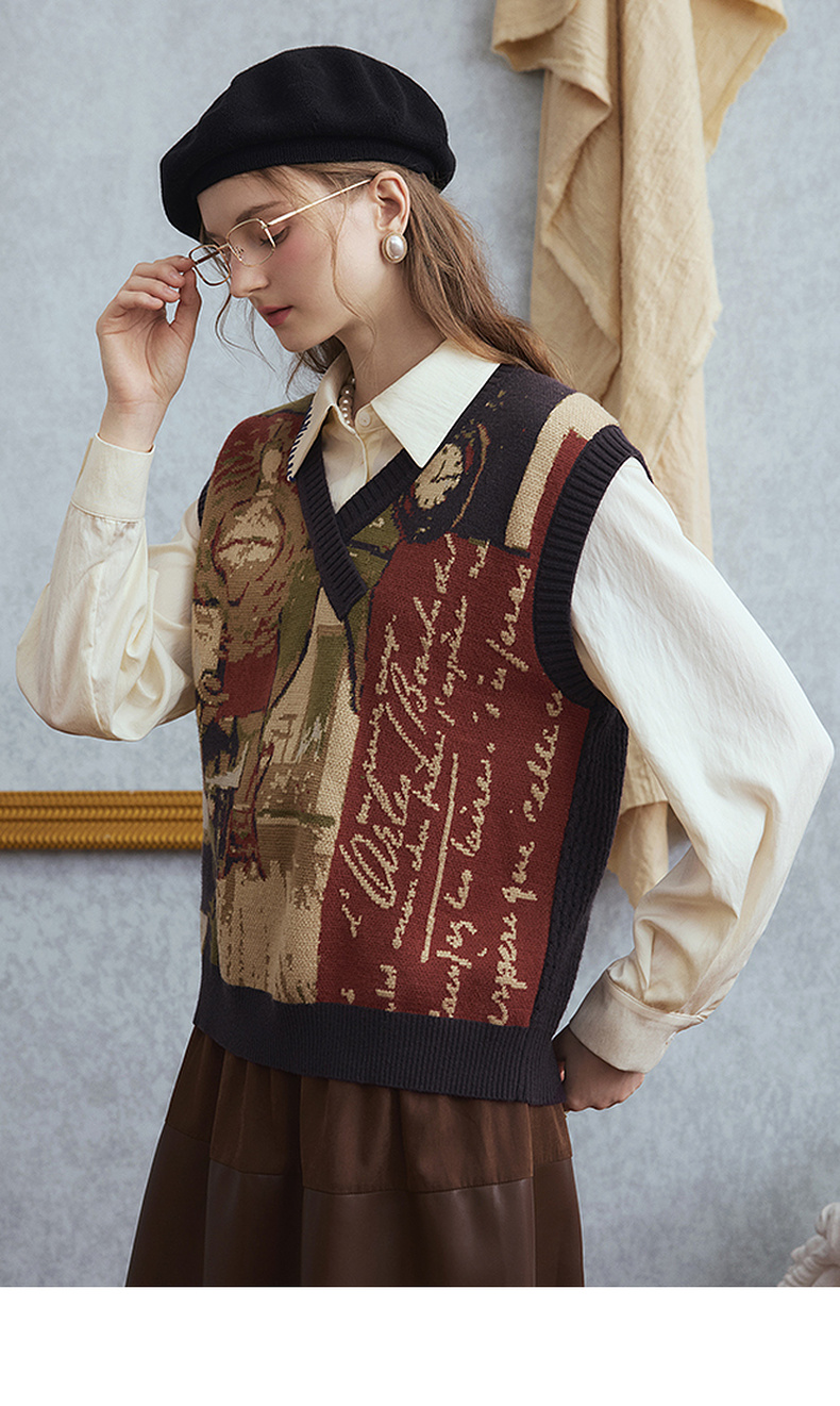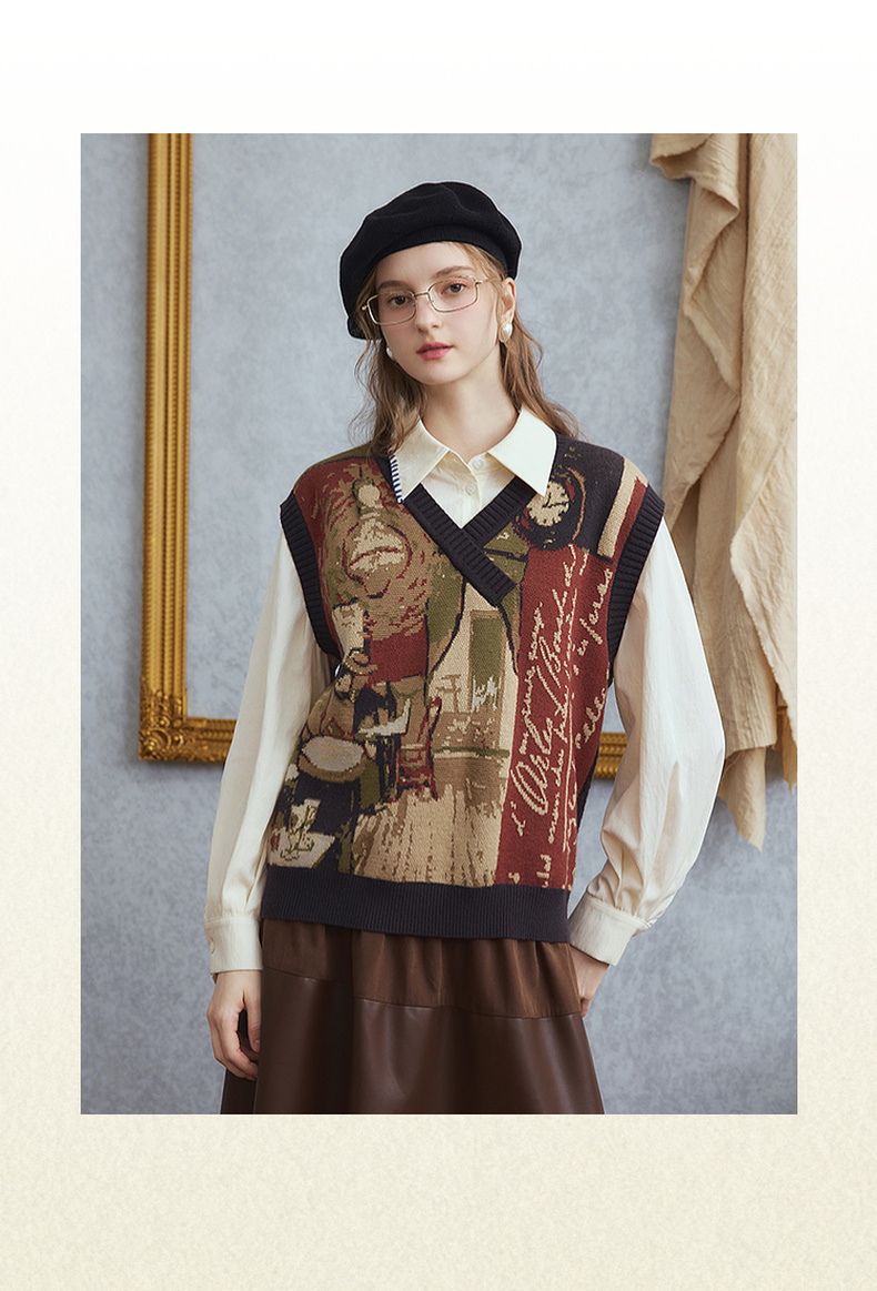 两三事梵高文艺时光机2025秋新款复古提花v领针织马甲女宽松马夹