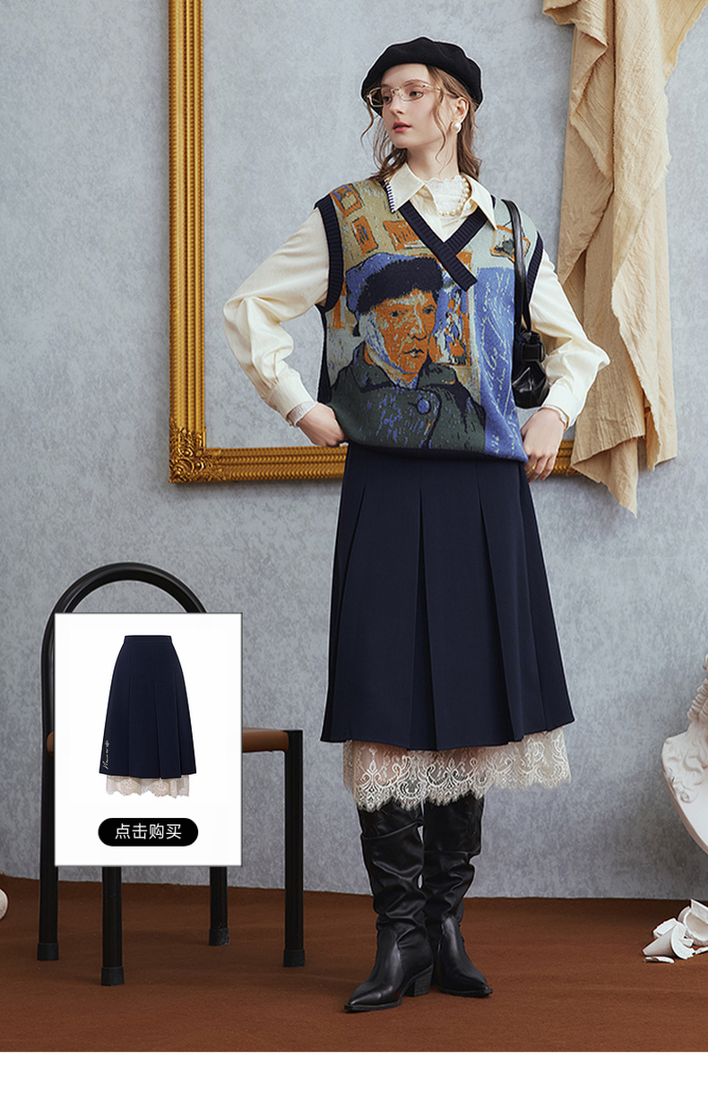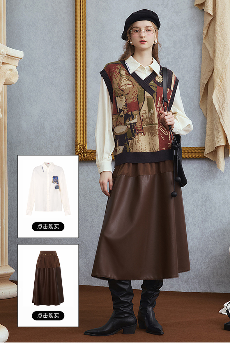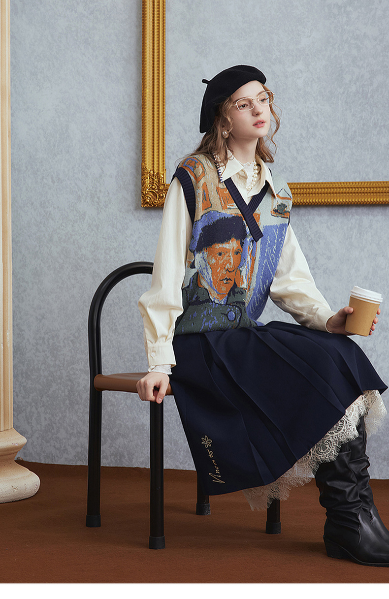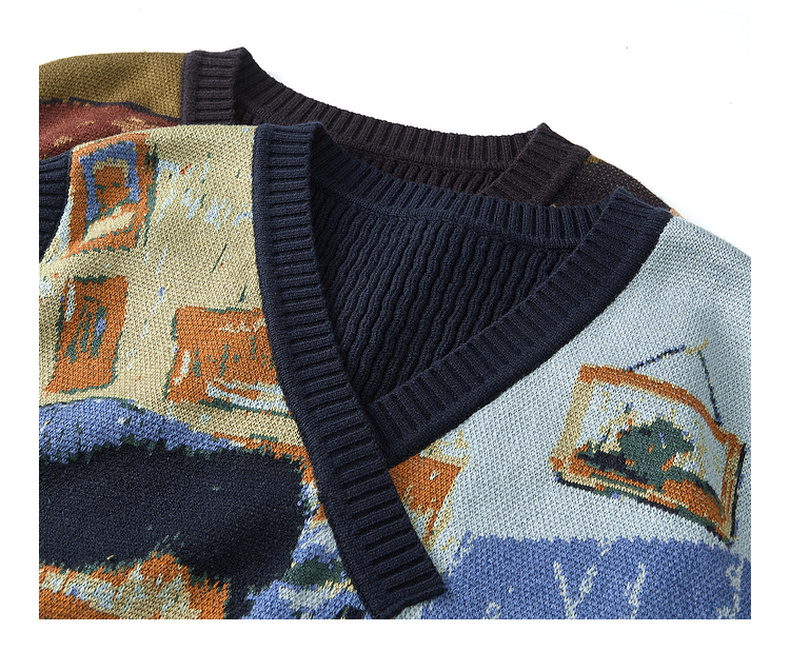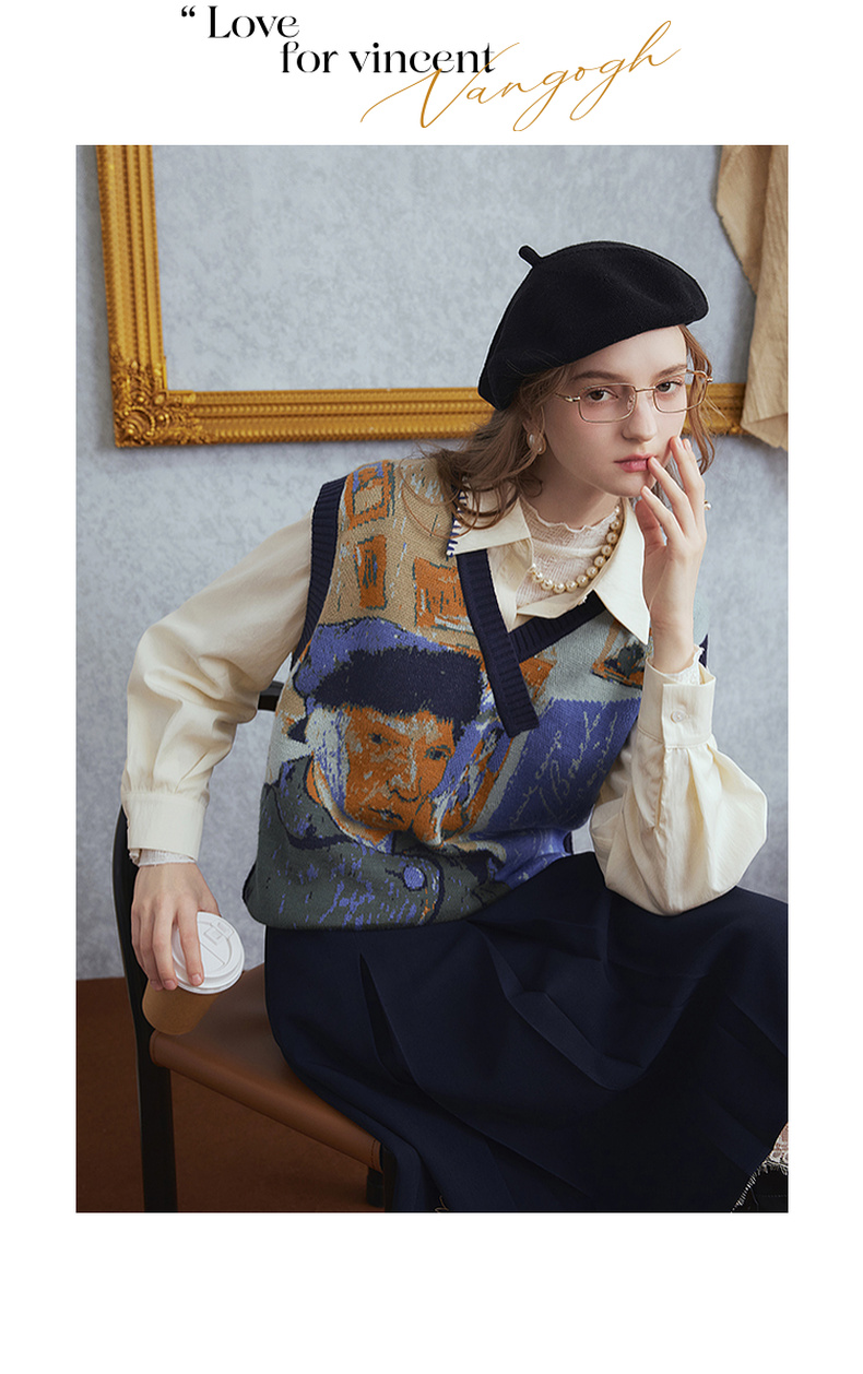 两三事梵高文艺时光机2025秋新款复古提花v领针织马甲女宽松马夹