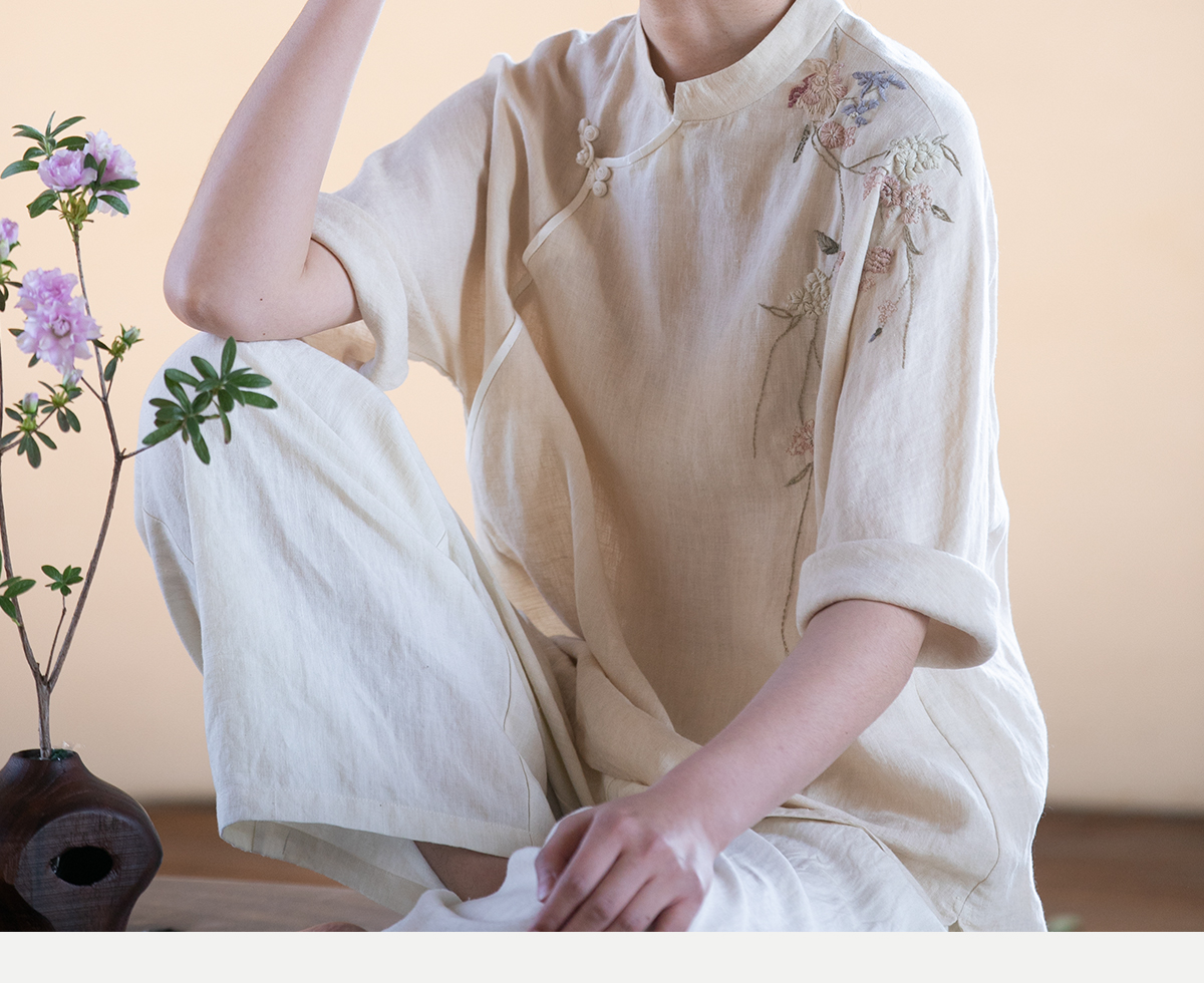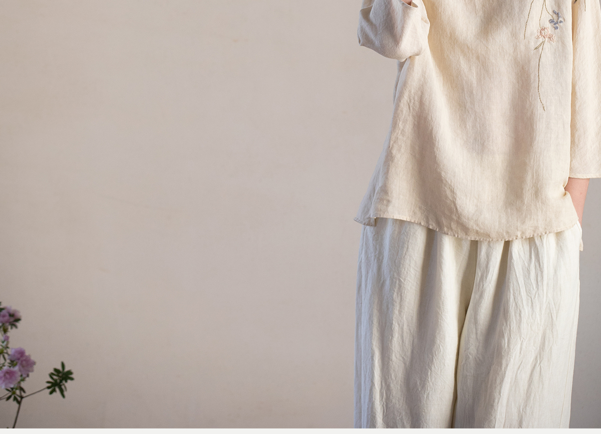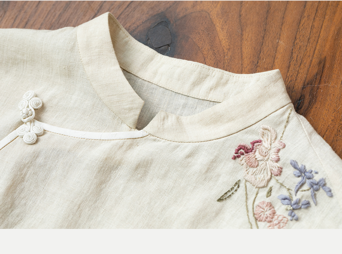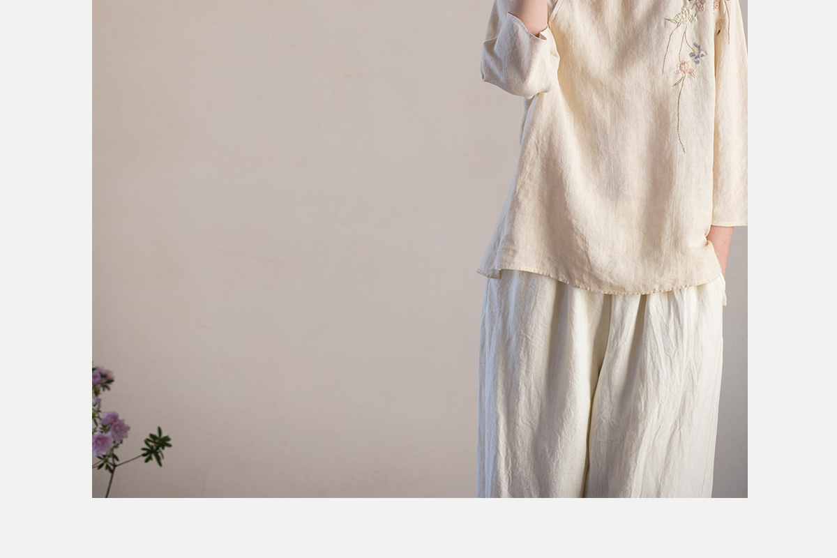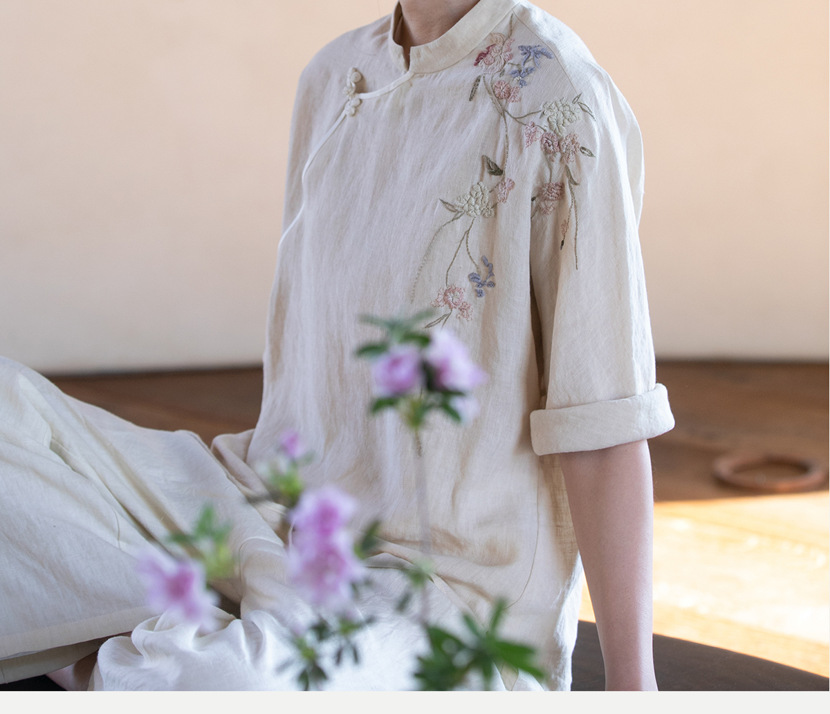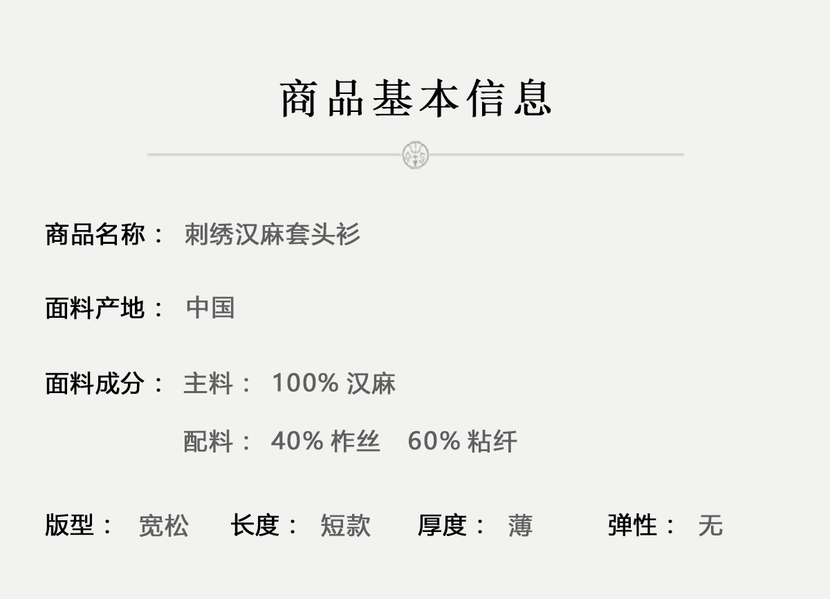 牧衣游原创 手工刺绣汉麻套头衫斜襟圆领七分袖中式上衣 初八弦