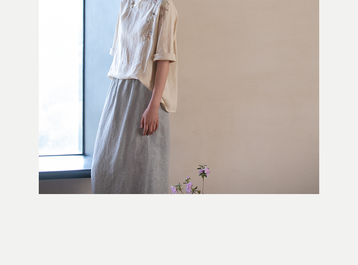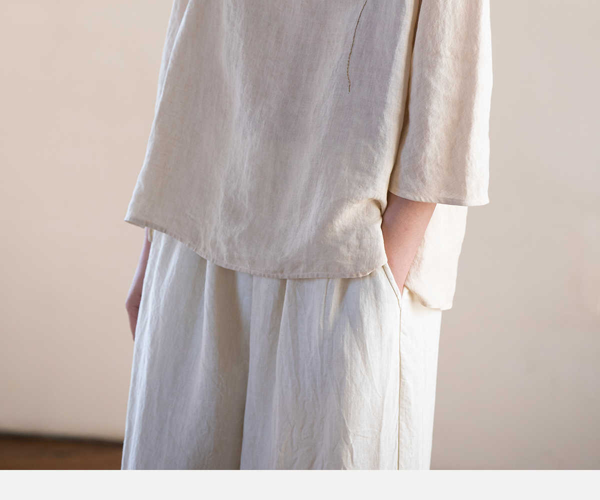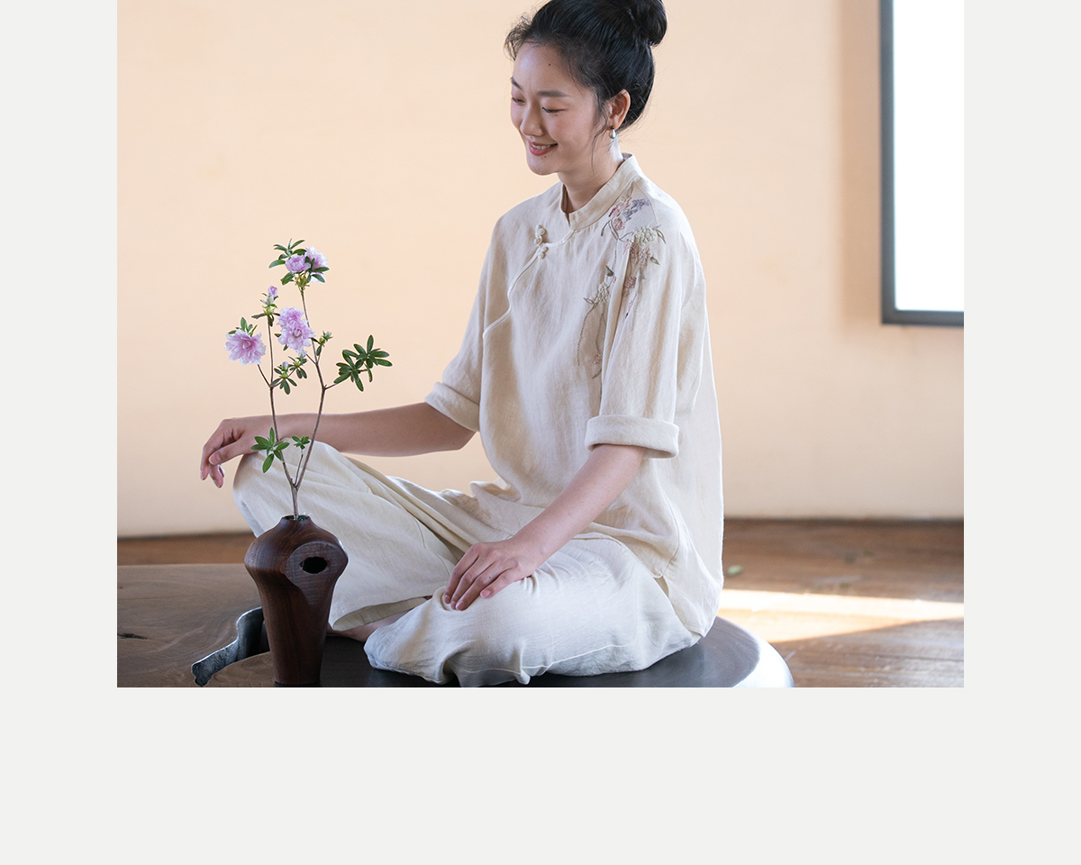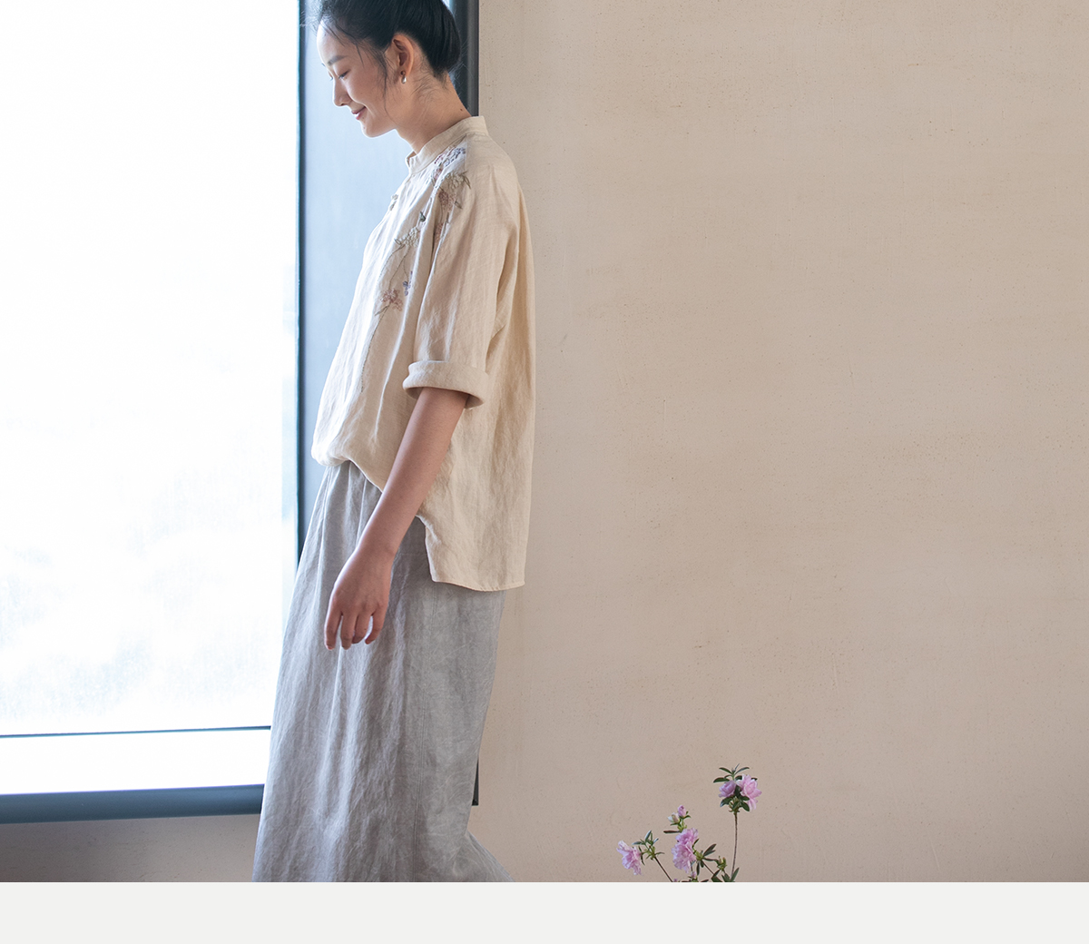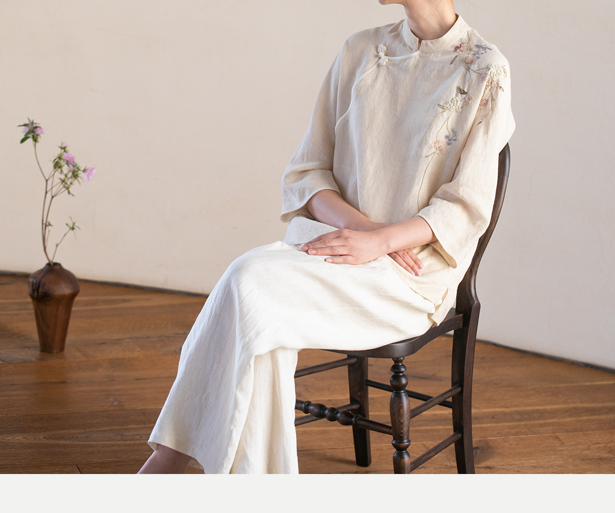 牧衣游原创 手工刺绣汉麻套头衫斜襟圆领七分袖中式上衣 初八弦