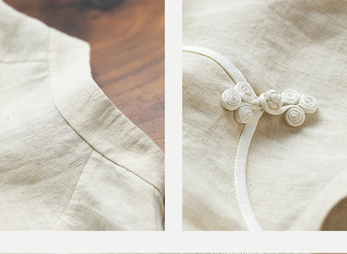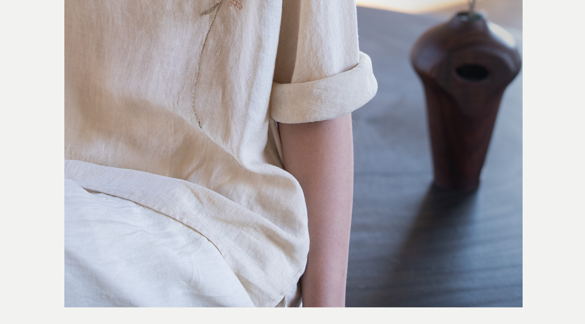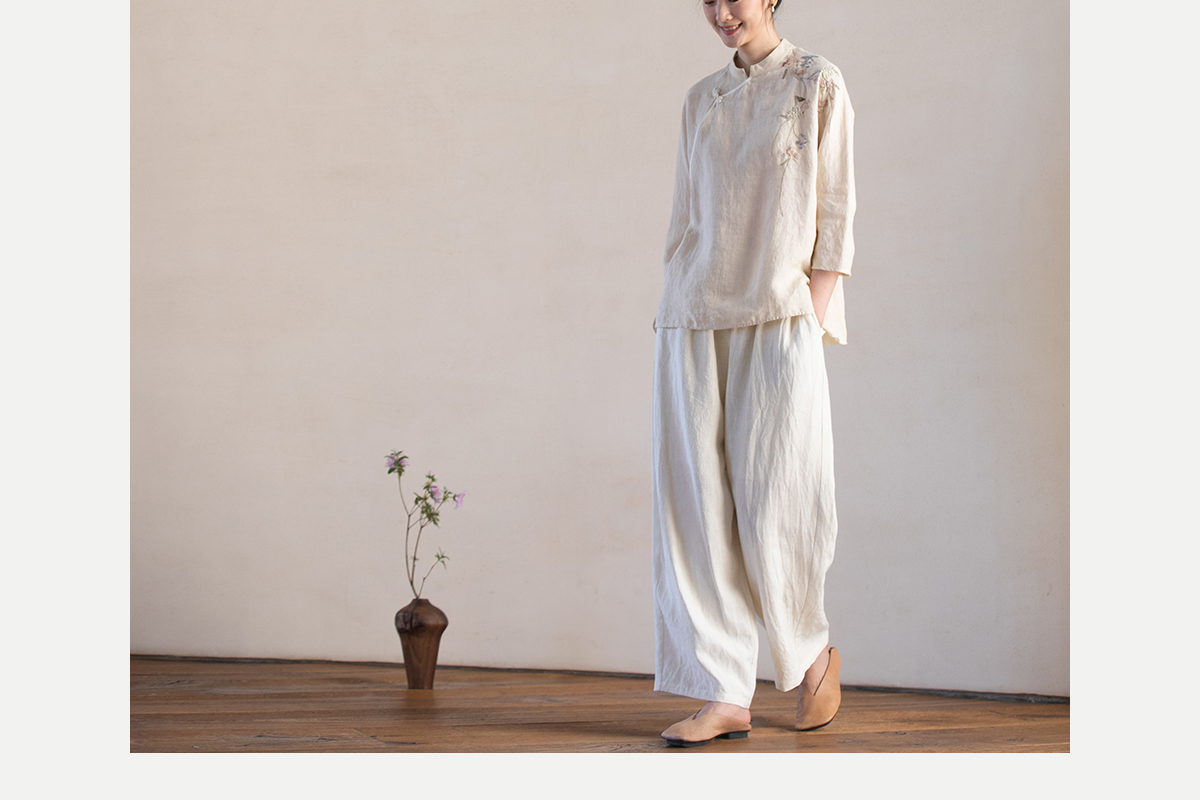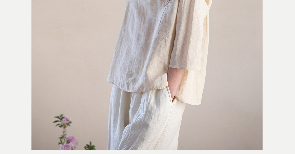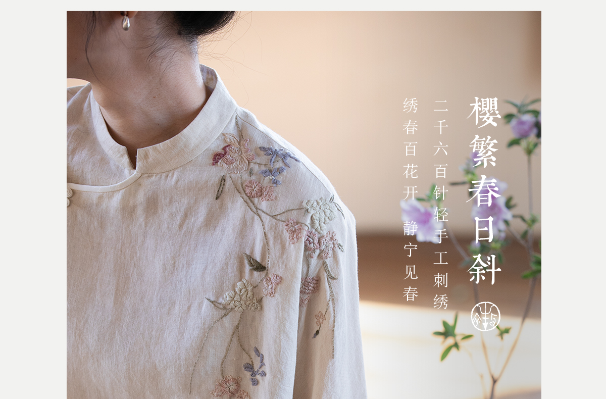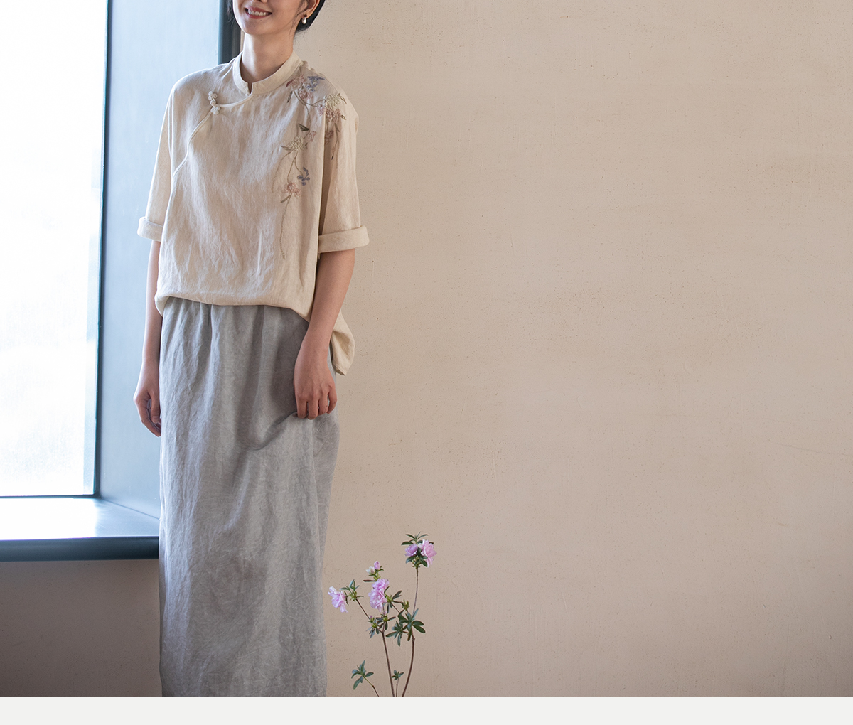 牧衣游原创 手工刺绣汉麻套头衫斜襟圆领七分袖中式上衣 初八弦