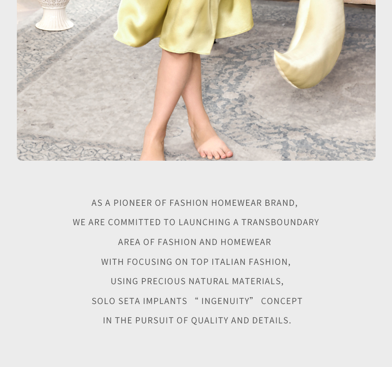 - soloseta专注于真丝织物,灵感源自意大利语,中文含义为“只做真丝”的意思。让睡衣变时尚,居家和外出瞬间切换,使其更具有出街,度假,参加宴会等功能。