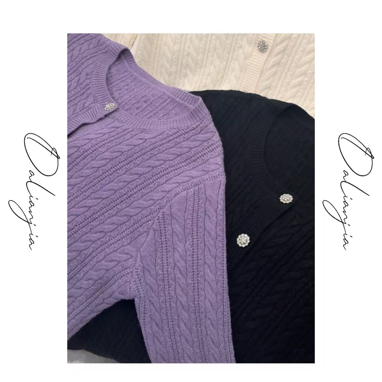 佳佳【紫藤花】麻花开衫百搭圆领针织外套长袖时尚紫色显瘦纯色