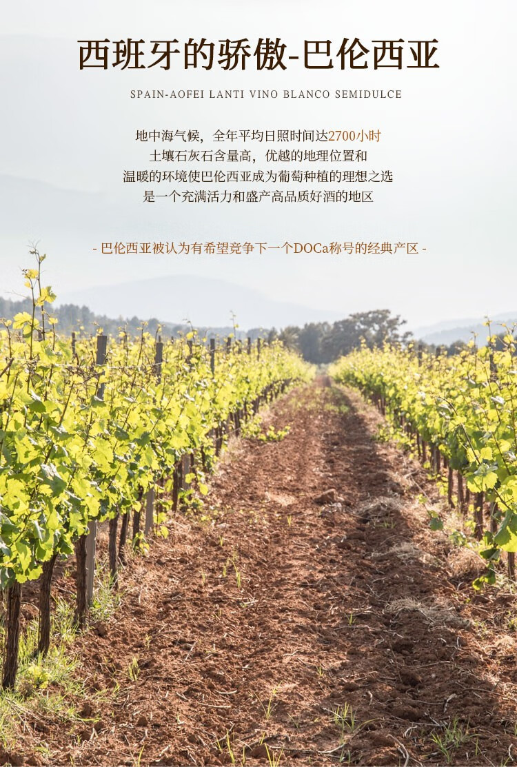 酒体呈现高贵优雅的金黄色泽,高矿物质的种植岩土赋予其丰富的口感