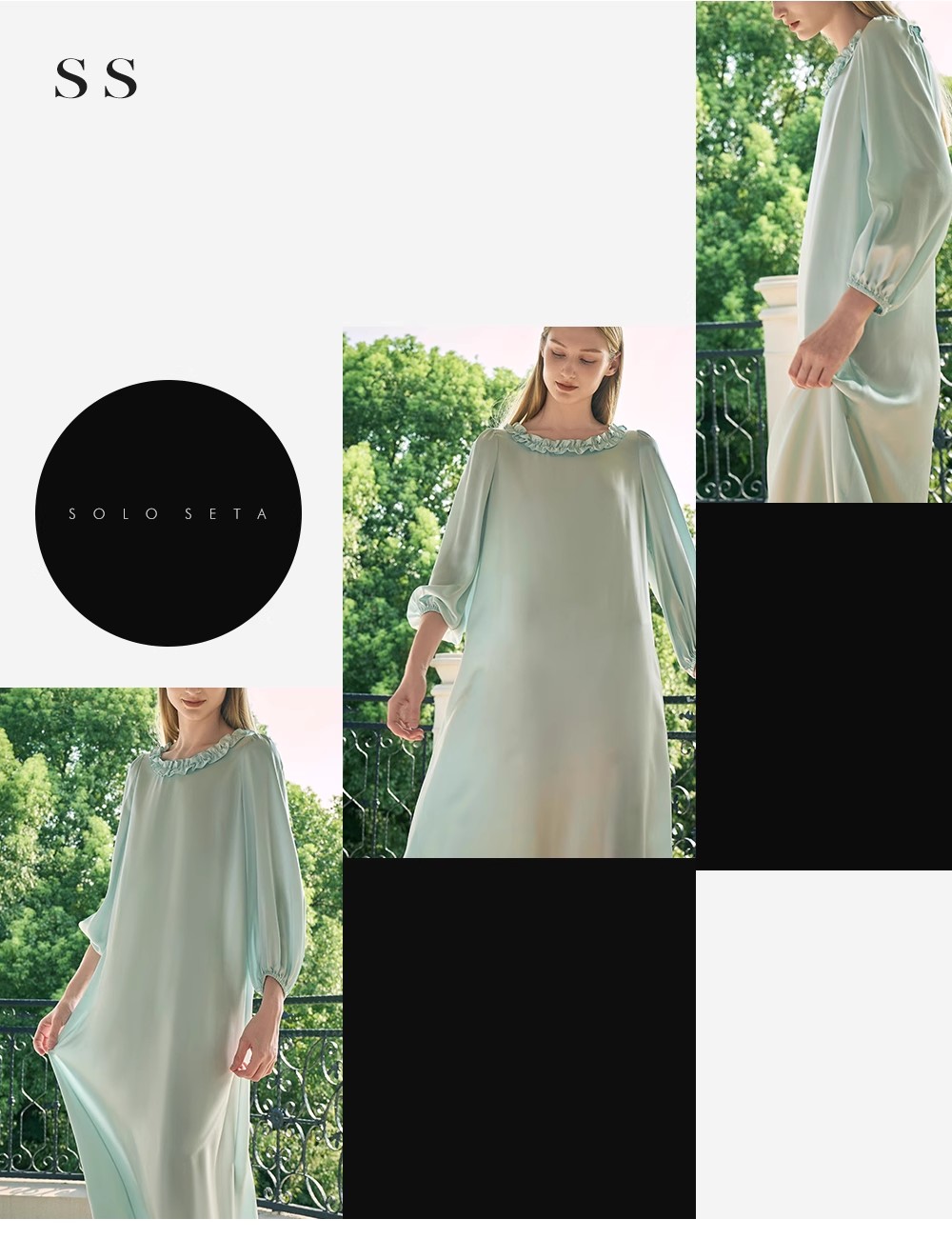 - soloseta专注于真丝织物,灵感源自意大利语,中文含义为“只做真丝”的意思。让睡衣变时尚,居家和外出瞬间切换,使其更具有出街,度假,参加宴会等功能。