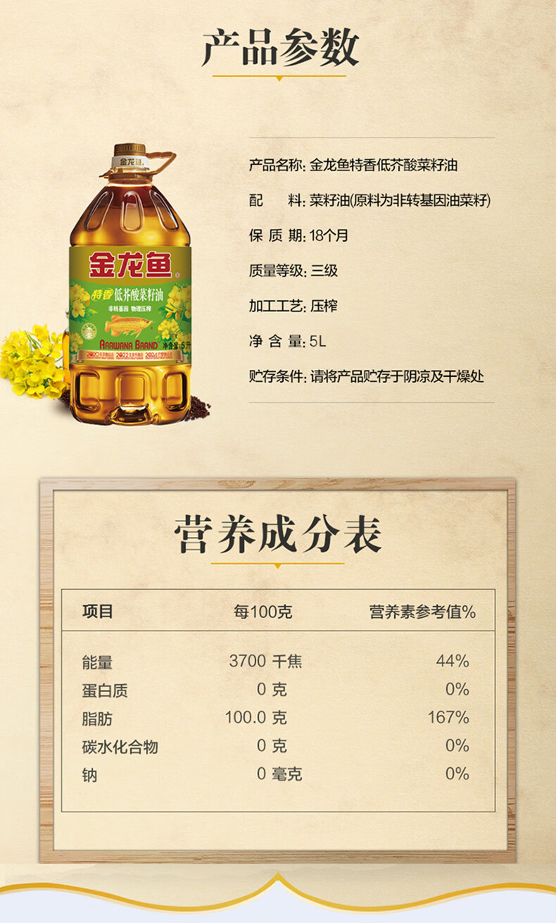 【仅供集采】金龙鱼 特香低芥酸菜籽油5L*4桶 箱装