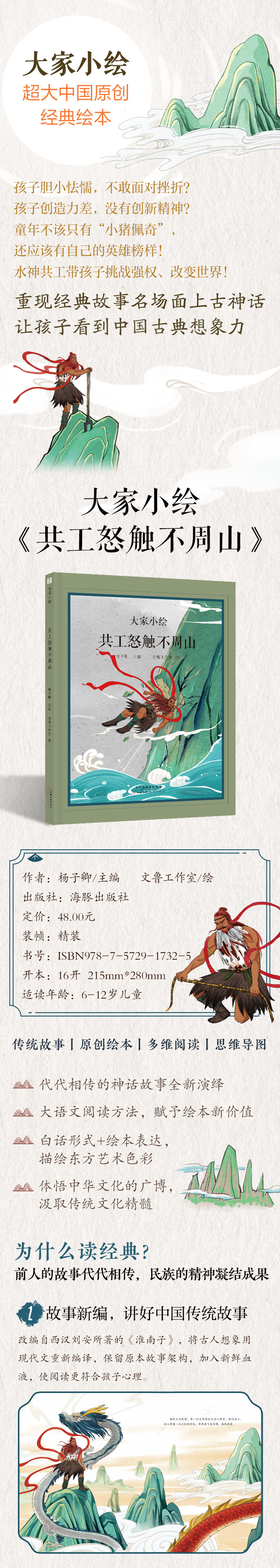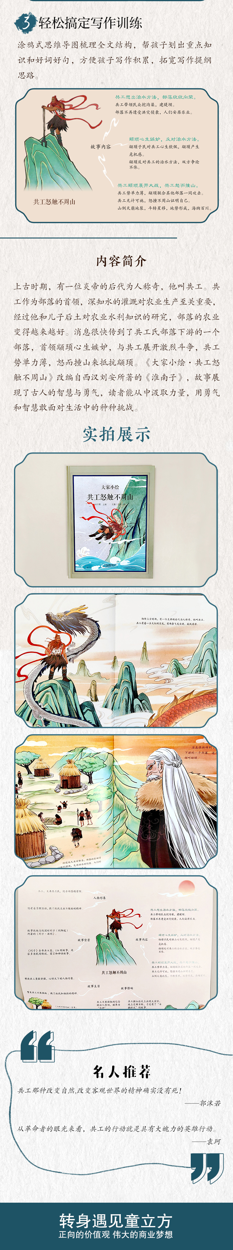 上古时期,有一位炎帝的后代为人称奇,他叫共工。共工作为部落的首领,深知水的灌溉对农业生产至关重要,经过他和儿子后土对农业水利知识的研究,部落的农业变得越来越好。消息很快传到了共工氏部落的下游的一个部落,首领颛顼心生嫉妒,与共工展开激烈斗争,共工势单力薄,怒而撞山来抵抗颛顼。《大家小绘·共工怒触不周山》改编自西汉刘安所著的《淮南子》,故事展现了古人的智慧与勇气,读者能从中汲取力量,用勇气和智慧敢面对生活中的种种挑战。