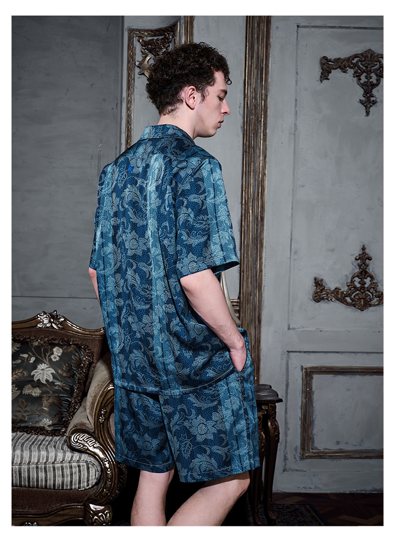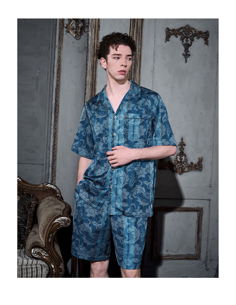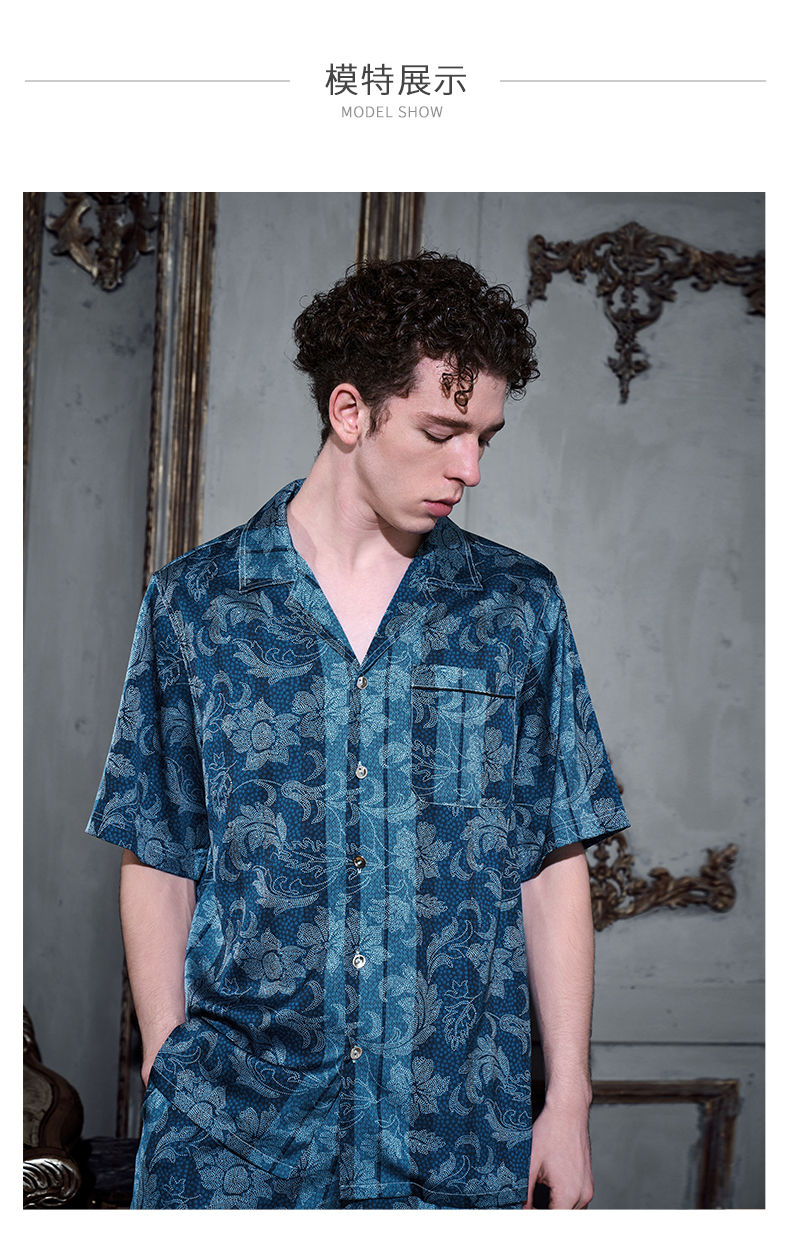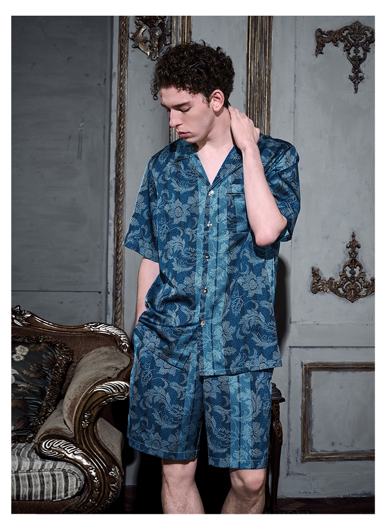 22姆米男士真丝短袖短裤睡衣套装蓝色印花桑蚕丝家居服