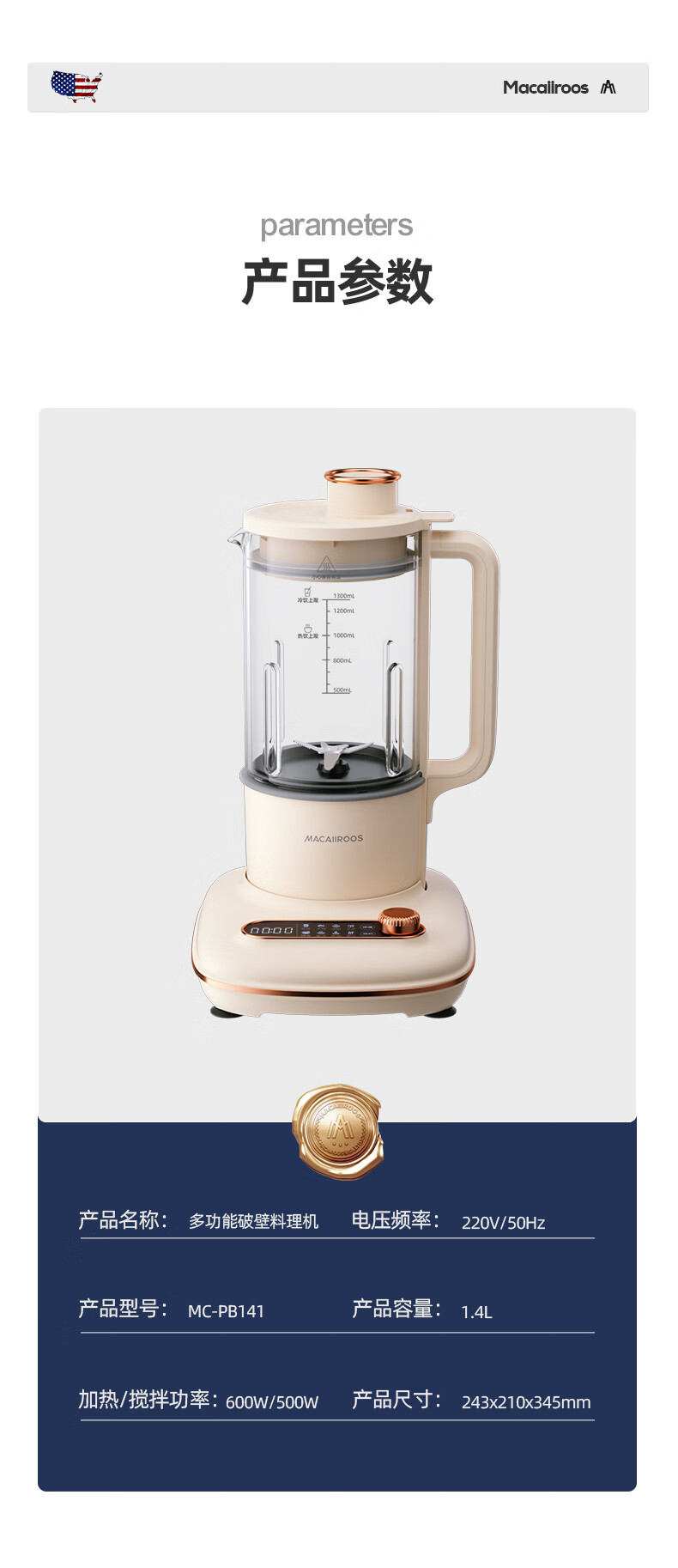 迈卡罗 豆浆机 静音破壁料理机MC-PB141