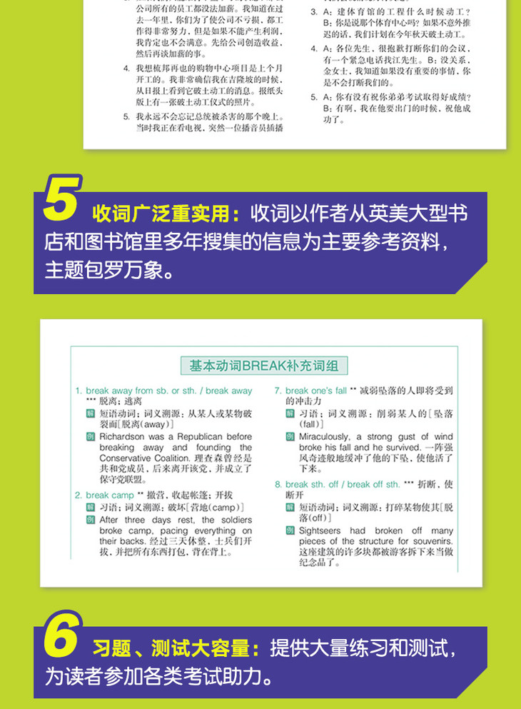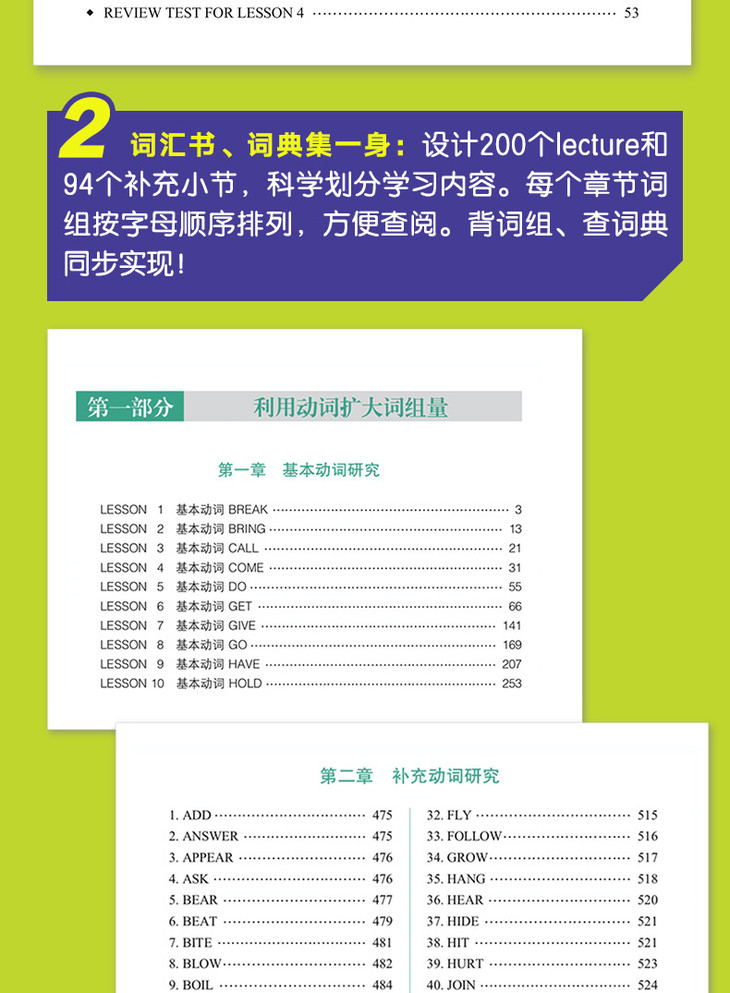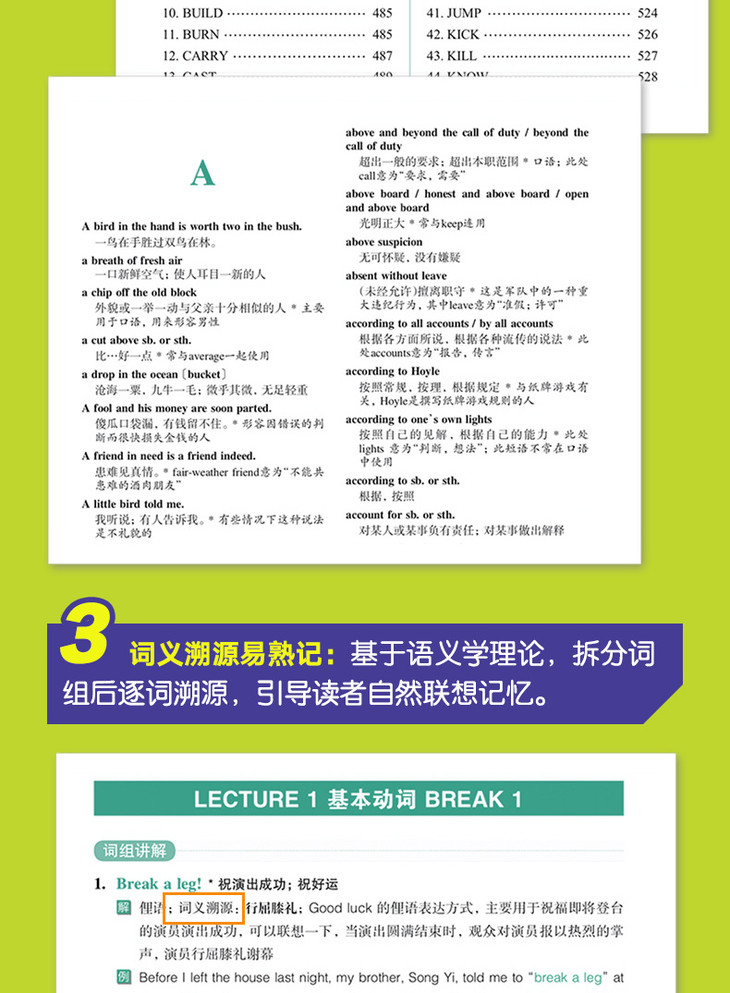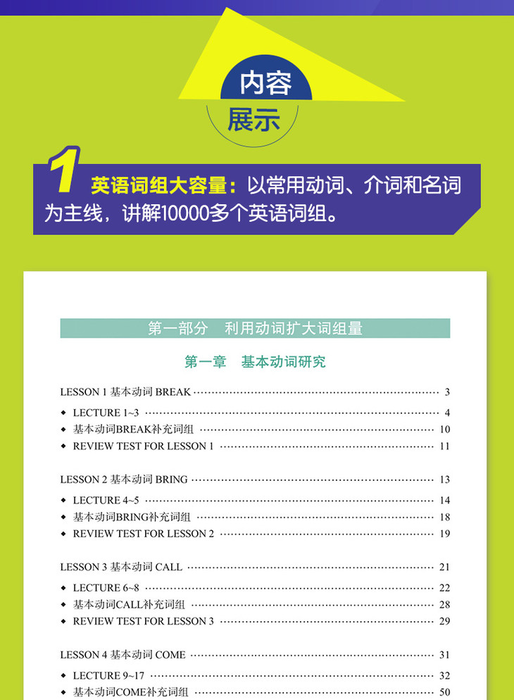 词汇书、词典集一身:设计200个lecture和94个补充小节,科学划分学习内容。每个章节词组按字母顺序排列,方便查阅。背词组、查词典同步实现!