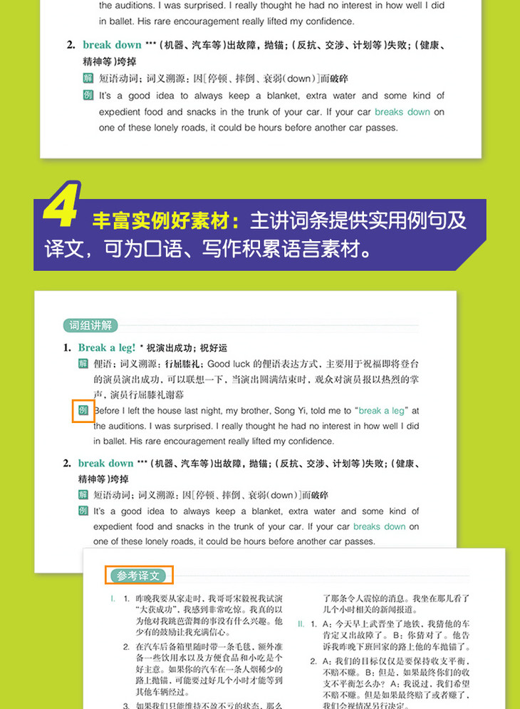丰富实例好素材:主讲词条提供实用例句及译文,可为口语、写作积累语言素材。