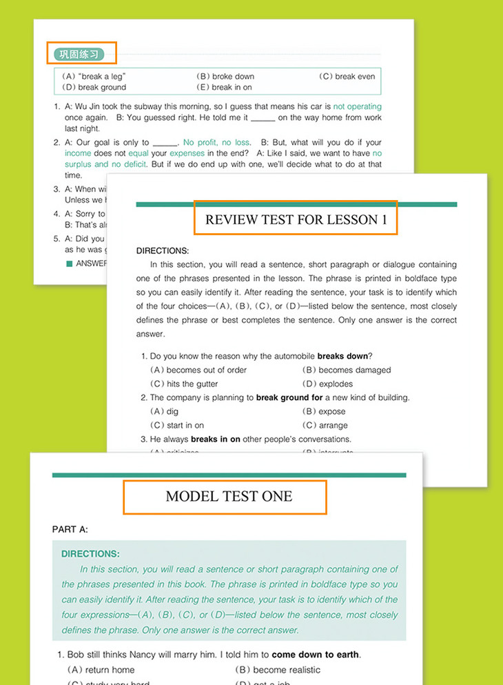 200个主讲Lecture设计了1000个完句填空练习,题目中特意编入主讲词组的近义词和词典释义,有助于进一步加深对词组的理解。Review Test和Model Test提供大量练习,检验阶段性学习效果,可为读者参加TOEFL、GRE、四六级、考研英语、外企招聘笔试等各类考试助力!