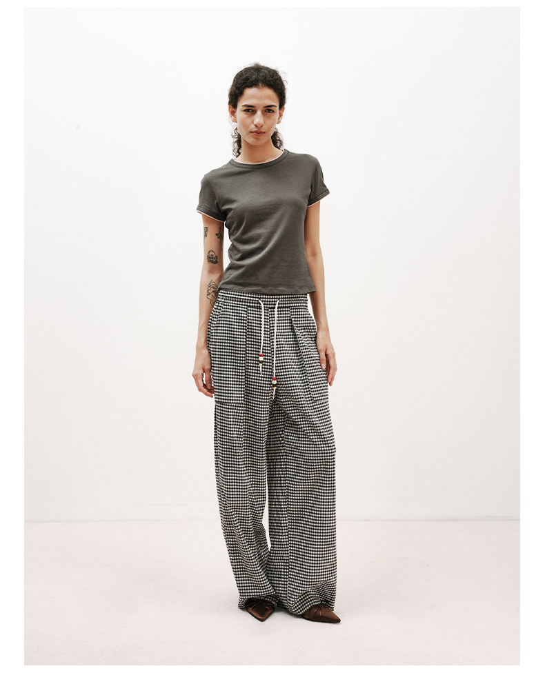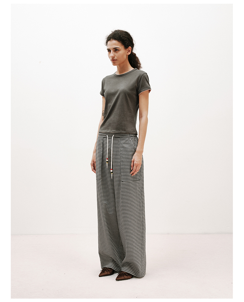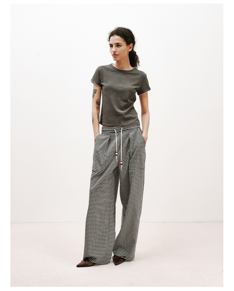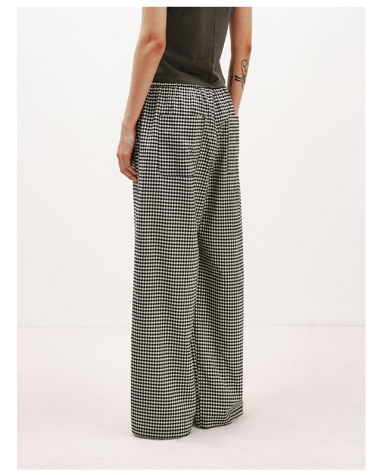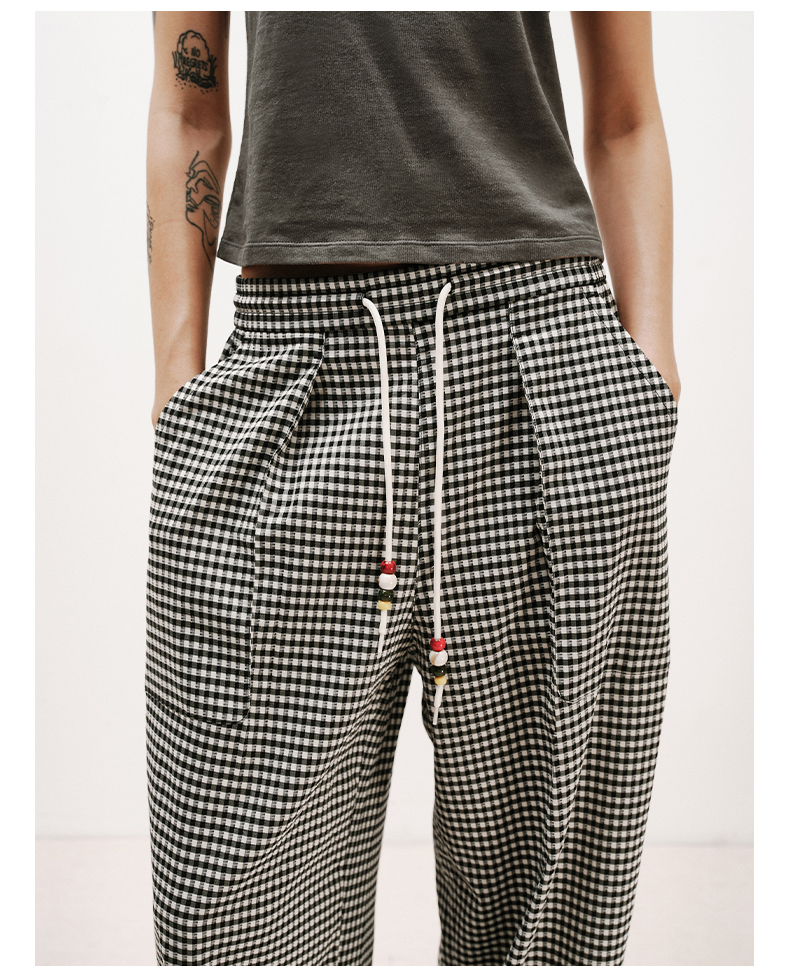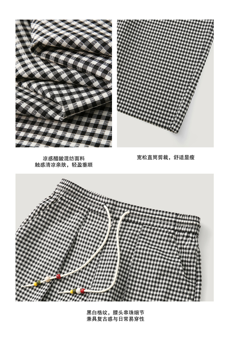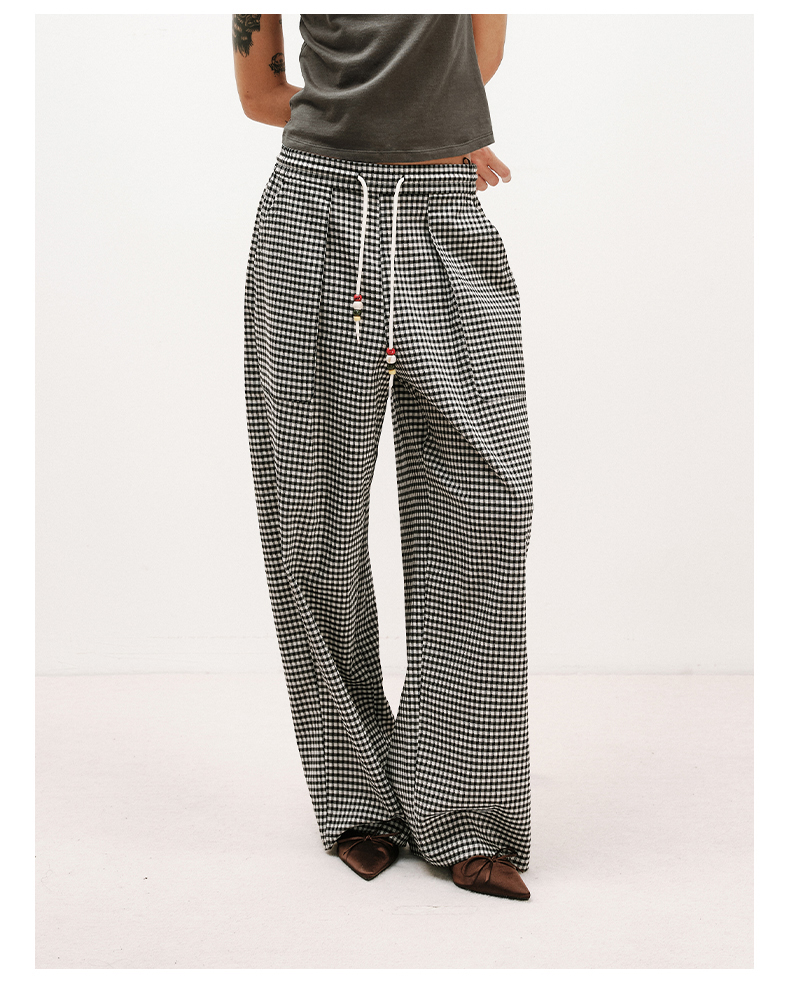 NUTH轻薄复古黑白格纹宽松抽绳直筒休闲裤女夏季