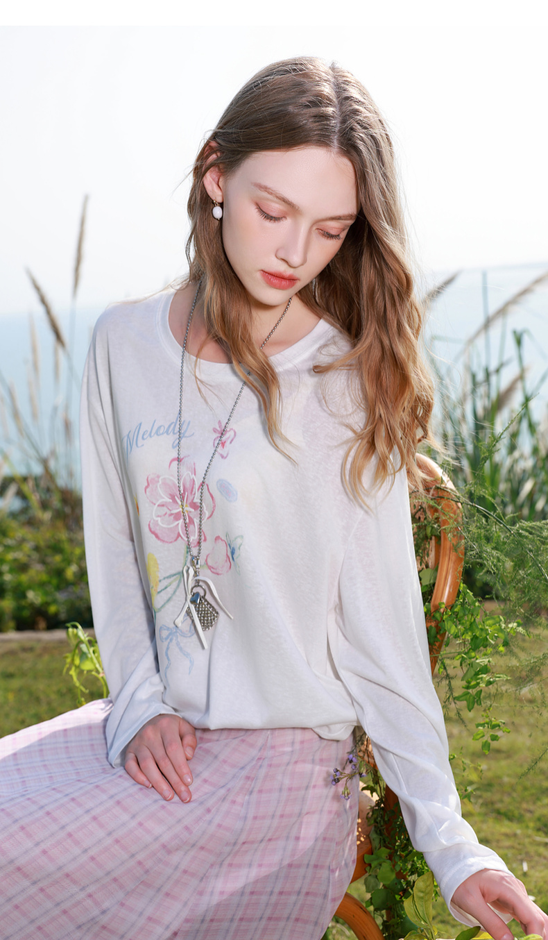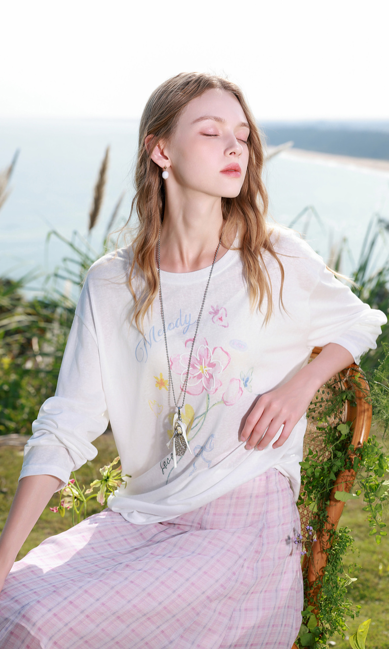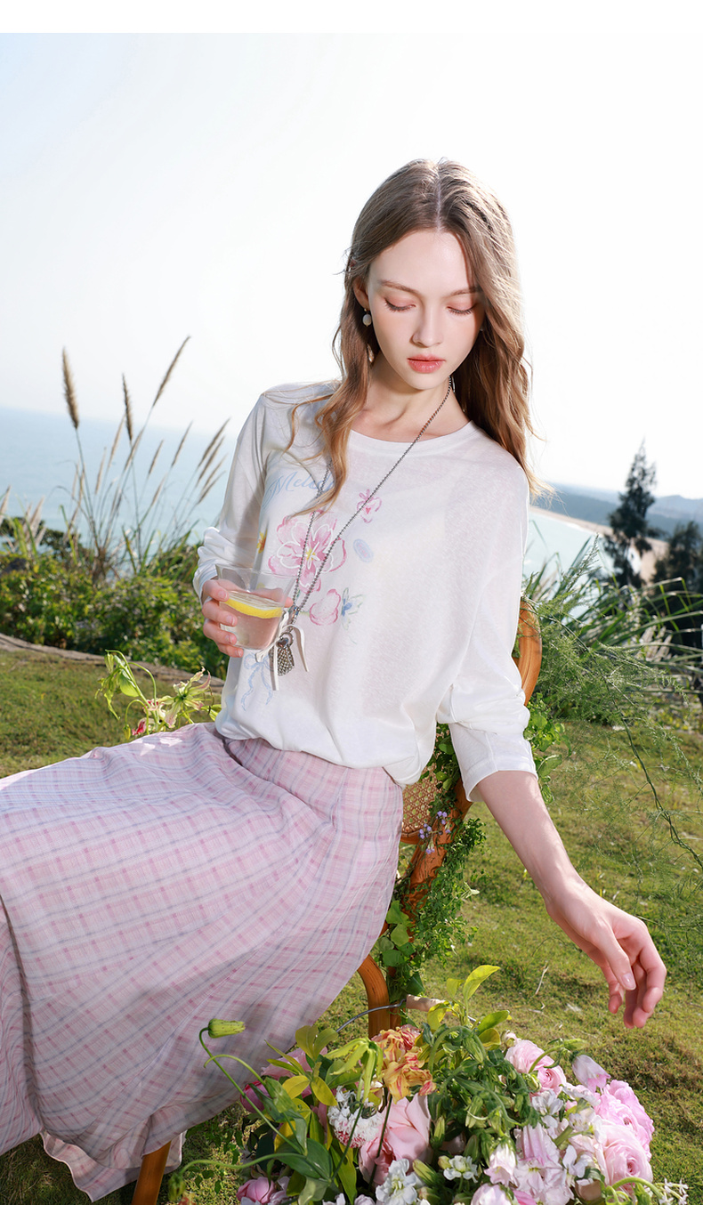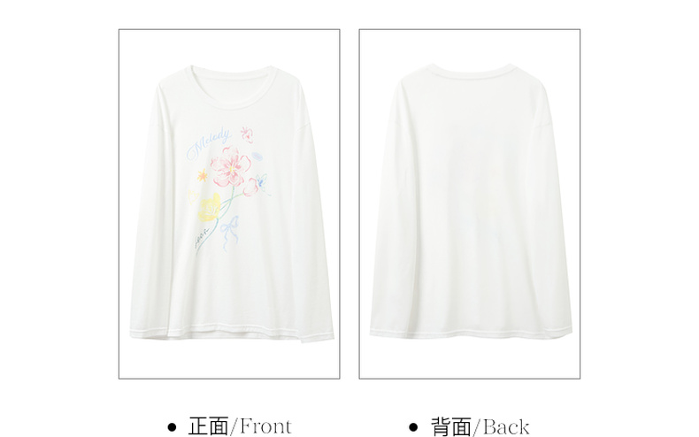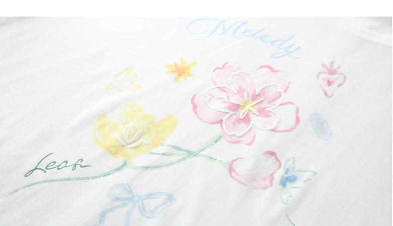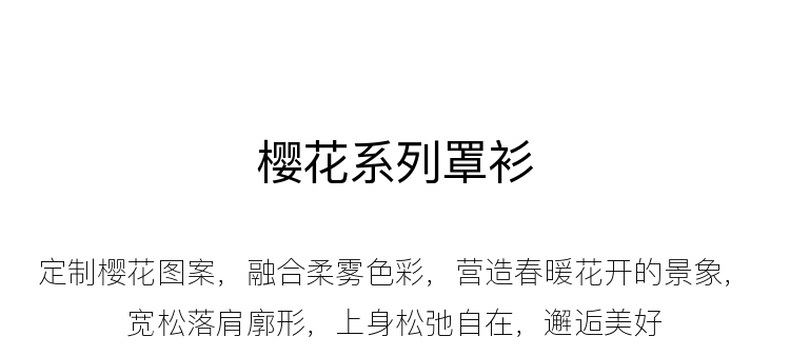 【莱赛尔】三彩2026春季新款樱花T恤圆领宽松落肩袖罩衫休闲M