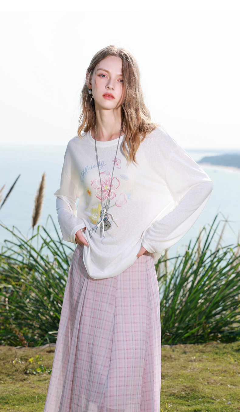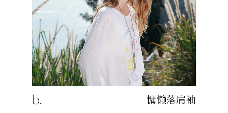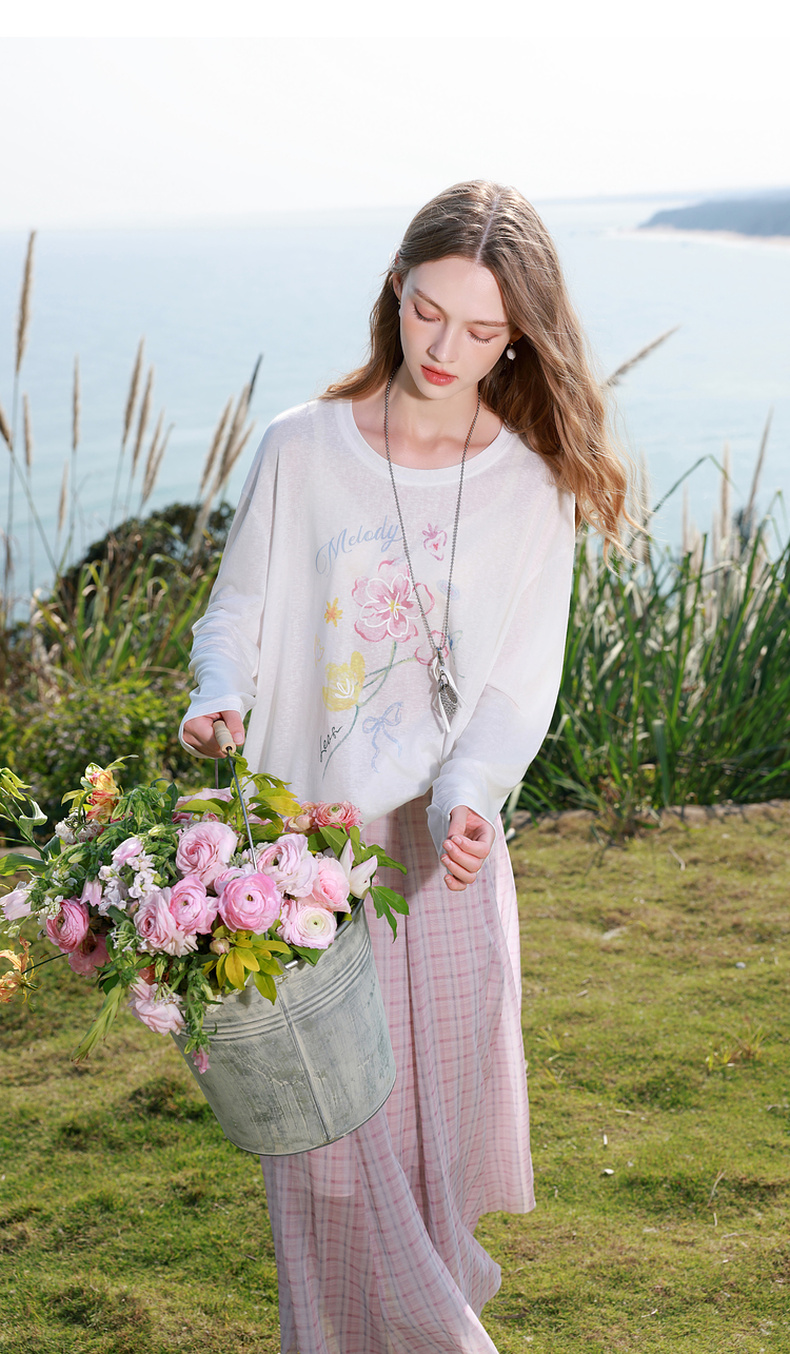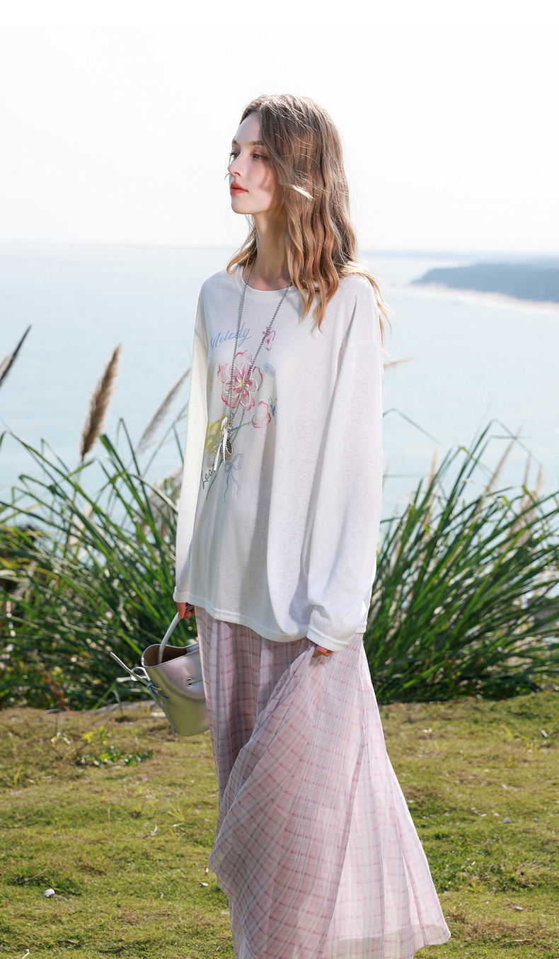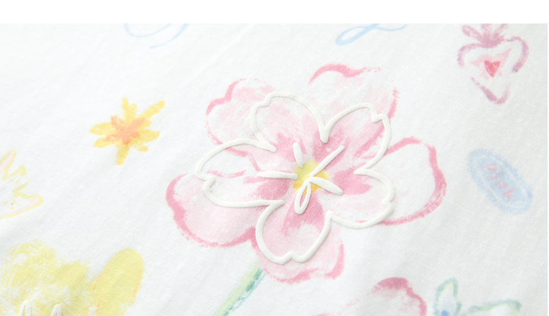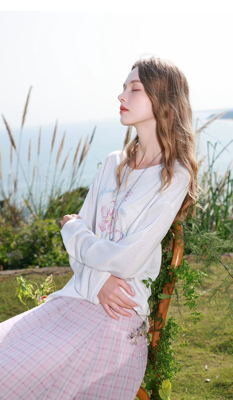 【莱赛尔】三彩2026春季新款樱花T恤圆领宽松落肩袖罩衫休闲M
