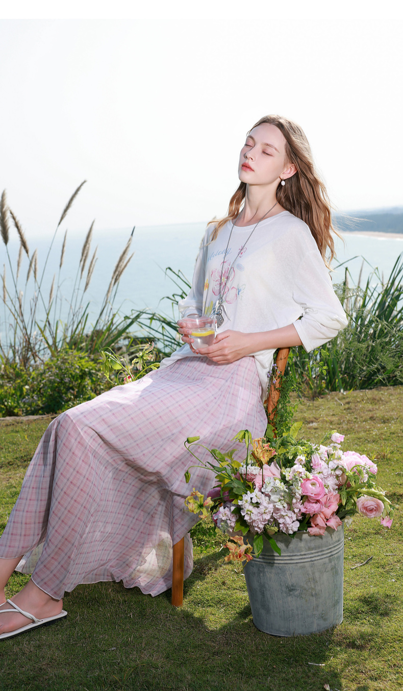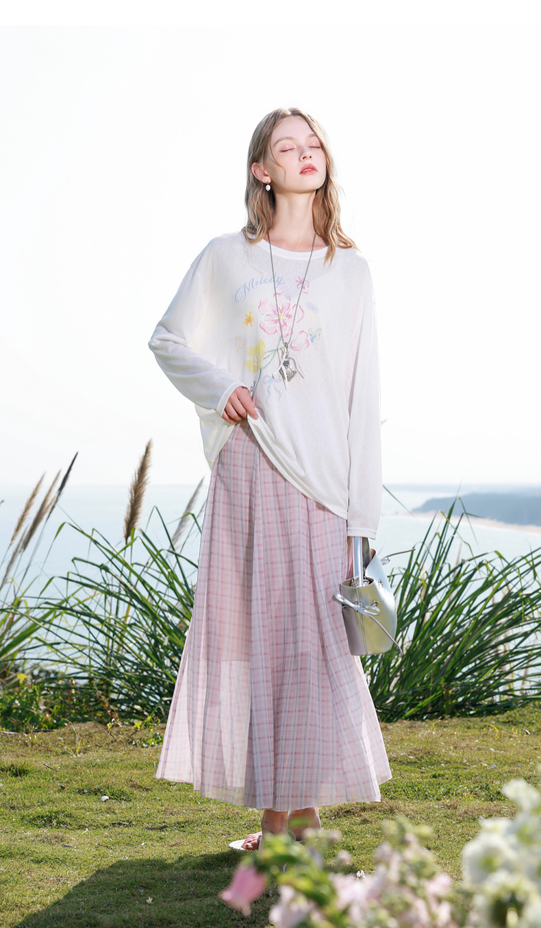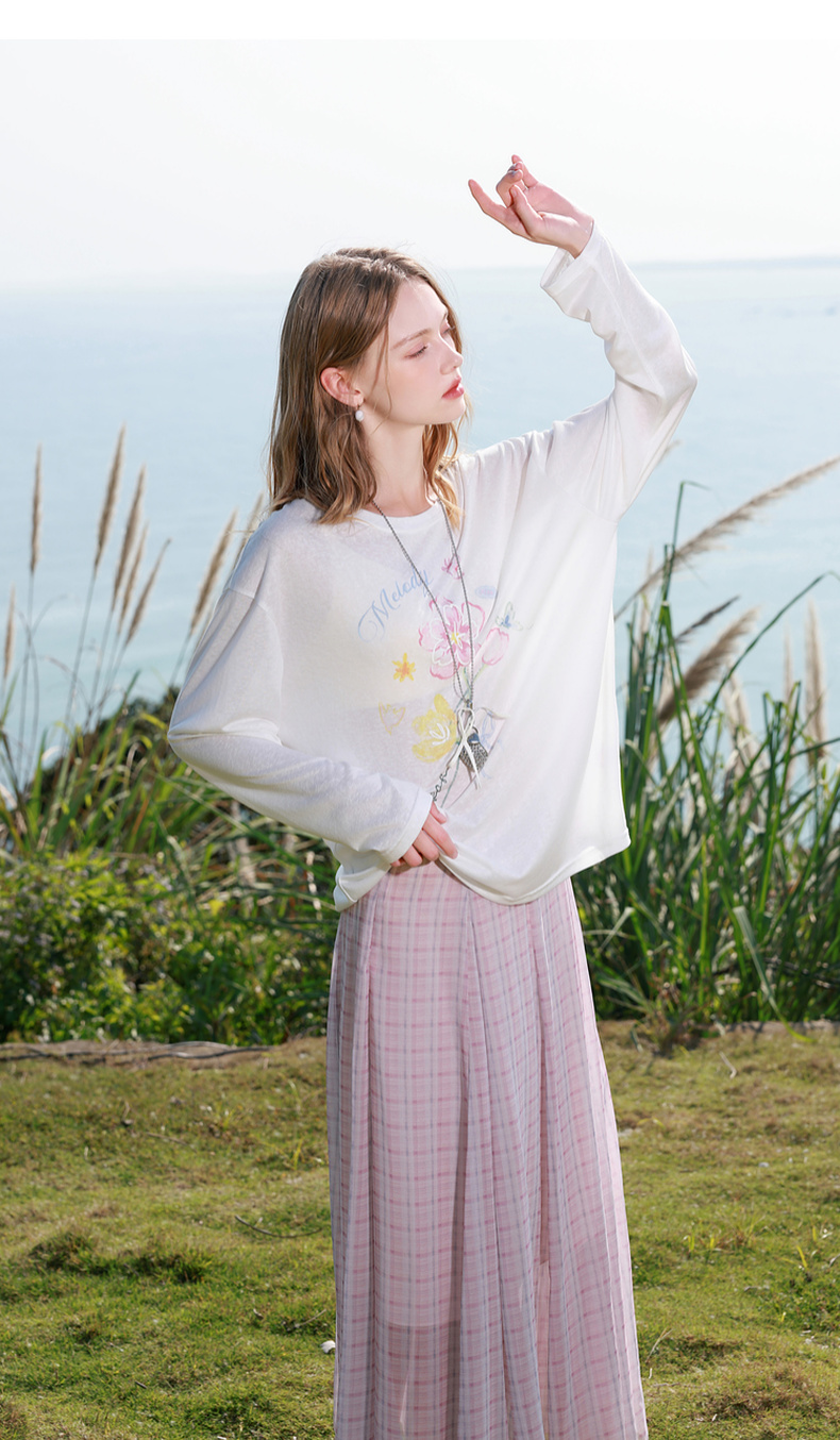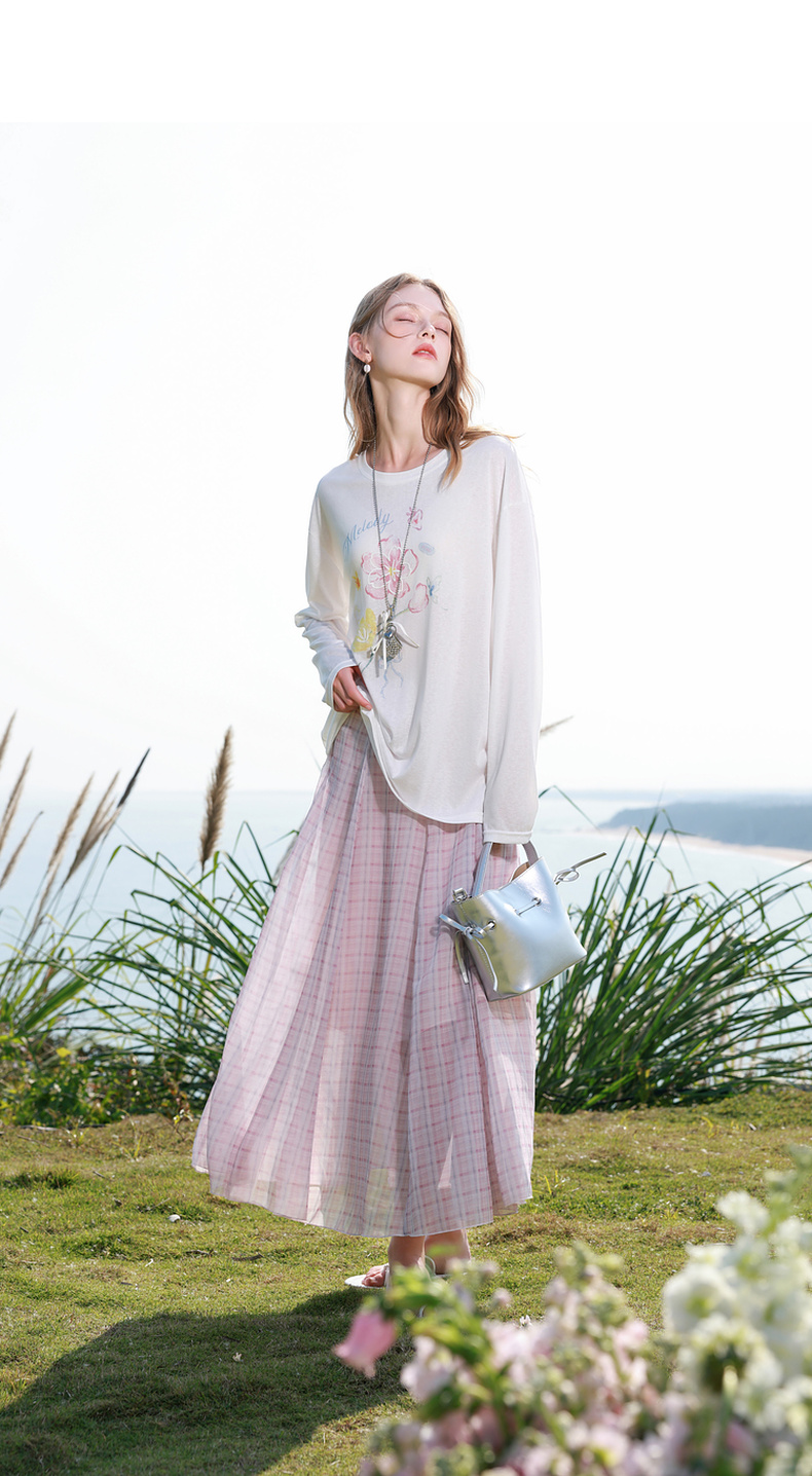 【莱赛尔】三彩2026春季新款樱花T恤圆领宽松落肩袖罩衫休闲M