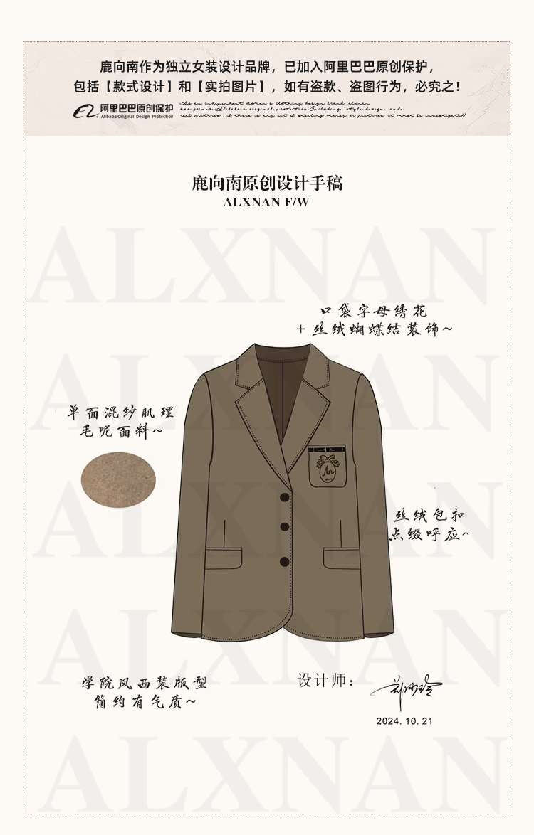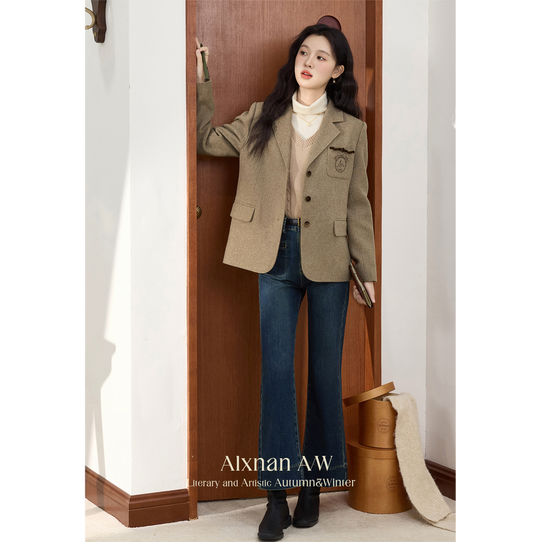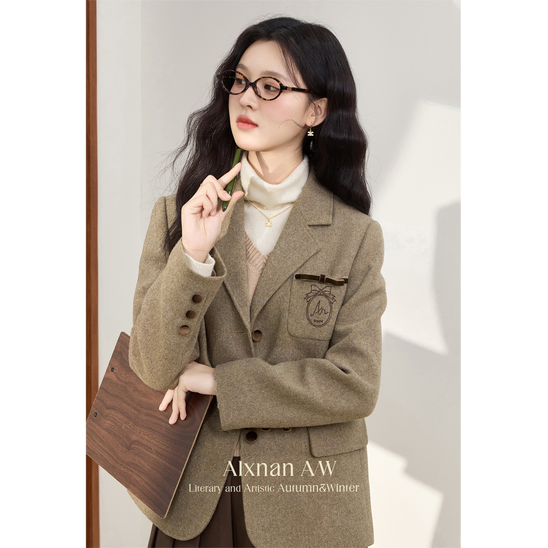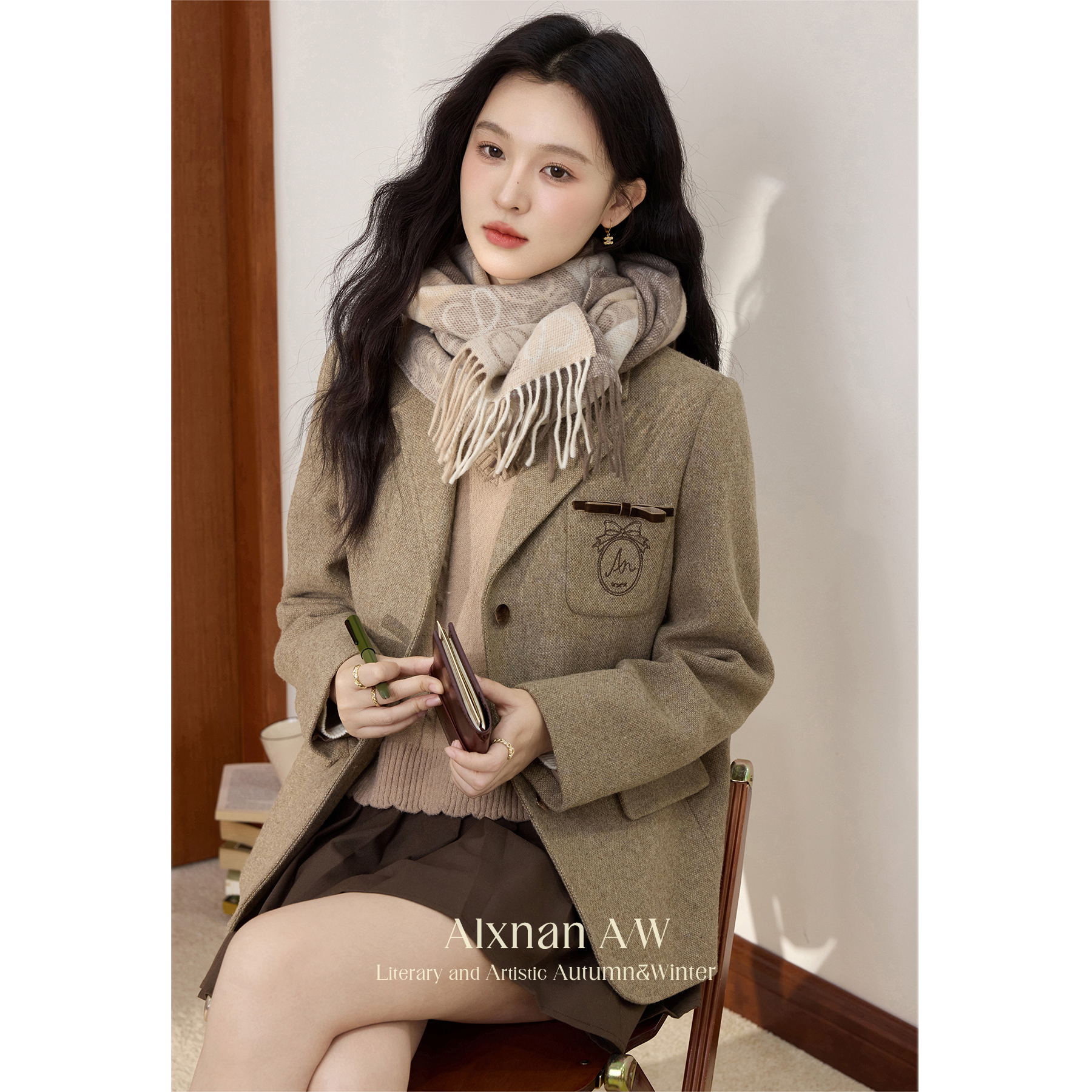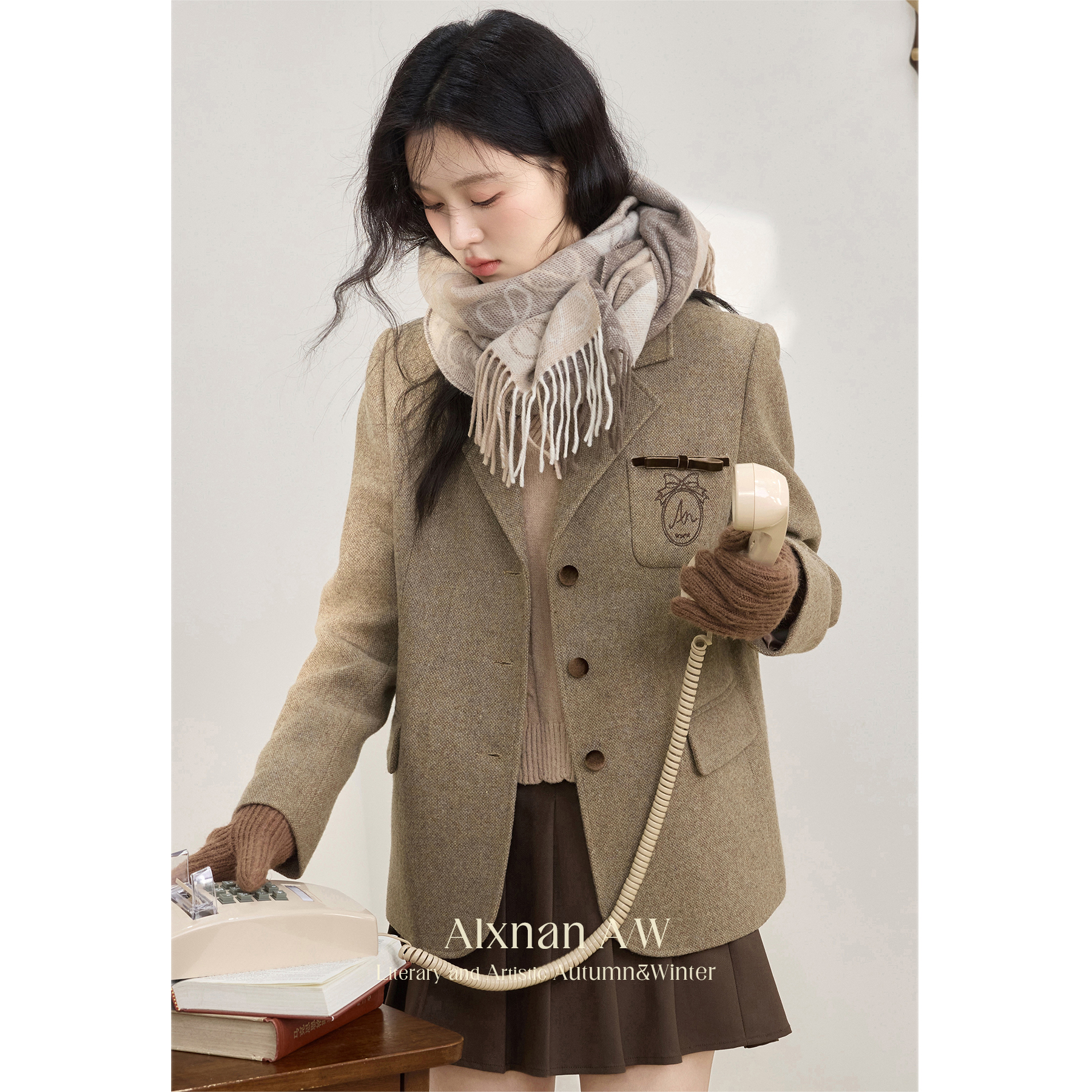 鹿向南「日落巴黎」学院风卡其色短款西装毛呢外套女秋冬新款上衣