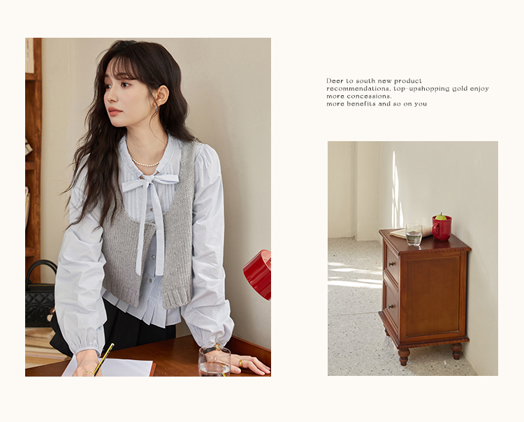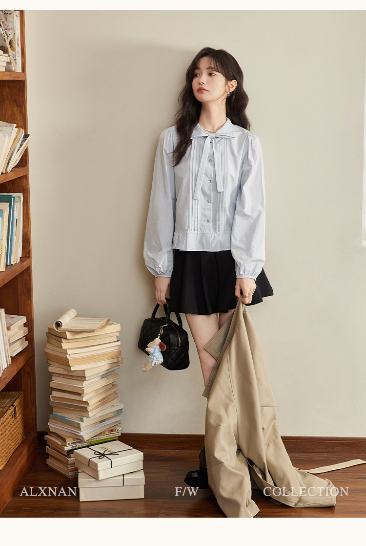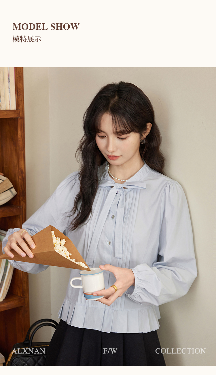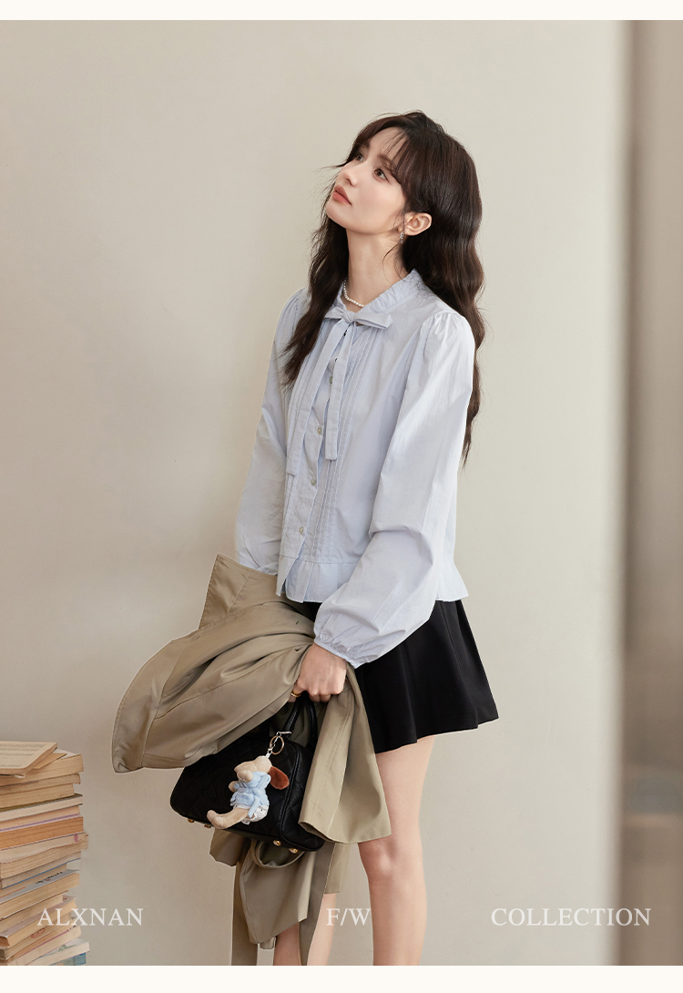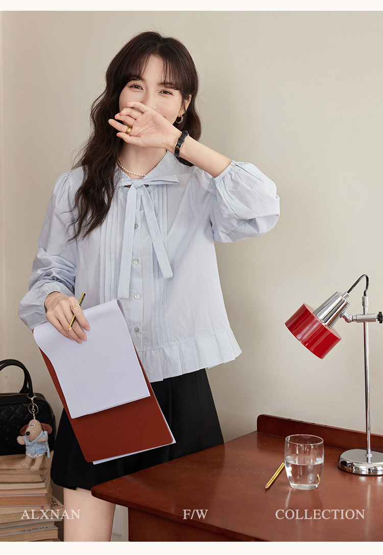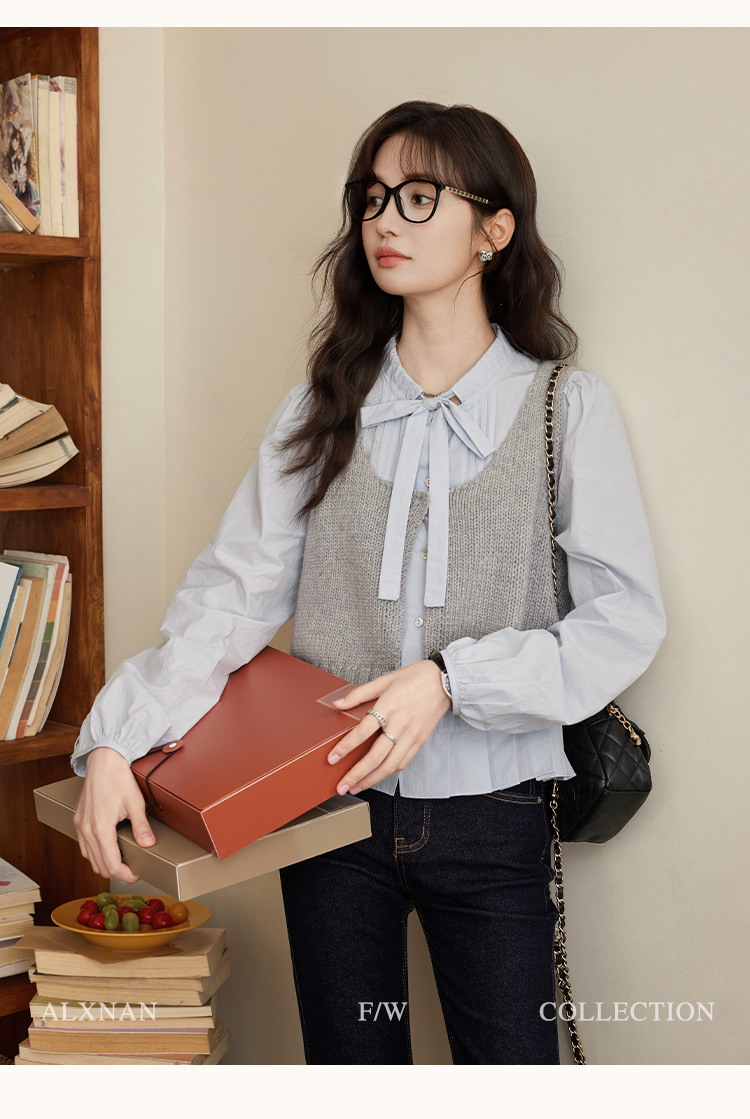 鹿向南「秋鸢」法式V领蓝色长袖衬衫