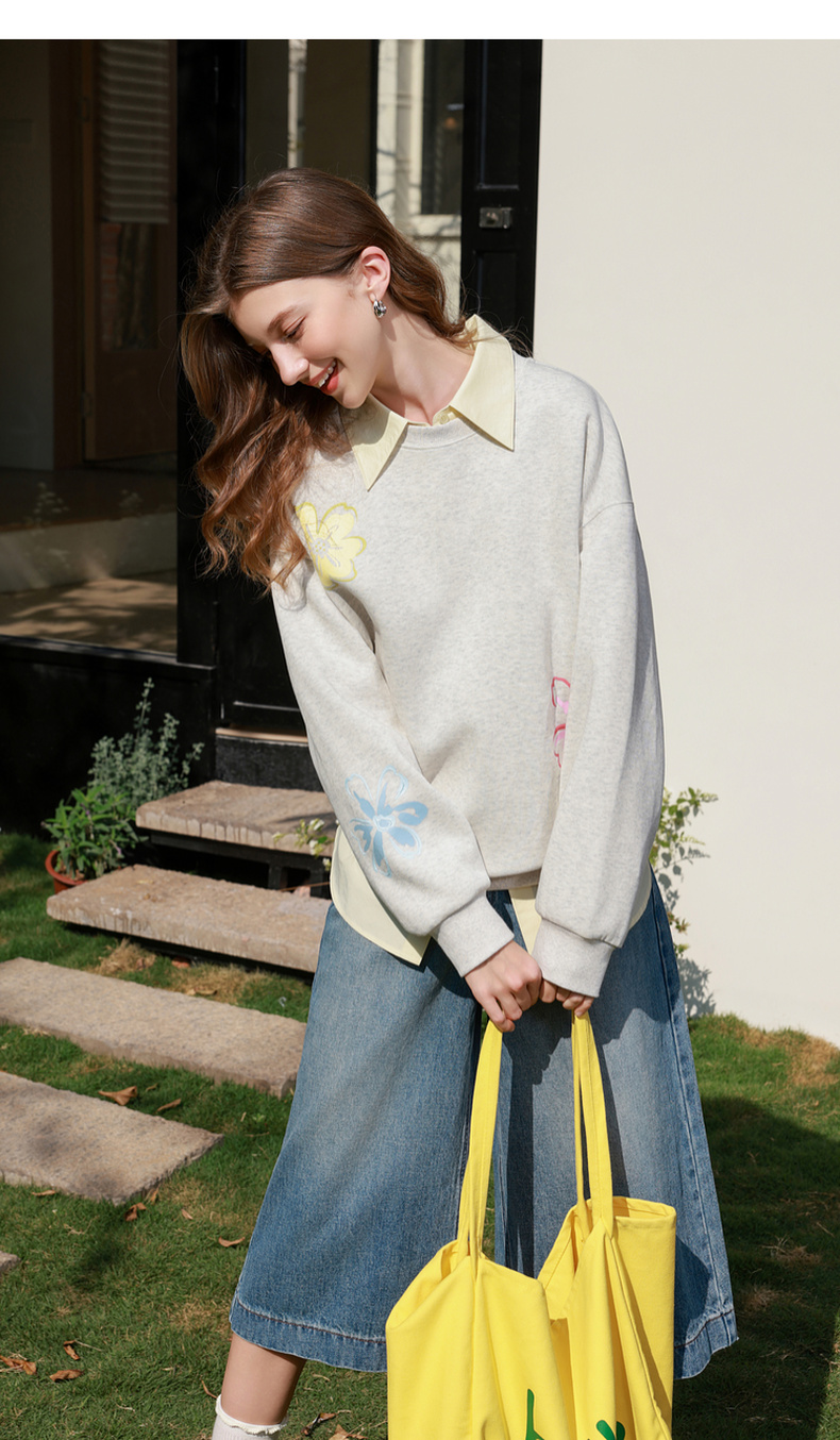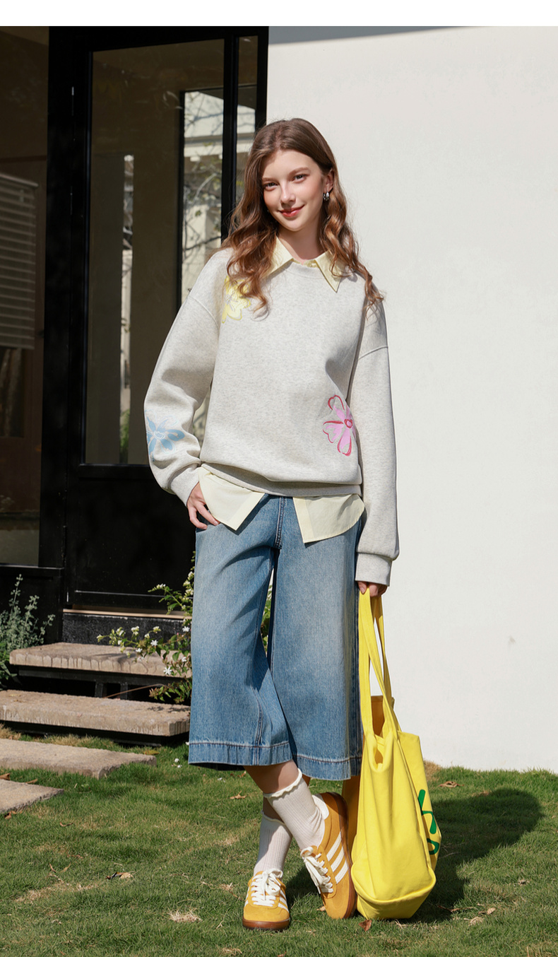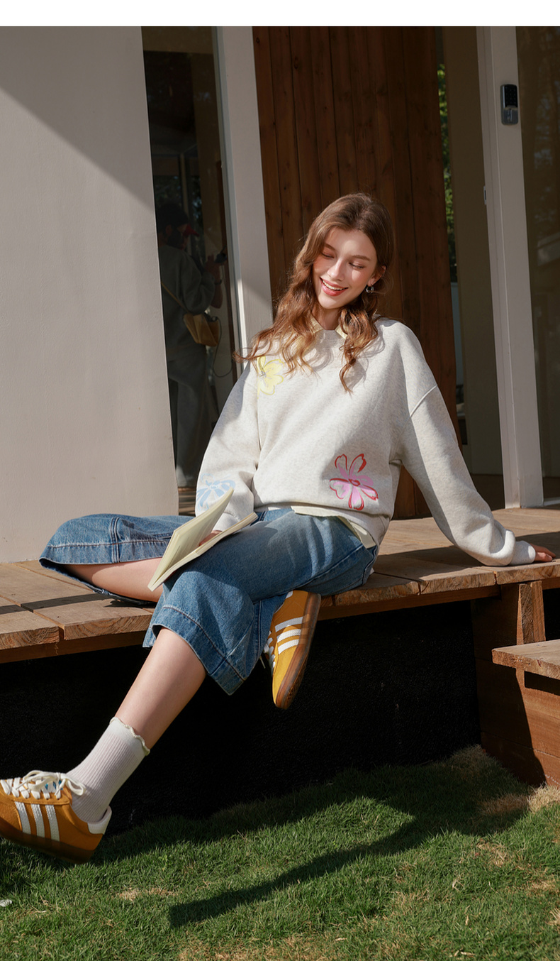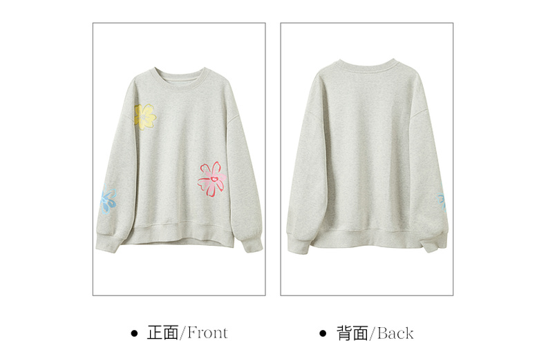 三彩2026春季新款花朵印花卫衣套头衫宽松休闲落肩袖上衣M