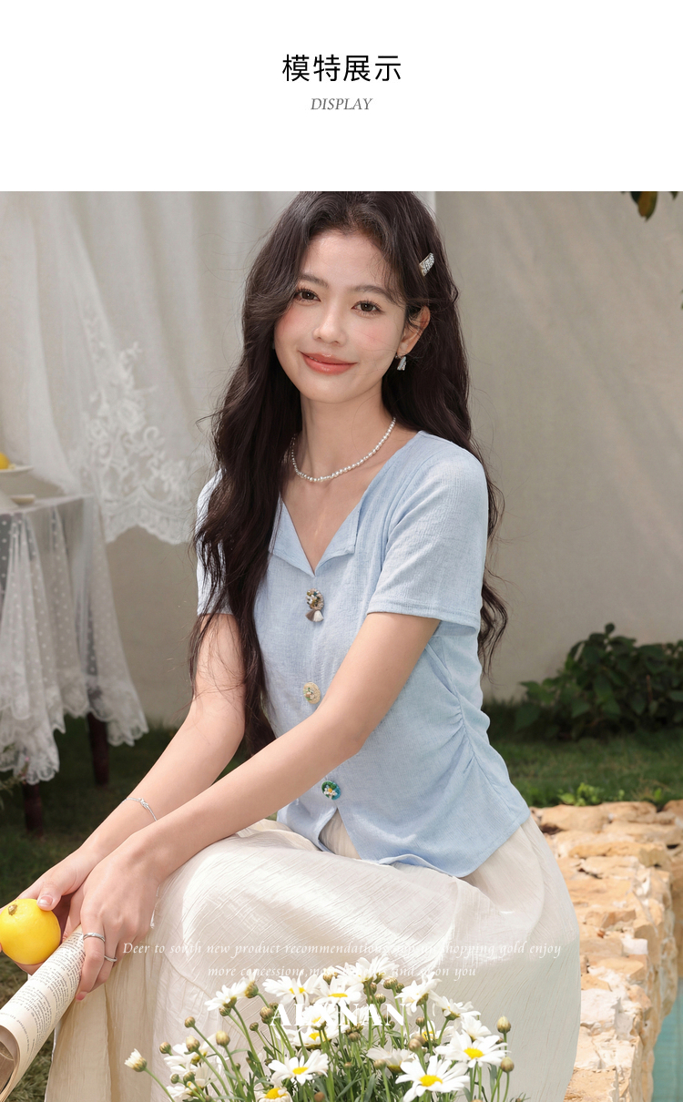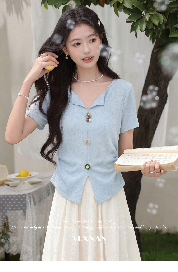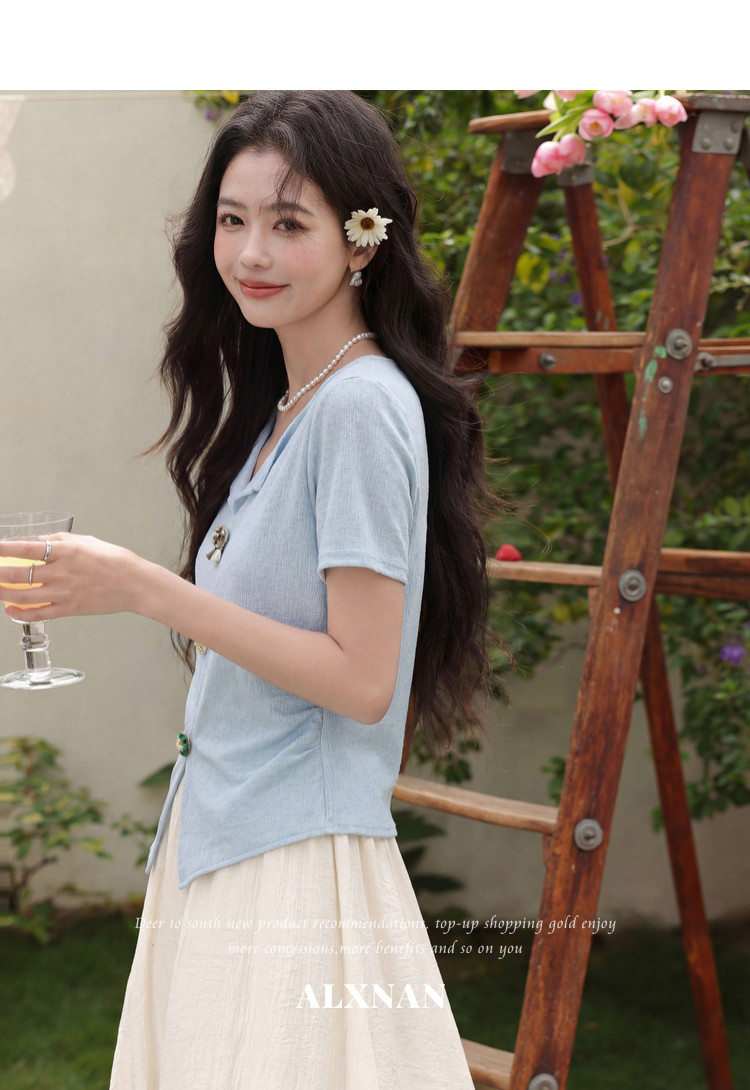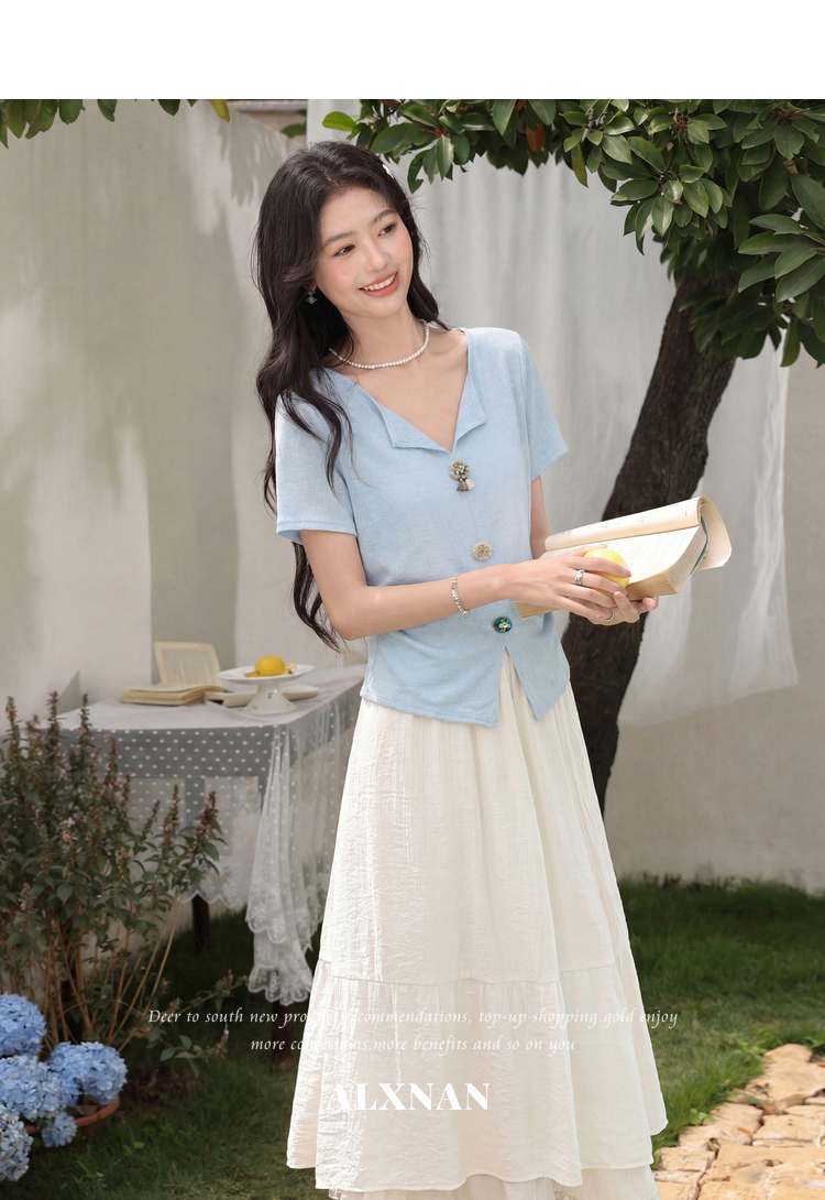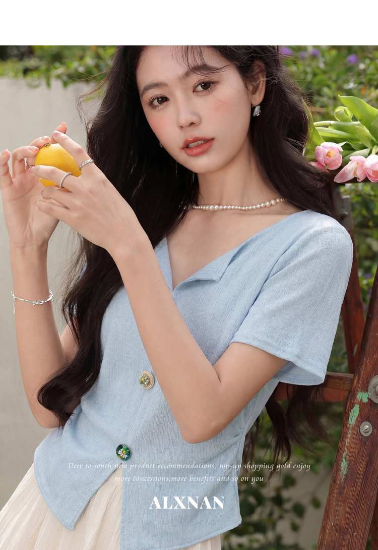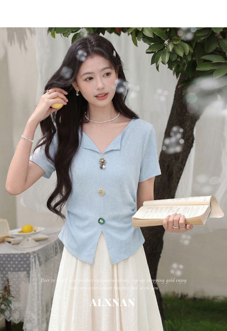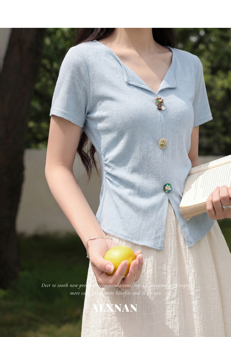 鹿向南「墨染星芒」黑色百搭设计感T恤2026夏新款显瘦V领上衣女