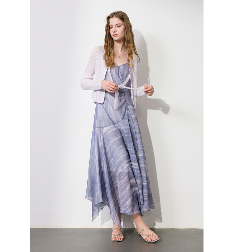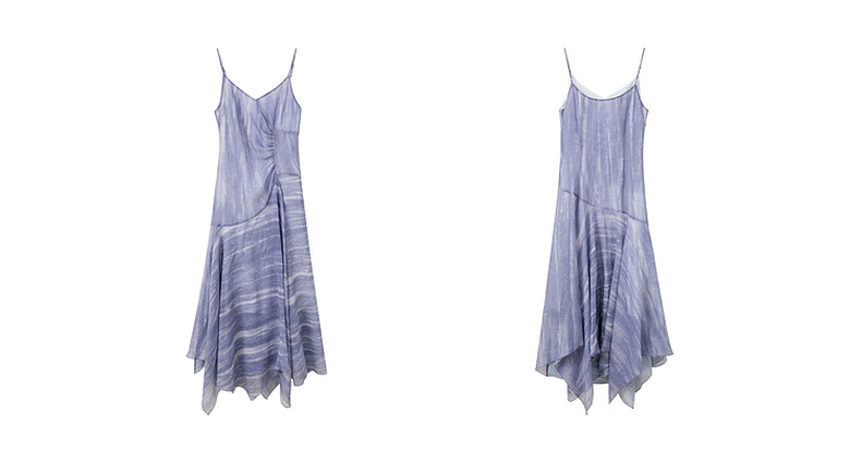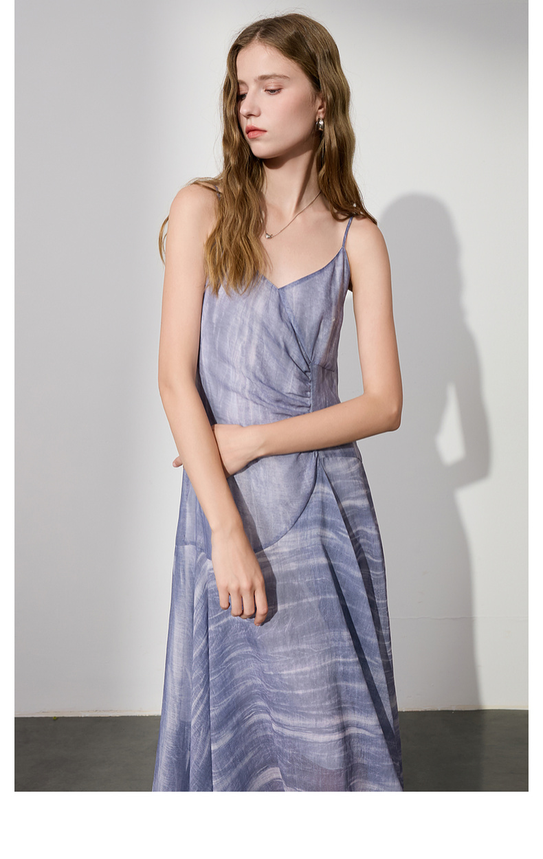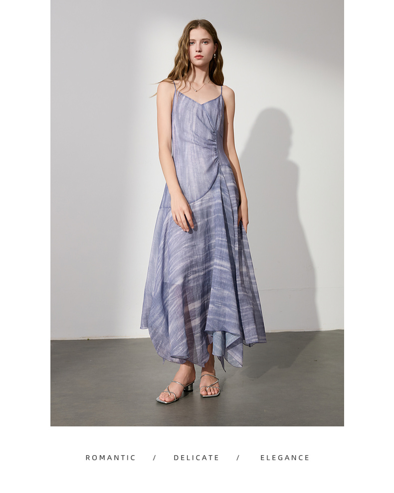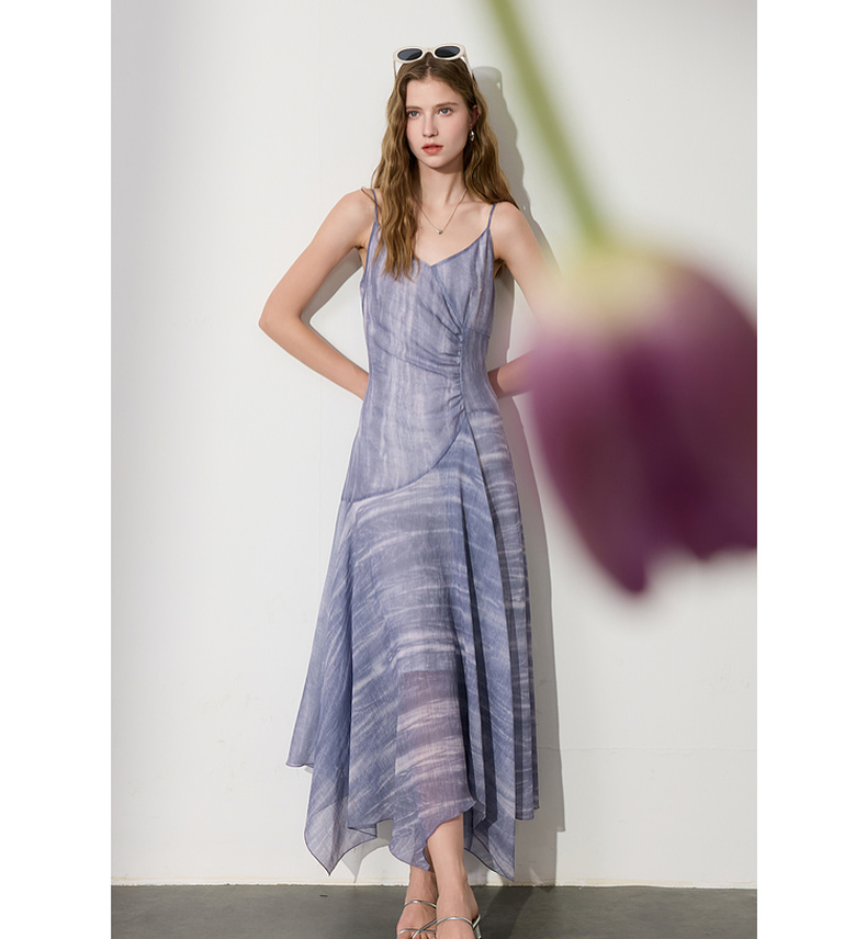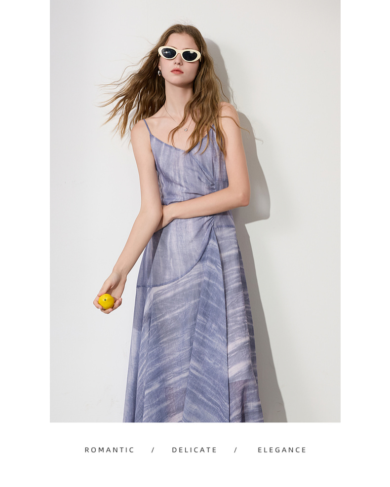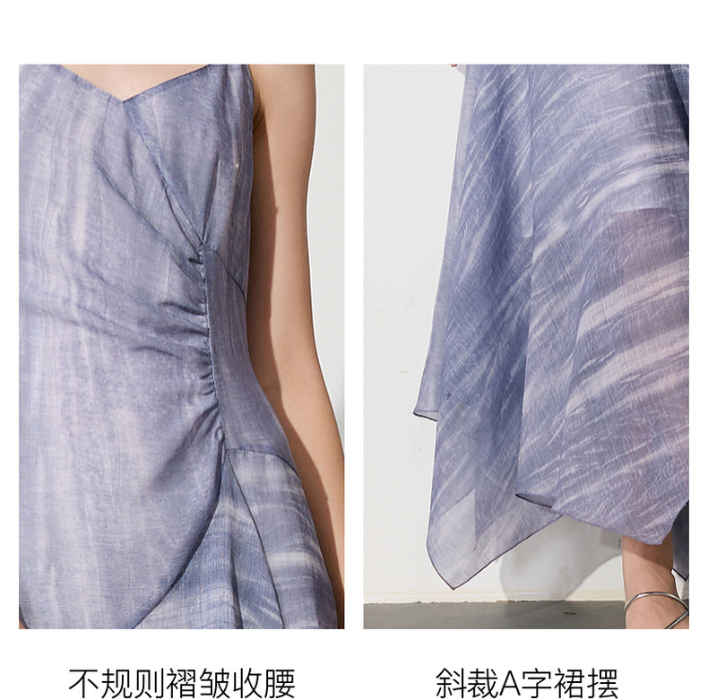 三彩2025夏季新款印花吊带裙不对称斜裁A字裙设计感连衣裙M