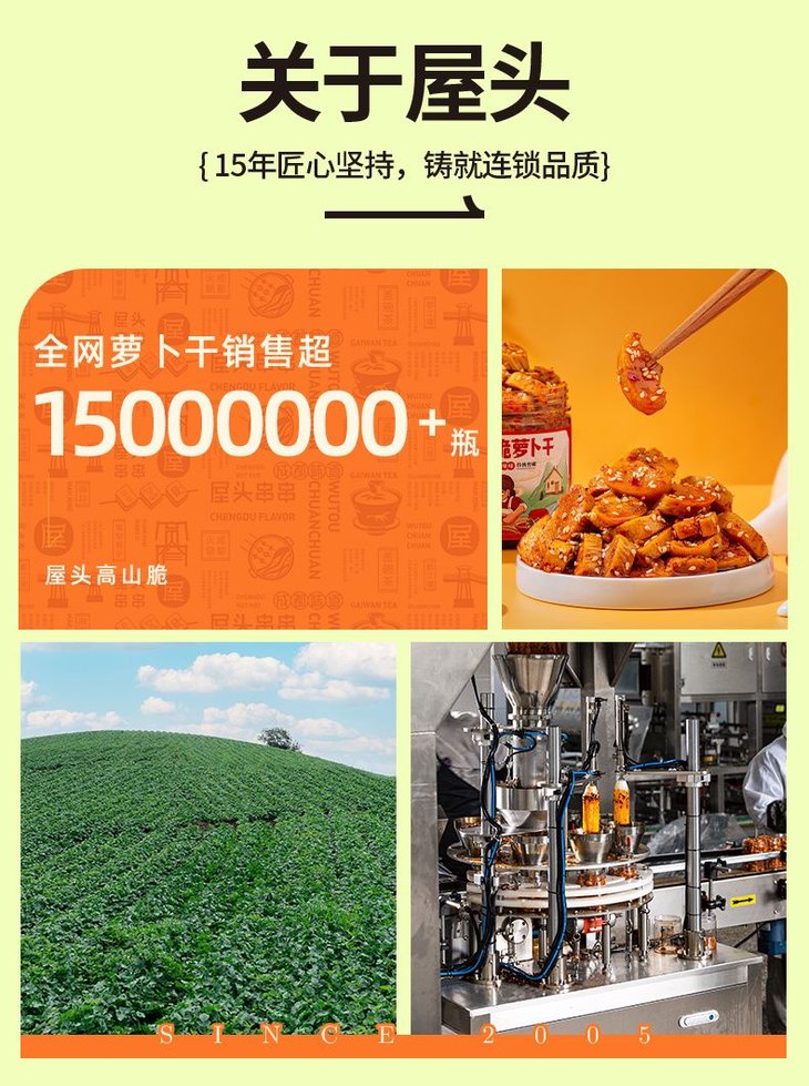屋 头 成 立 于 2 0 0 7 年🏃 专 注 调 味 品 生 产 制 作 17年 ☀ 旗 下 屋 头 餐 饮 有 限 责 任 公司 在 全 国 超 过500+ 串 串 店✨ ☀2021 年 屋 头 开 始 研 发 新 零 售 端 产 品 并 联 合 萝 卜 干 源 头 生 产 基 地🌙 💝利 用 产 业 发 展 的 地 理 优 势 与 当 地 扶 贫 企 业 💝 🌙 共 同 开 发 基 地+ 生 产 的 产 业 模 式 在川内拥有10000+亩种植基地3个制作工厂