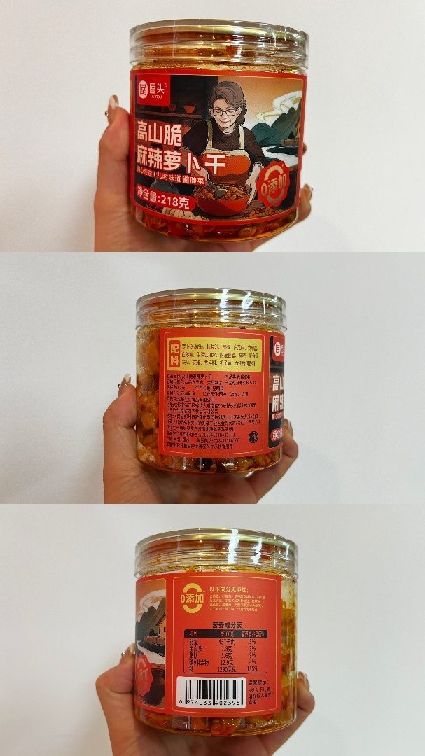 【配料】萝卜、植物油、辣椒、白芝麻、食用盐、白砂糖、生活饮用水、酿造食醋、味精、复合调味料、香辛料、栀子黄、食用香精香料
