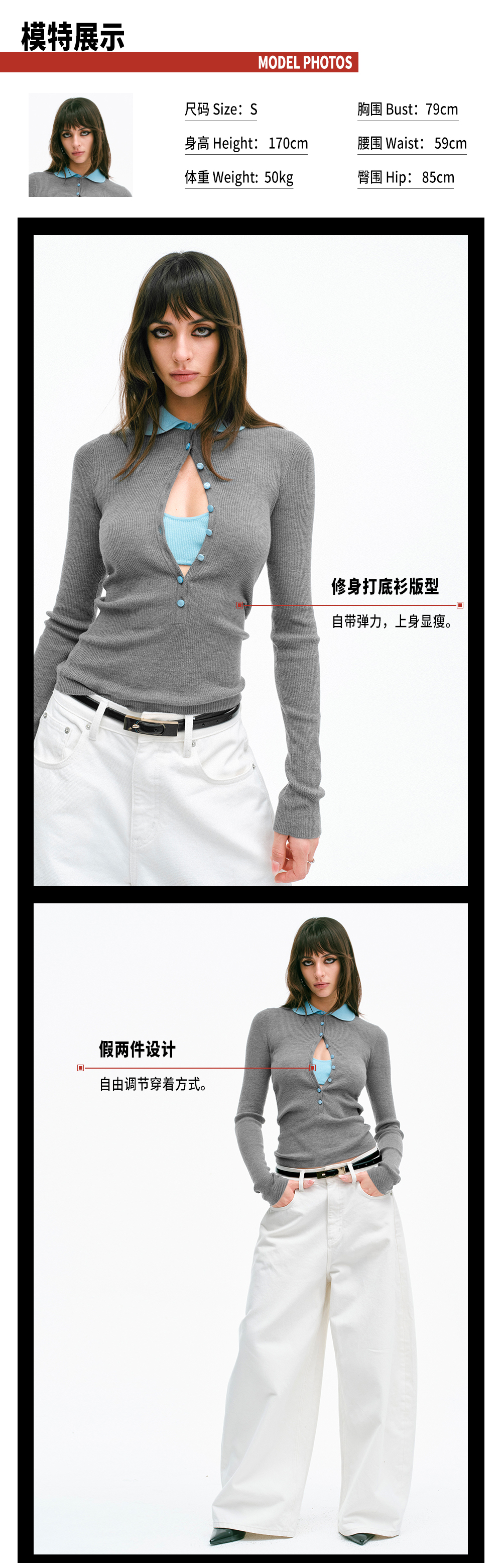 TR她热 海盐甜心 灰蓝撞色桑蚕丝羊毛假两件复古修身娃娃领打底衫