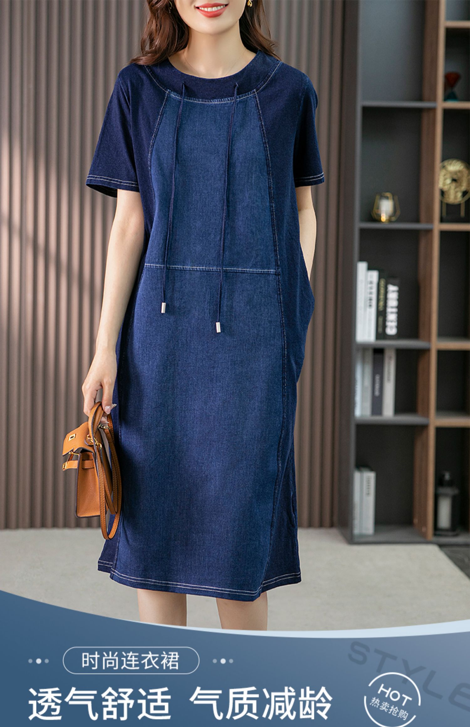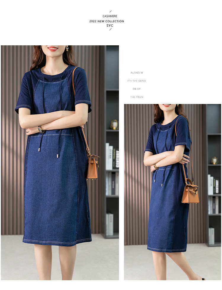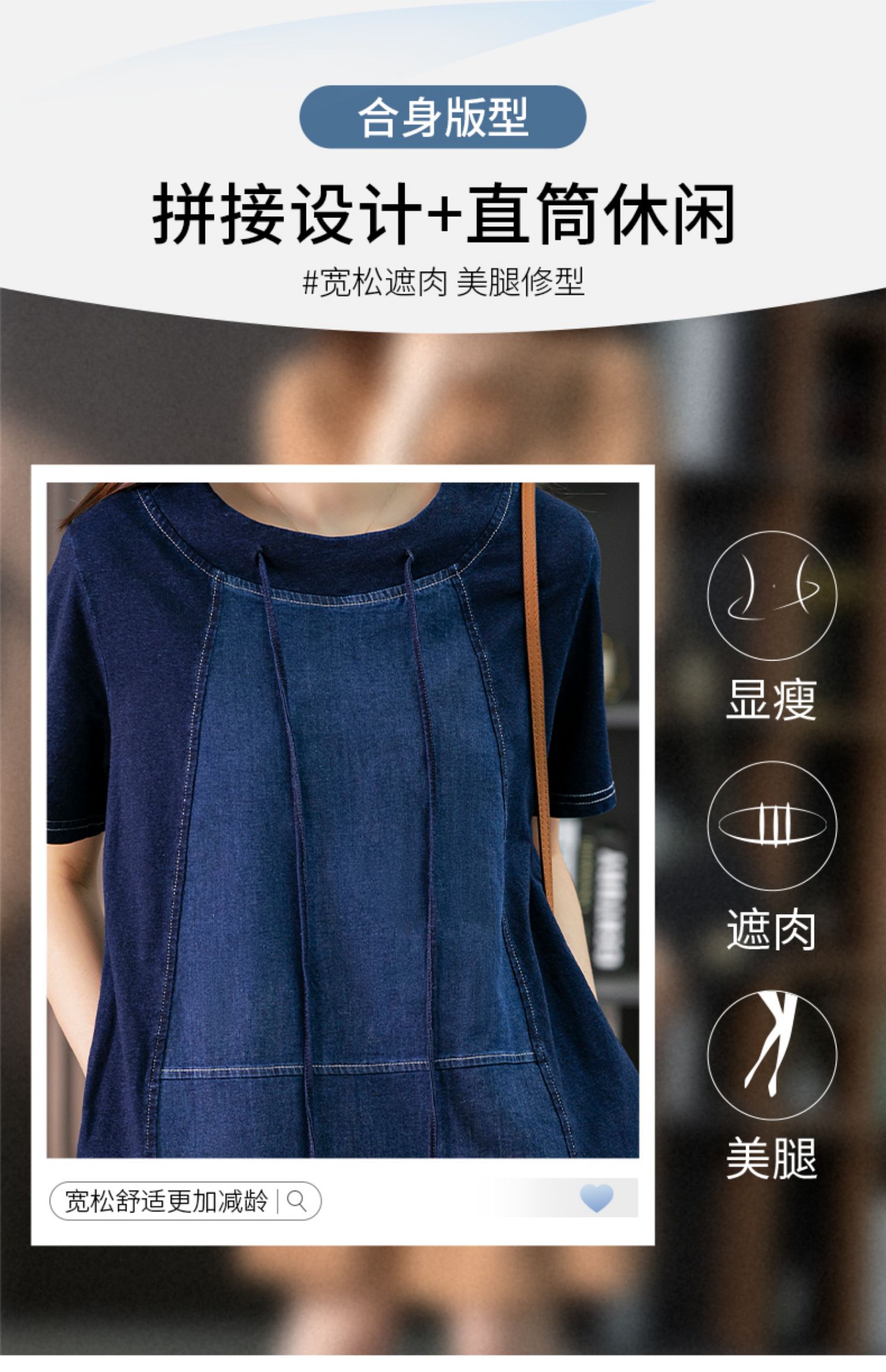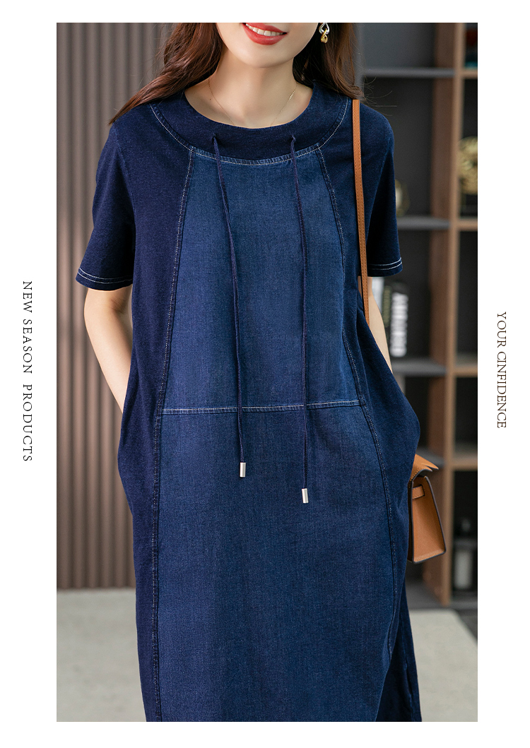 YX【现货7天】气质拼接牛仔连衣裙女中长款2023夏季新款韩版宽松休闲直筒裙