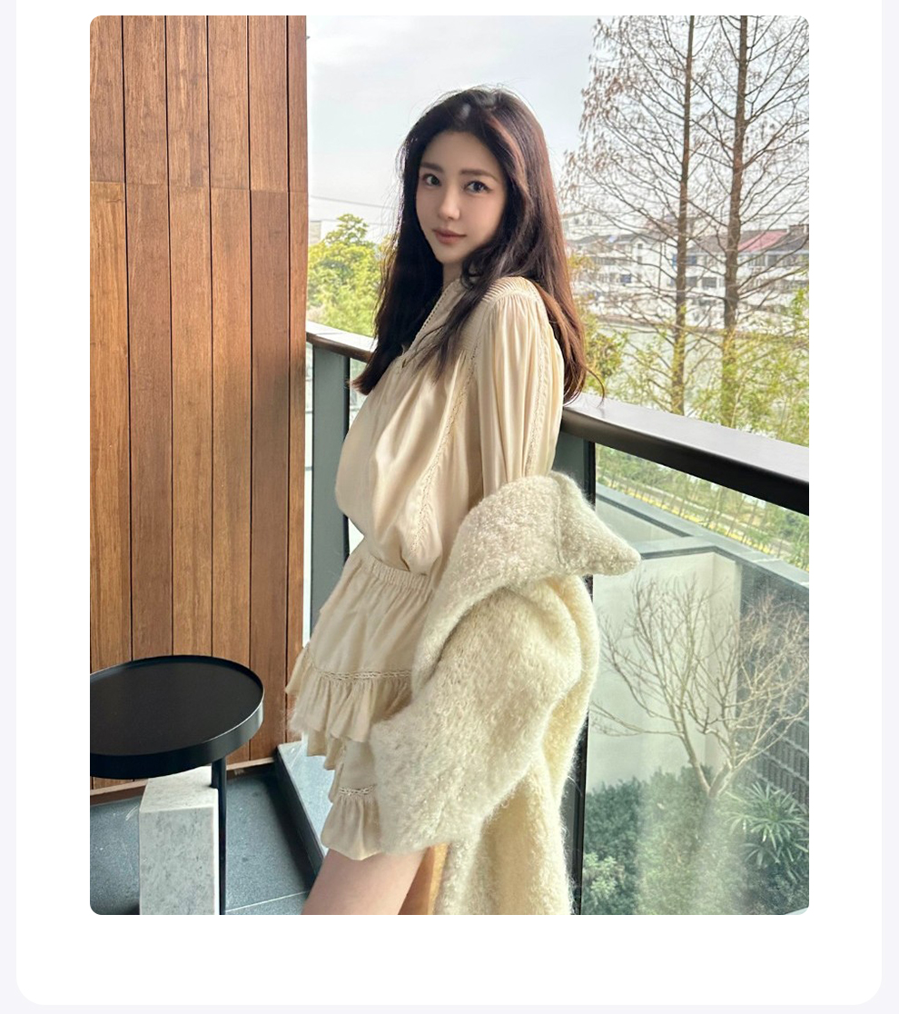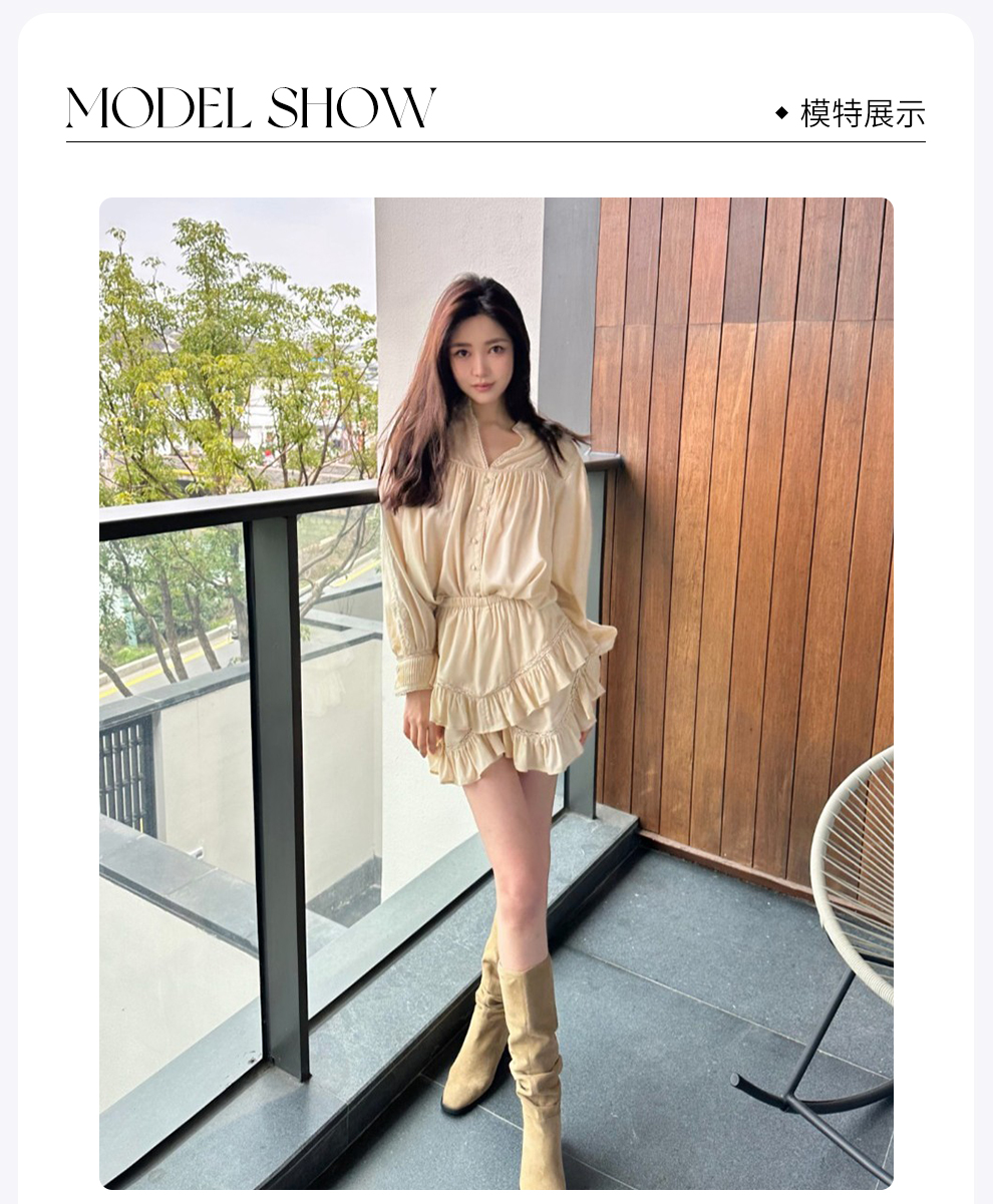 法式米杏色衬衣高腰半身荷叶边短裙套装T2782/D2783
