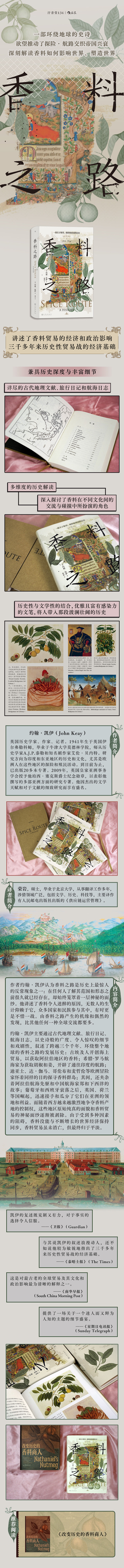 作者约翰·凯伊认为香料之路是历史上最惊人的反常现象之一:在任何人了解其范围和形态之前很久就已经存在,却始终笼罩着一层神秘的面纱。他讲述了香料令人迷醉的原因,无数人的生计仰赖于它,众多国家和民族参与其中,有时更是不惜一战。由香料之路产生的机缘和偶然的发现,比其他任何一种全球交流都要多。