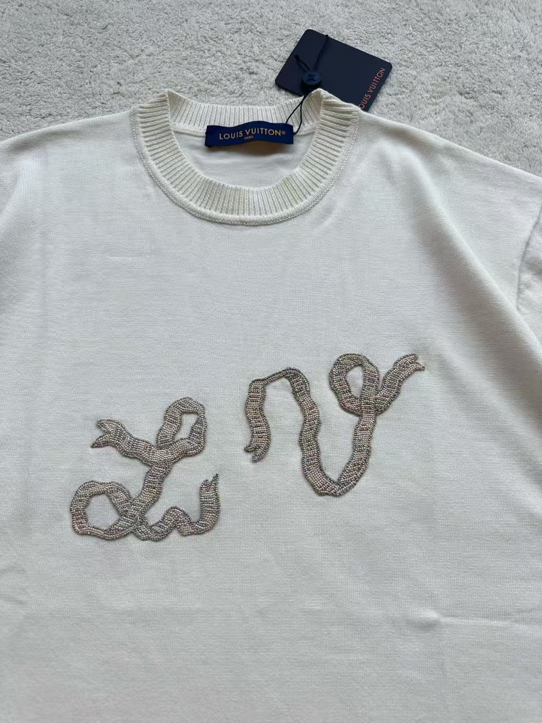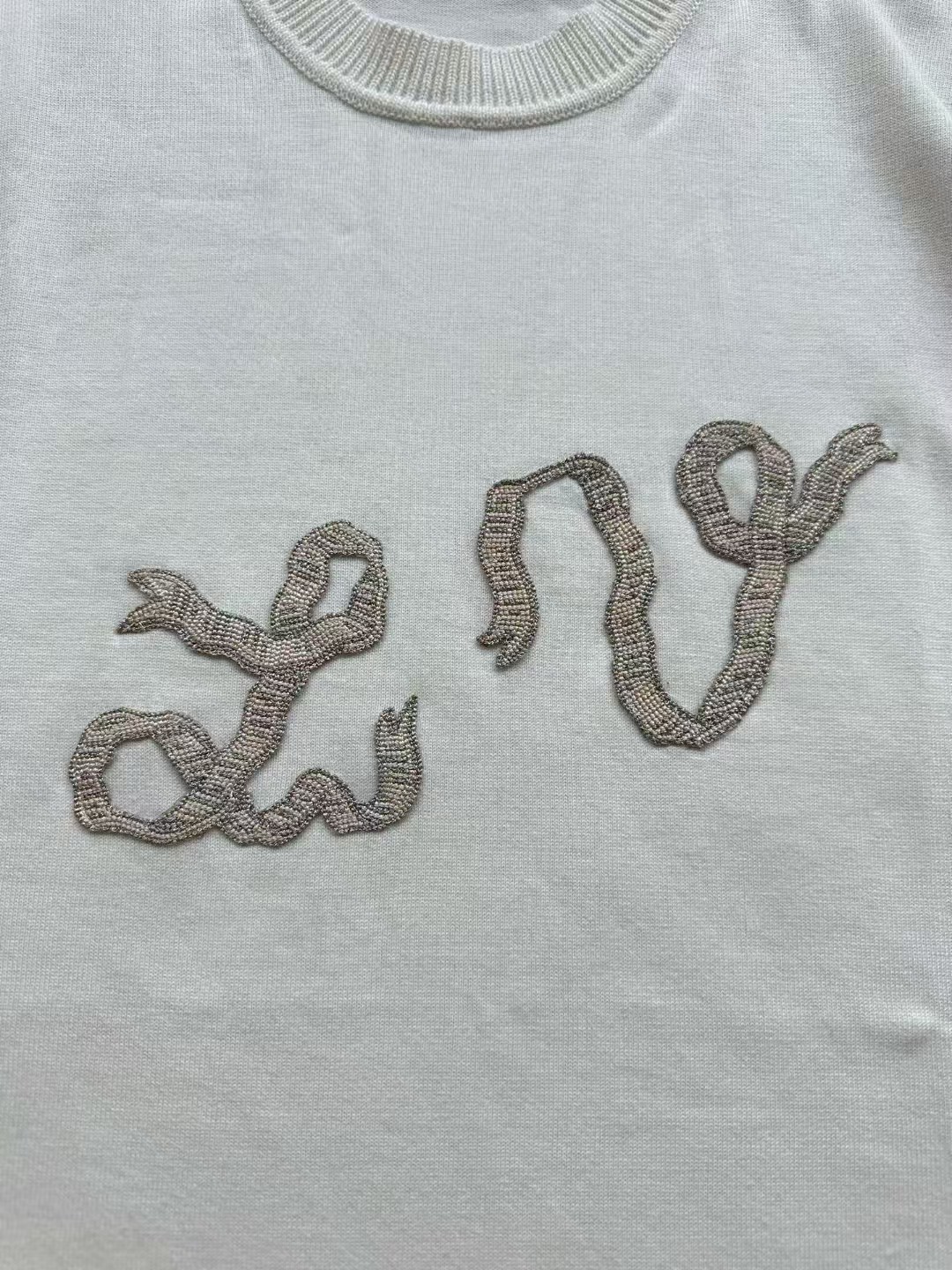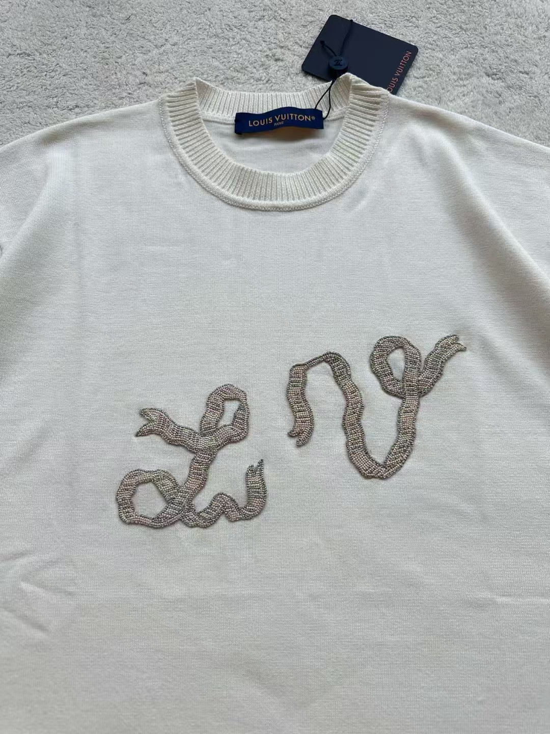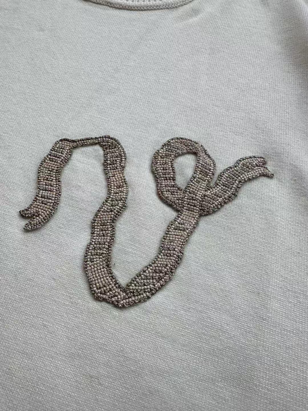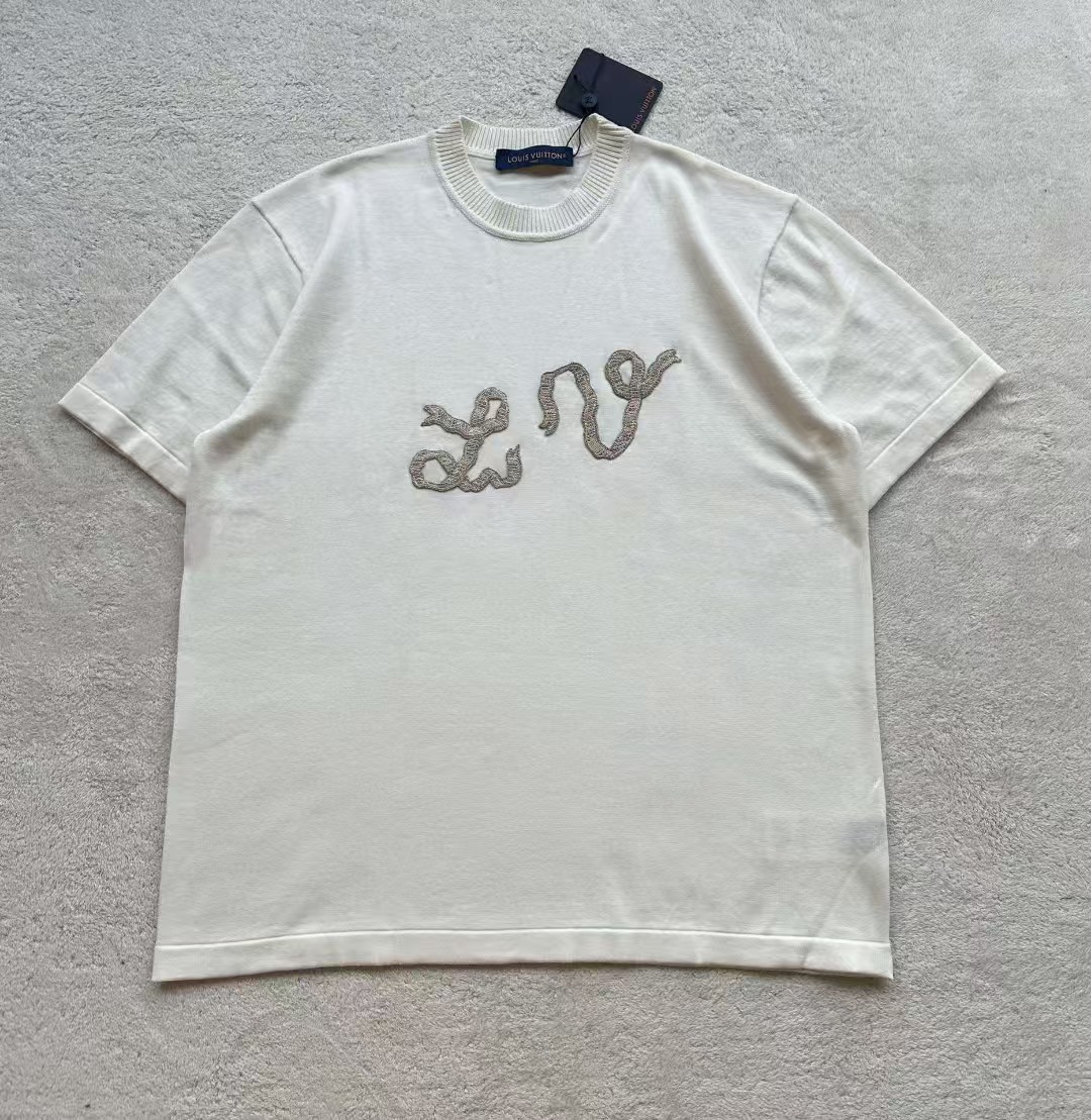 Louis*V…❤️原版级❤️飘带毛织短袖👍此款对板采用80支双股赛络纺纱,高支高品质纱能保证面部无毛刺光滑柔软。运用进口14针织机双纱入机做平纹工艺,章仔处由进口金银线对板做工艺,成品后再由人工精细沿边手工摇上去。烫板定型