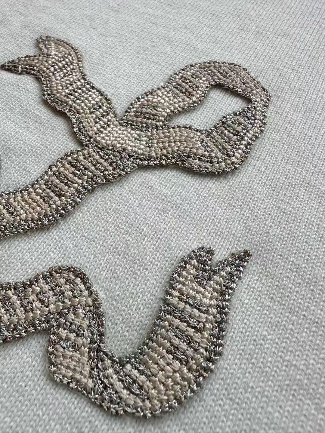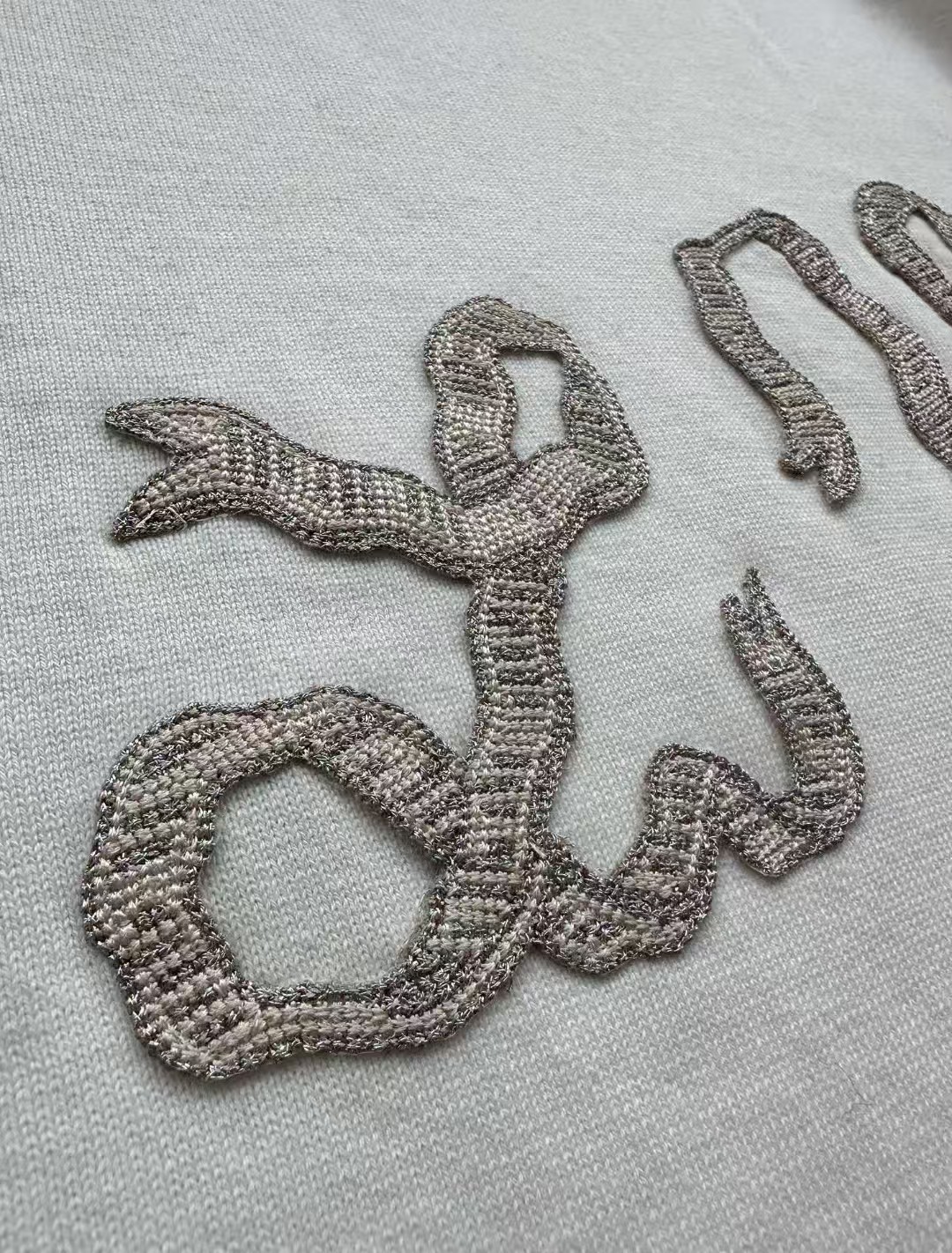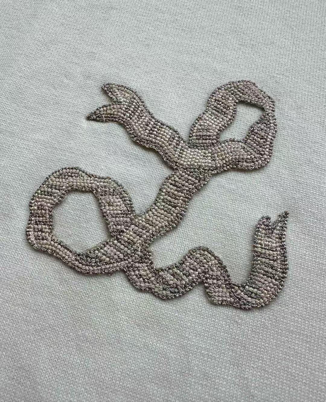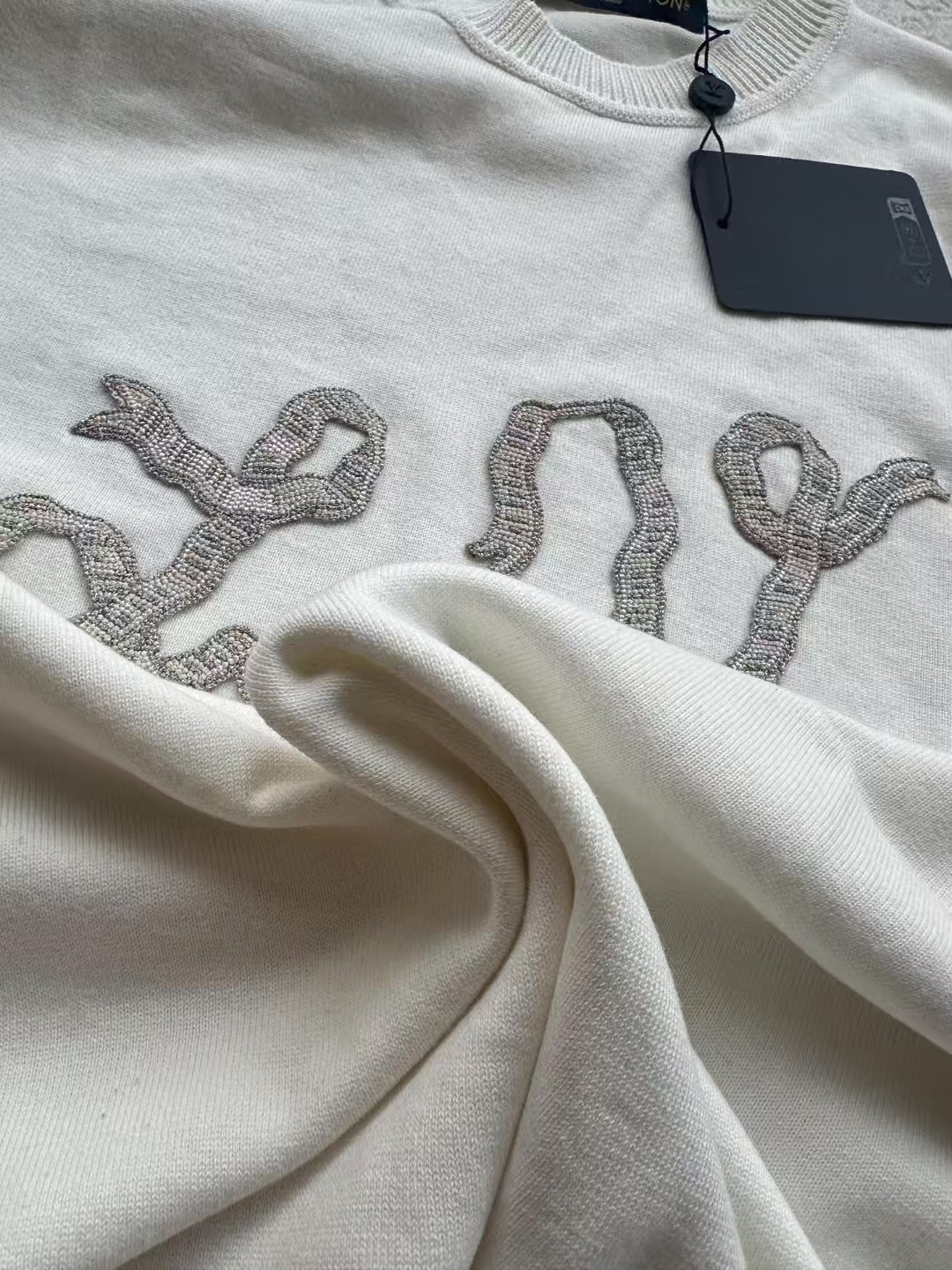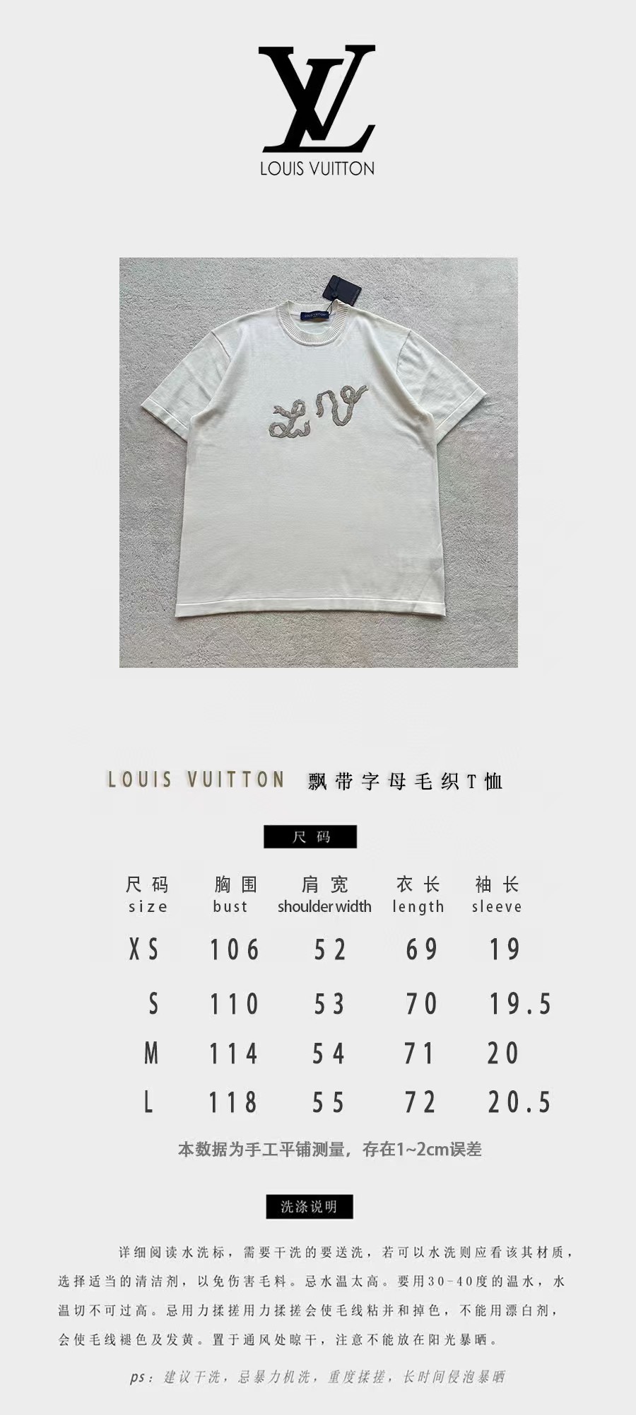 Louis*V…❤️原版级❤️飘带毛织短袖👍此款对板采用80支双股赛络纺纱,高支高品质纱能保证面部无毛刺光滑柔软。运用进口14针织机双纱入机做平纹工艺,章仔处由进口金银线对板做工艺,成品后再由人工精细沿边手工摇上去。烫板定型