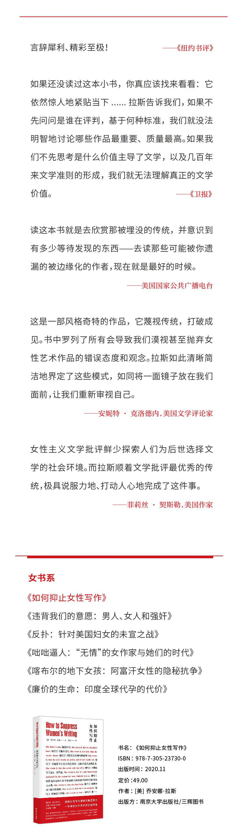 本书是雨果奖、星云奖得主,女性主义科幻小说家乔安娜▪拉斯的著名文论,她在书中模仿文学评论中的惯用论调,以反讽的方式写了一份“抑止女性写作指南”,以此尖锐地指出和批评那些施加在女性作者身上,阻止、贬低和无视女性写作的社会阻力。同时,这又是一部主流视野之外的文学史,它重新搜罗了那些被认为不值得了解的作品,并对那些文学史上鼎鼎大名的作者指名道姓:狄更斯、海明威、伍尔夫、桑塔格、勃朗特姐妹——有人曾贬抑女性写作,有人是被贬抑者,而有人两者皆是。