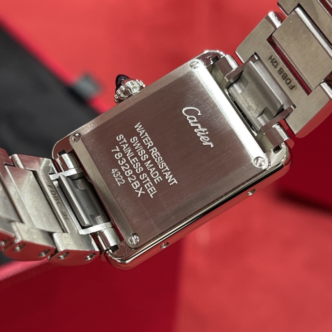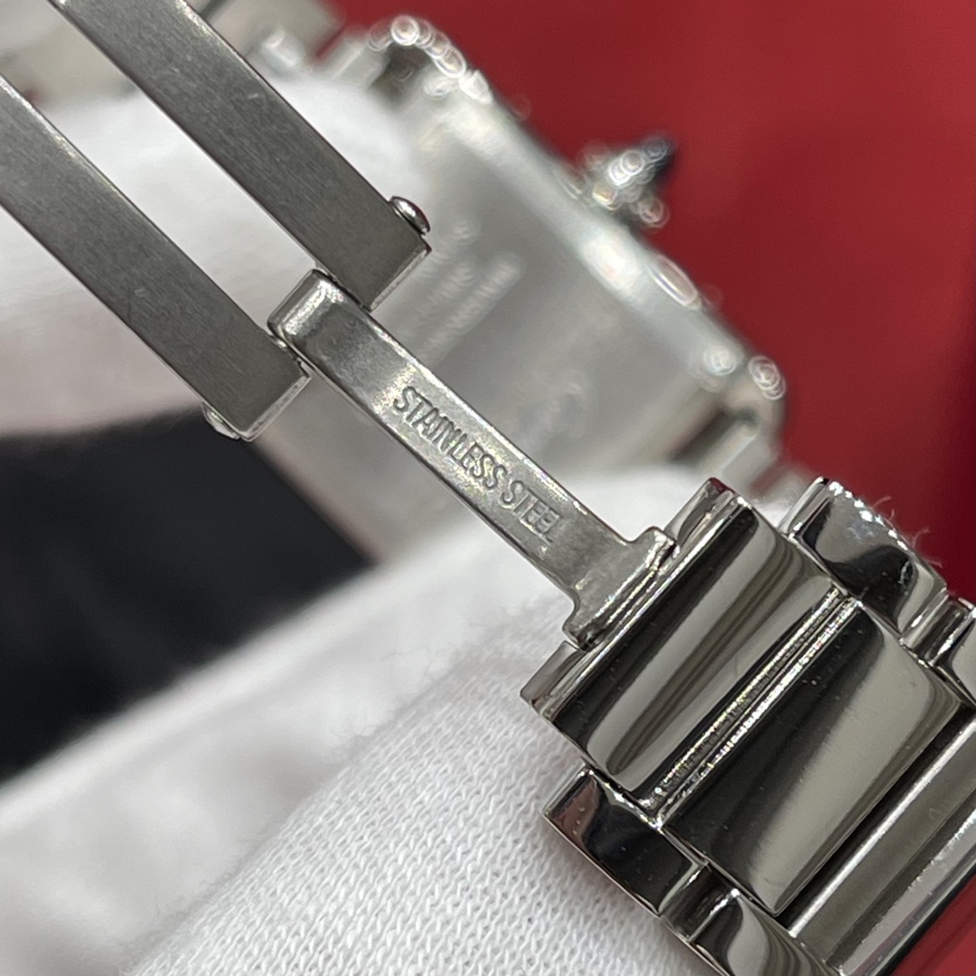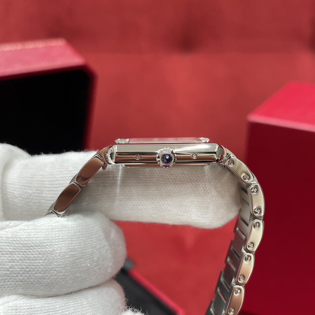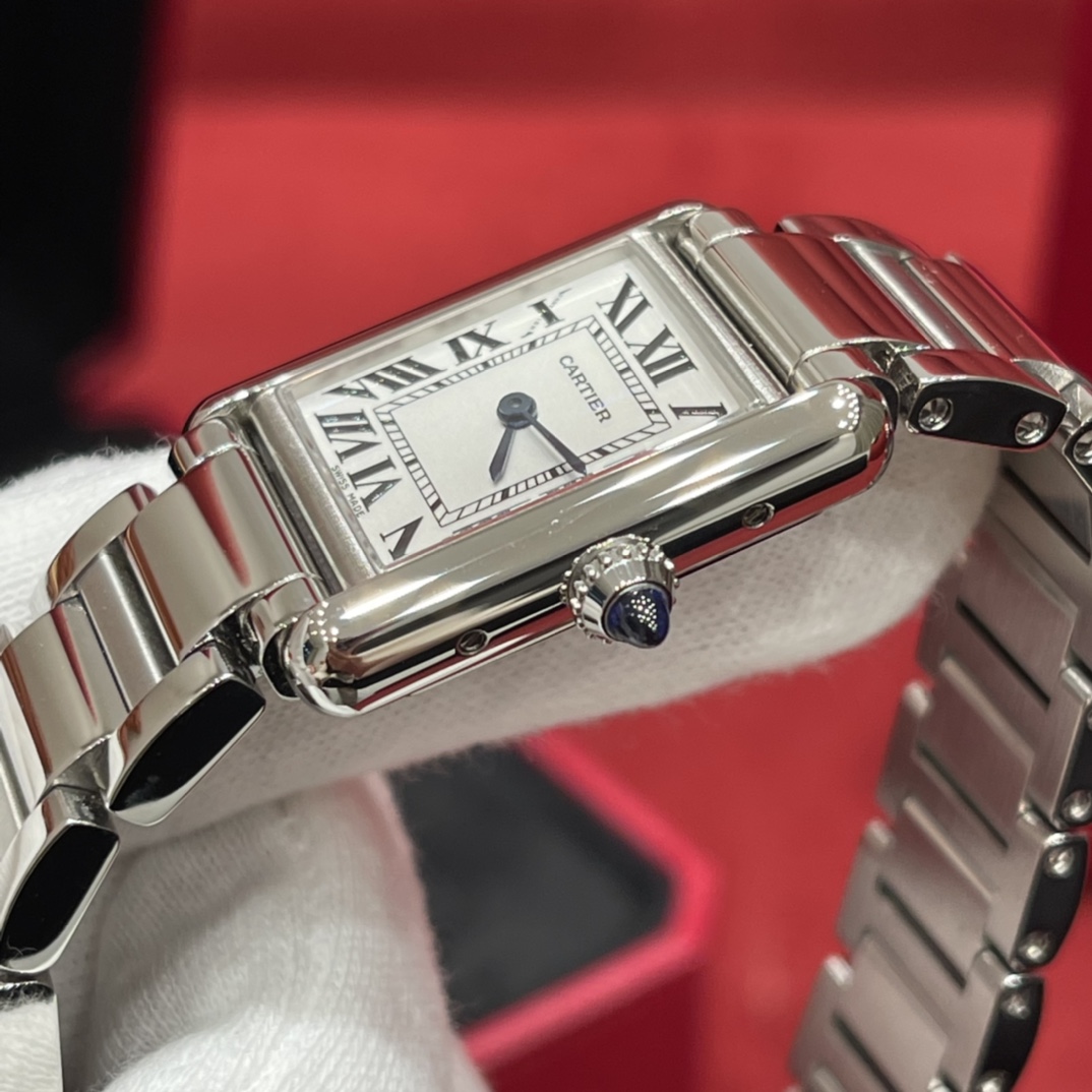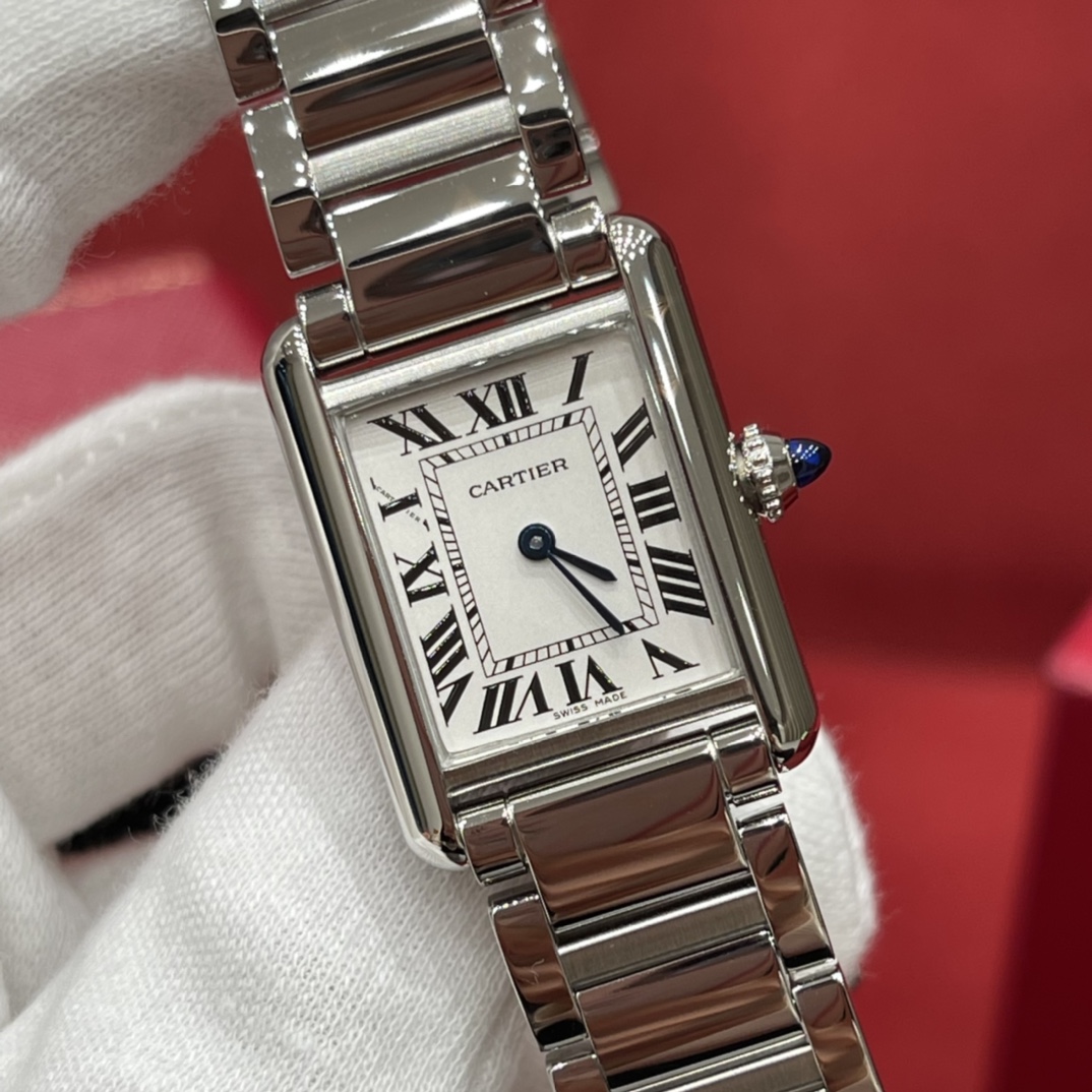 🏷️坦克系列WSTA0052(中号) 原版石英瑞士进口超薄高效能机芯 # 采用精钢表壳,珠光镀银白色方形表盘,瑞士剑形指针,特别完美,针轴光亮!针轴也是符合瑞士工艺要求,印字特别清晰,刻字完美,防刮损防指纹蓝水晶玻璃,生活防水。 表冠纤细,倒角打磨的特别精细~镶嵌一颗凸圆形合成尖晶石! 精钢表带-可替换式金属表链,与原版一致的“Quick Switch”手动快拆表链装置 拆卸简单易操作。 尺寸:33.7x25.5mm