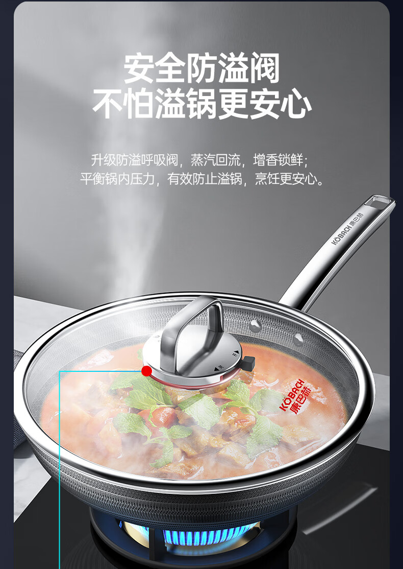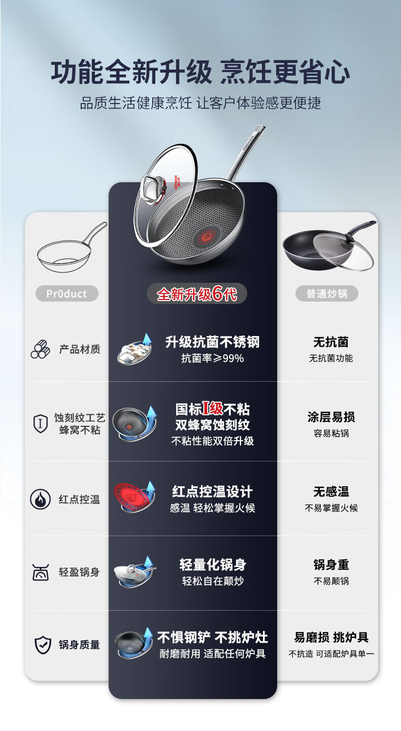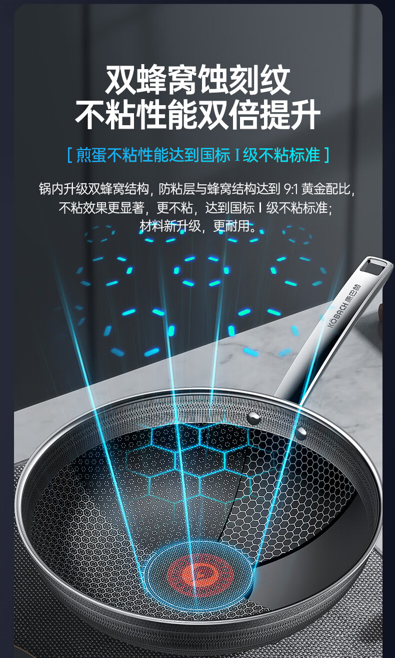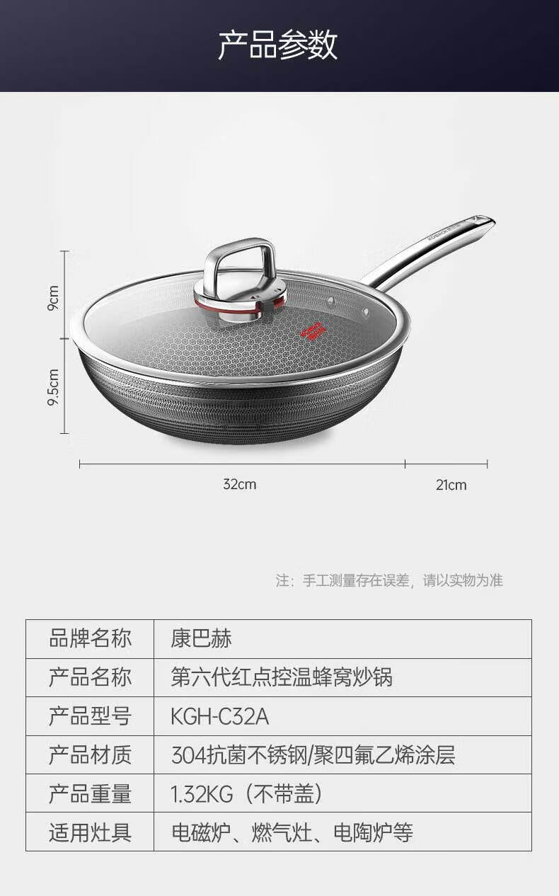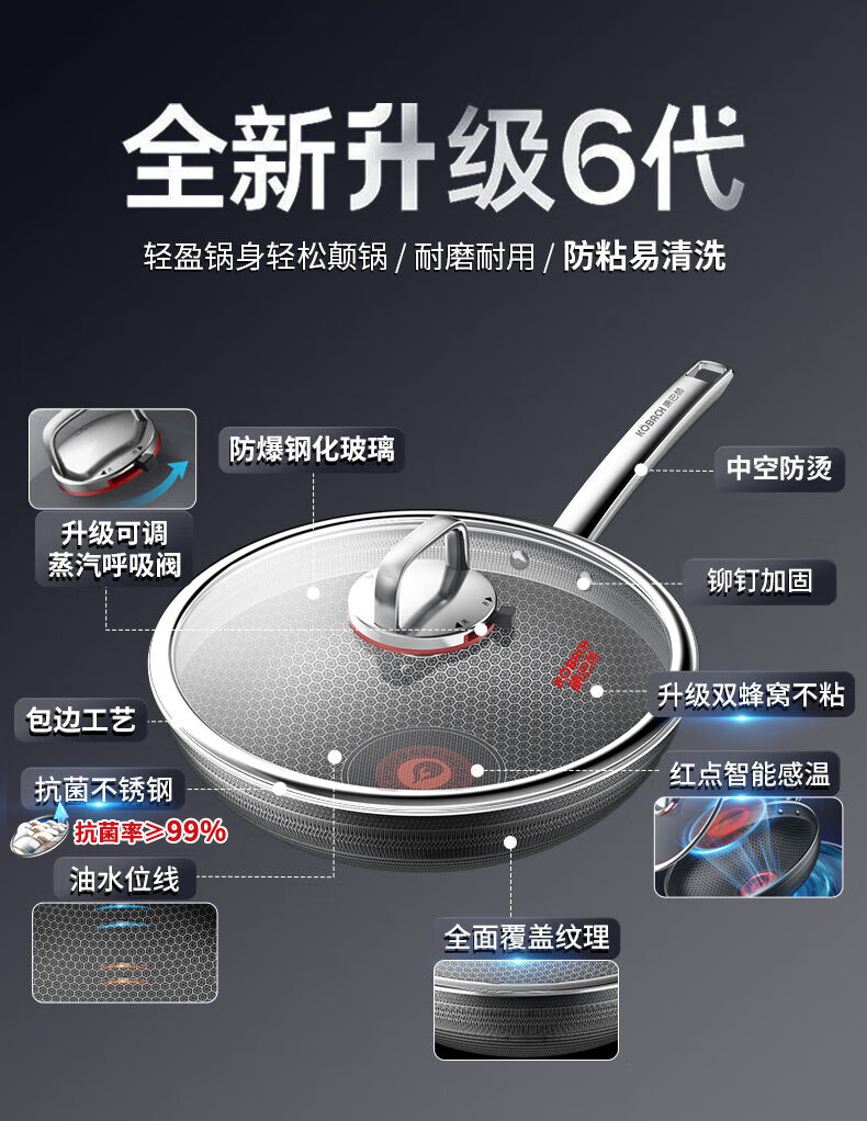 康巴赫第六代炒锅不粘锅抗菌不锈钢炒菜锅双蜂窝锅红点32cm电磁炉燃气灶