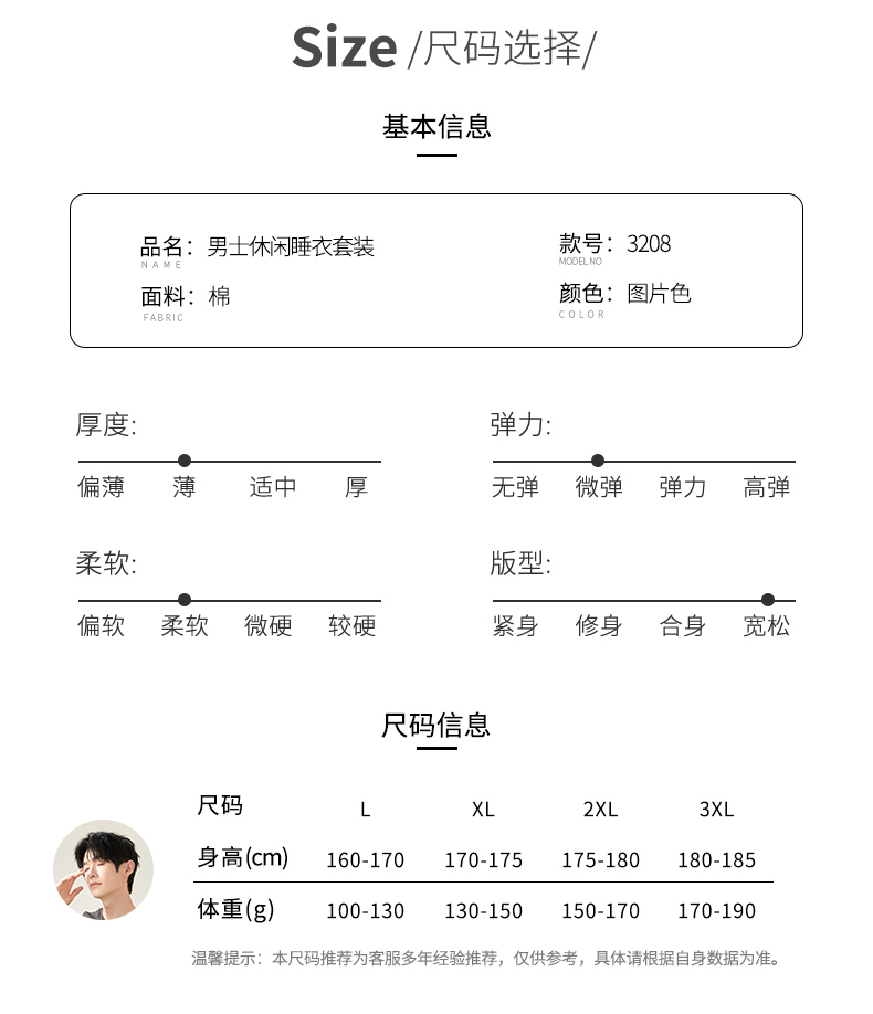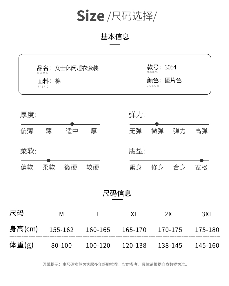 品名:家居服 材质:棉95% 氨纶5% 发货地:广东 发货时间:下单后一般48小时内发货(周末、节假日除外) 发货快递:中通、圆通快递(以实际发货为准,暂不支持指定快递) 运费政策:该商品全国部分地区包邮(新疆、西藏需补差运费5元/单,港澳台不发货,请知悉) 售后政策:本品包装配件完整、未拆封、不影响二次销售支持7天无理由退换货(无运费险),请知悉 温馨提醒:因显示器像素差异与拍摄灯光原因,图片与实物颜色可能存在些许差异,具体请以收到实物为准; 购买须知: 01、由于款式太多,不同款式裤子口袋不同:裤子有一个口袋、裤子有两个口袋; 02、水洗工艺不同,面料质感软糯度可能有所不同。 03、翻领情侣款式、圆领女款、圆领男款,款式不同尺码不同,具体尺码标准以详情图为准!! |