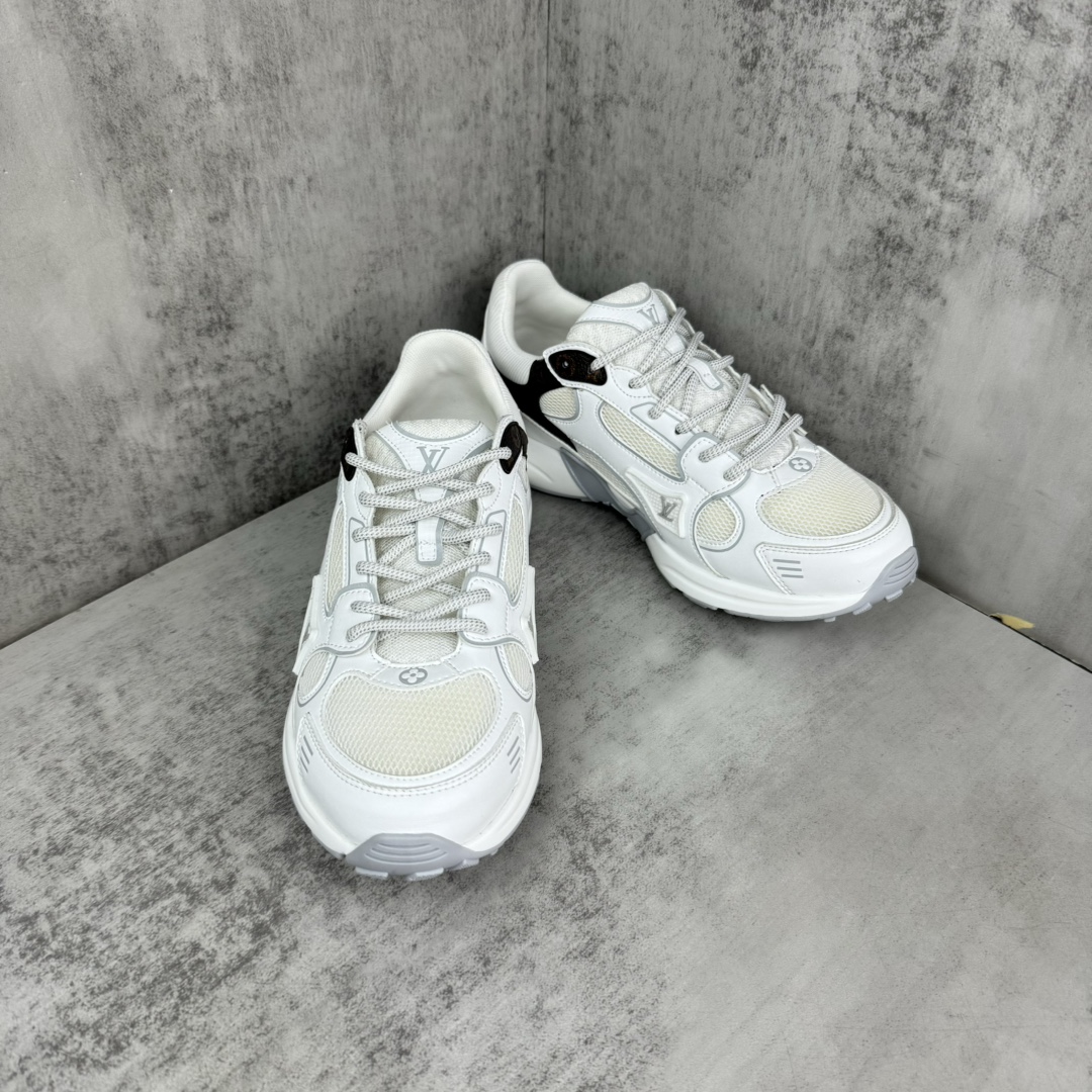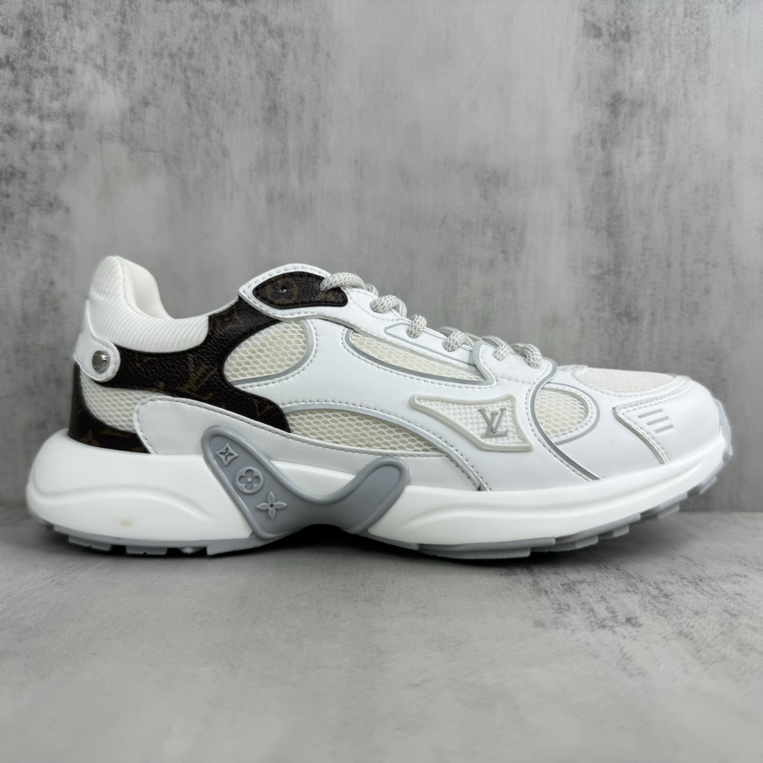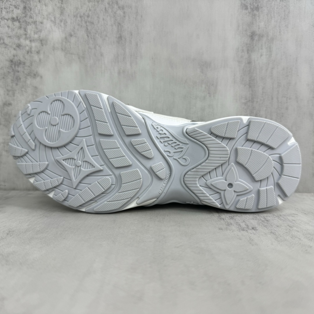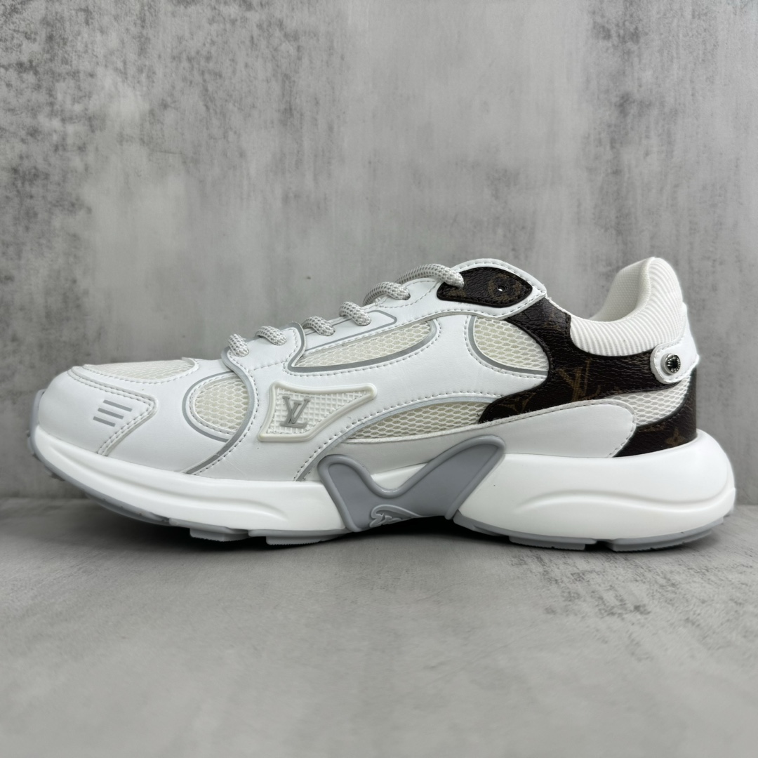 Louis Vuitton 25ss 早春 Olympia运动鞋 融合网格面料与金属质感合成皮革等科技面料,以利落简约设计重绎经典跑鞋设计。轻盈 EVA 外底成就舒弹穿着体验。Monogram 压纹与 I 字母等丰富细节树立辨识度 混合材质鞋带 路易威登元素 EVA 外底点缀 Monogram 花卉 码数:35-45