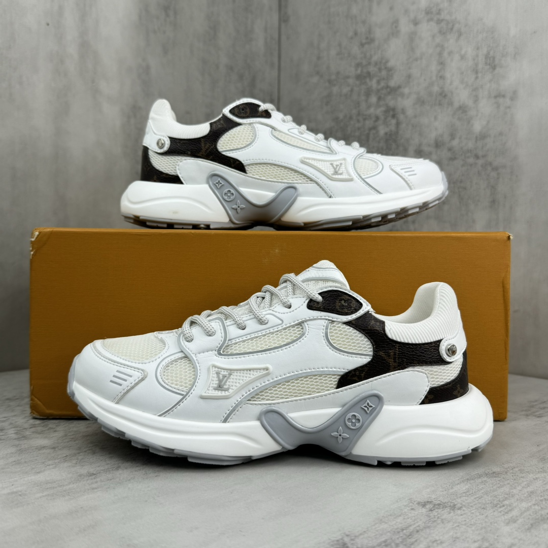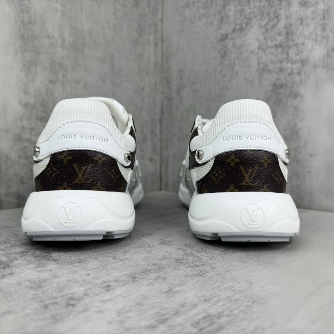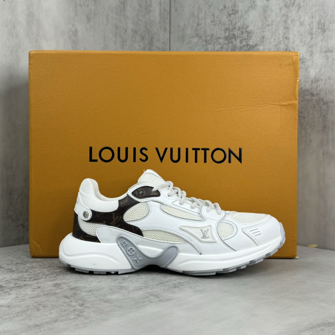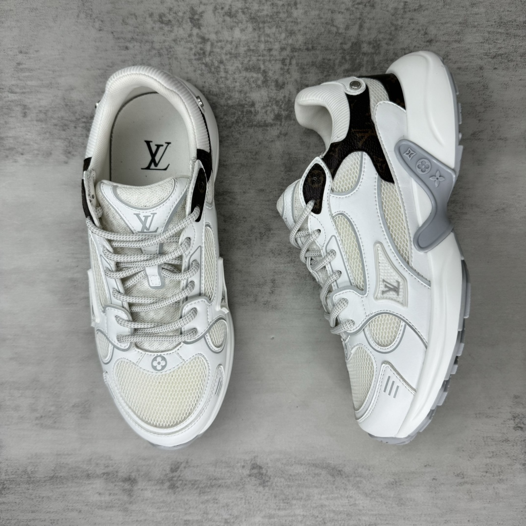 Louis Vuitton 25ss 早春 Olympia运动鞋 融合网格面料与金属质感合成皮革等科技面料,以利落简约设计重绎经典跑鞋设计。轻盈 EVA 外底成就舒弹穿着体验。Monogram 压纹与 I 字母等丰富细节树立辨识度 混合材质鞋带 路易威登元素 EVA 外底点缀 Monogram 花卉 码数:35-45