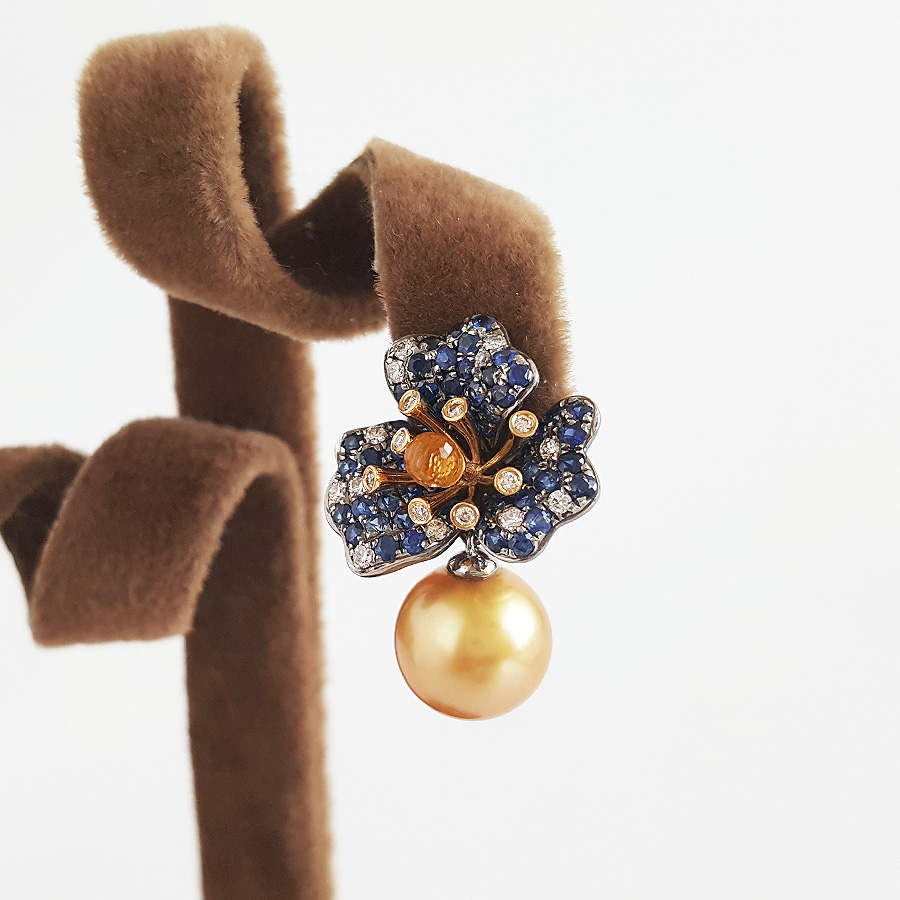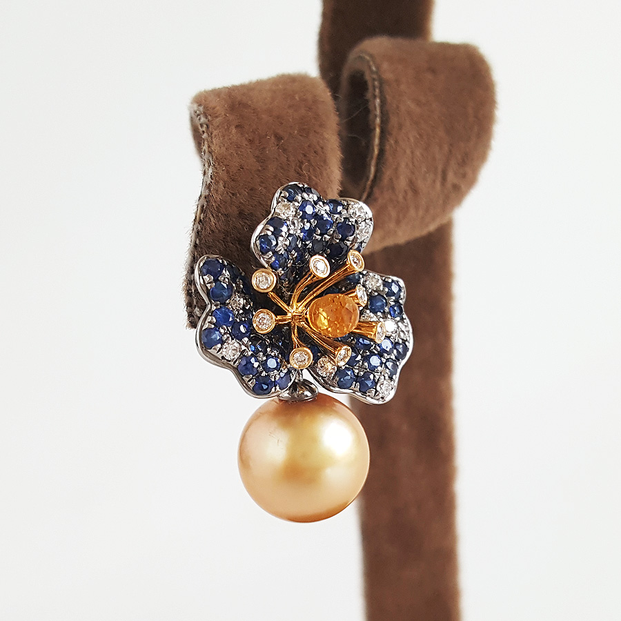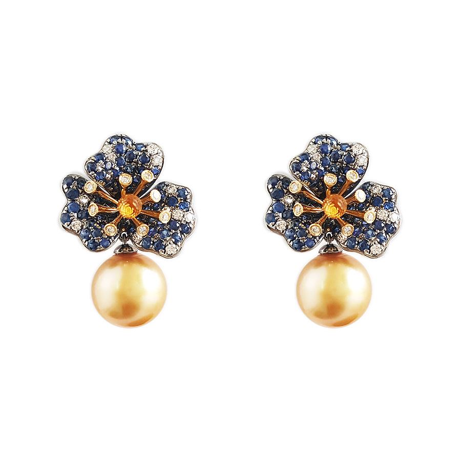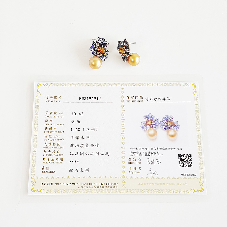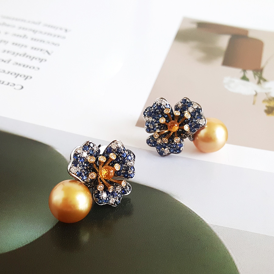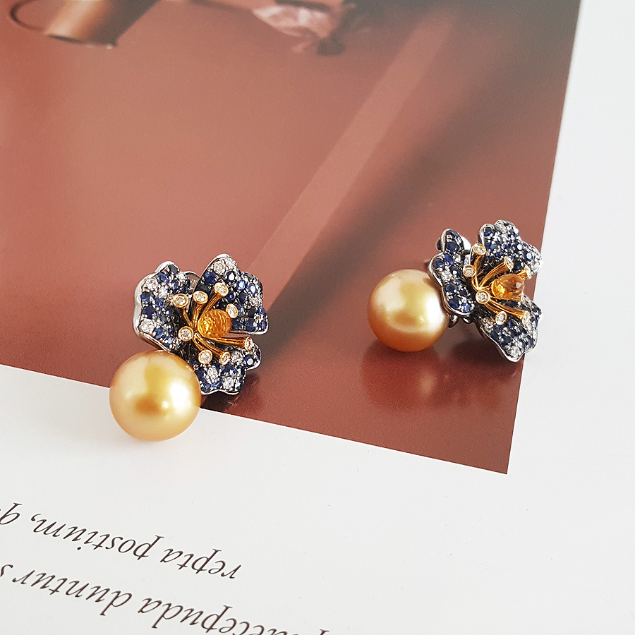 名称 | AU750收藏级黑金镶天然约9.8MM浓金海水珍珠花朵耳环 |