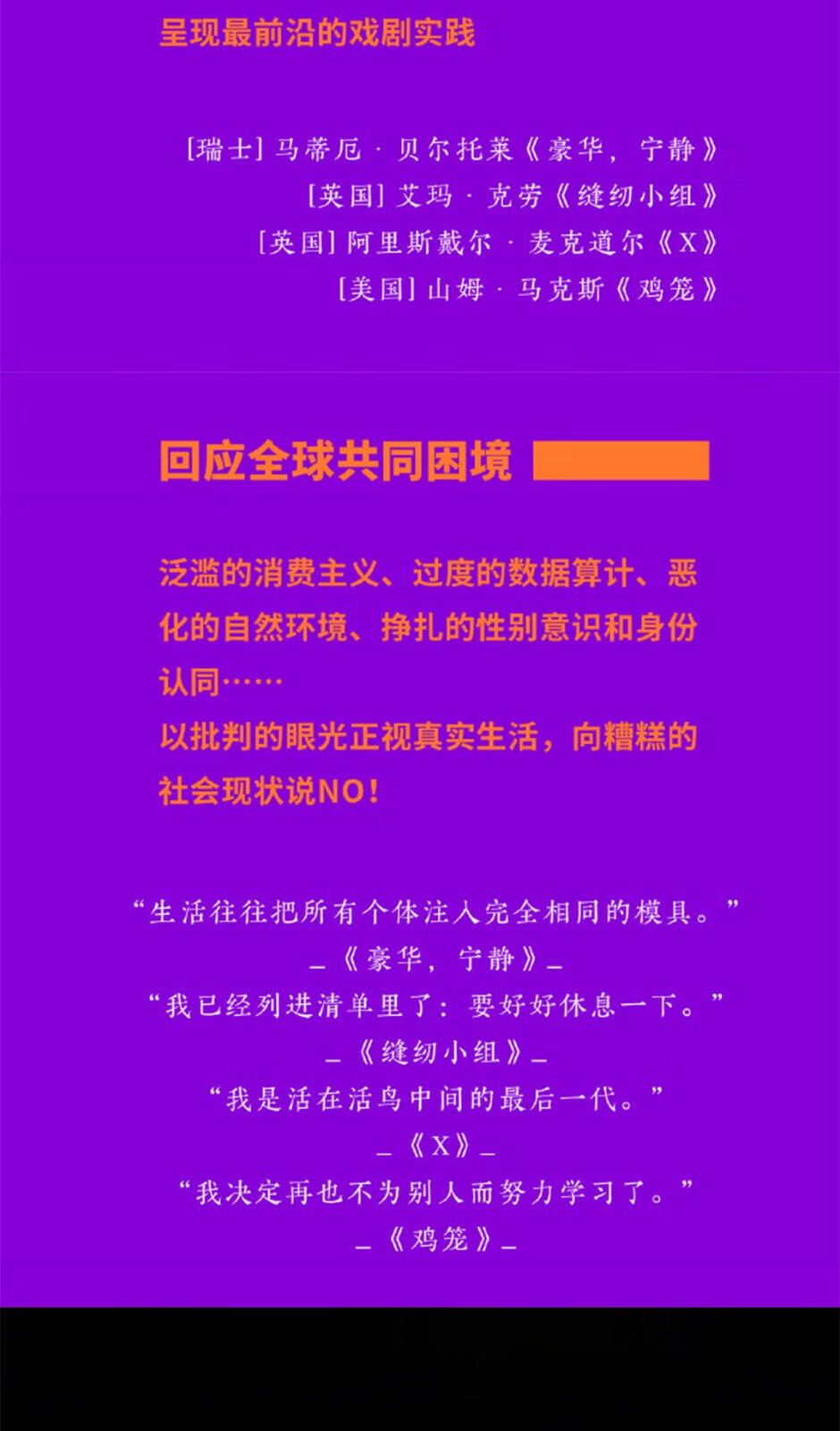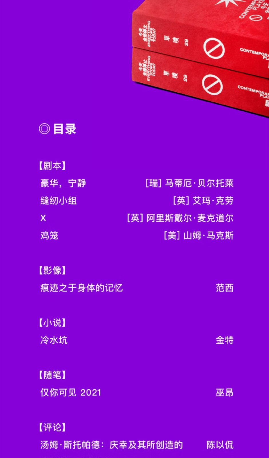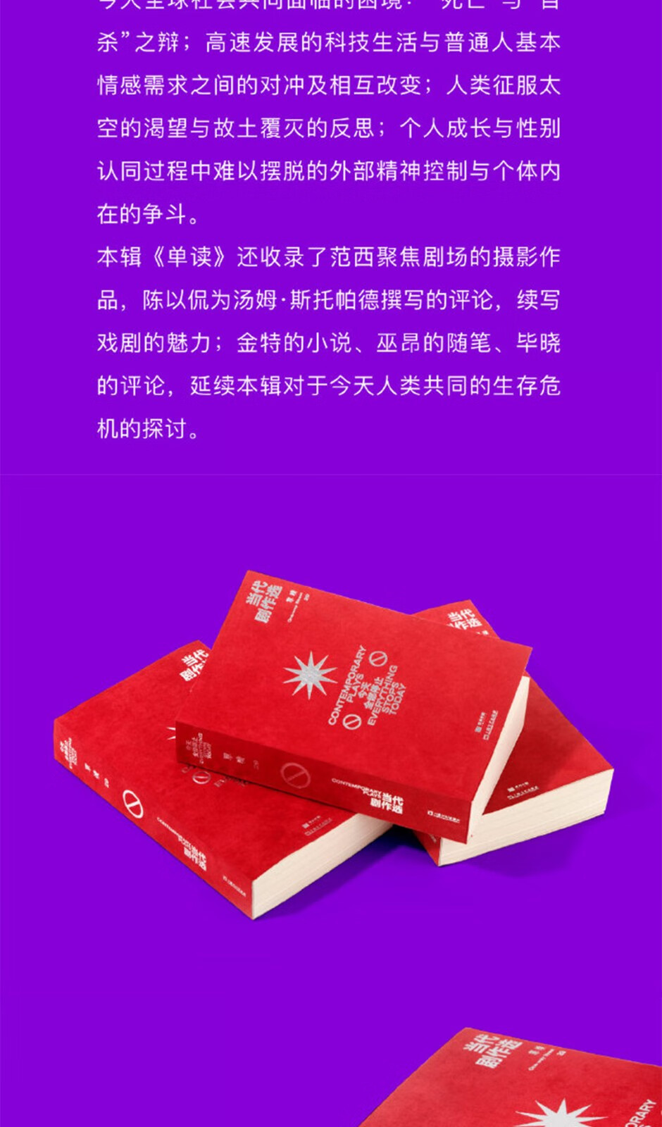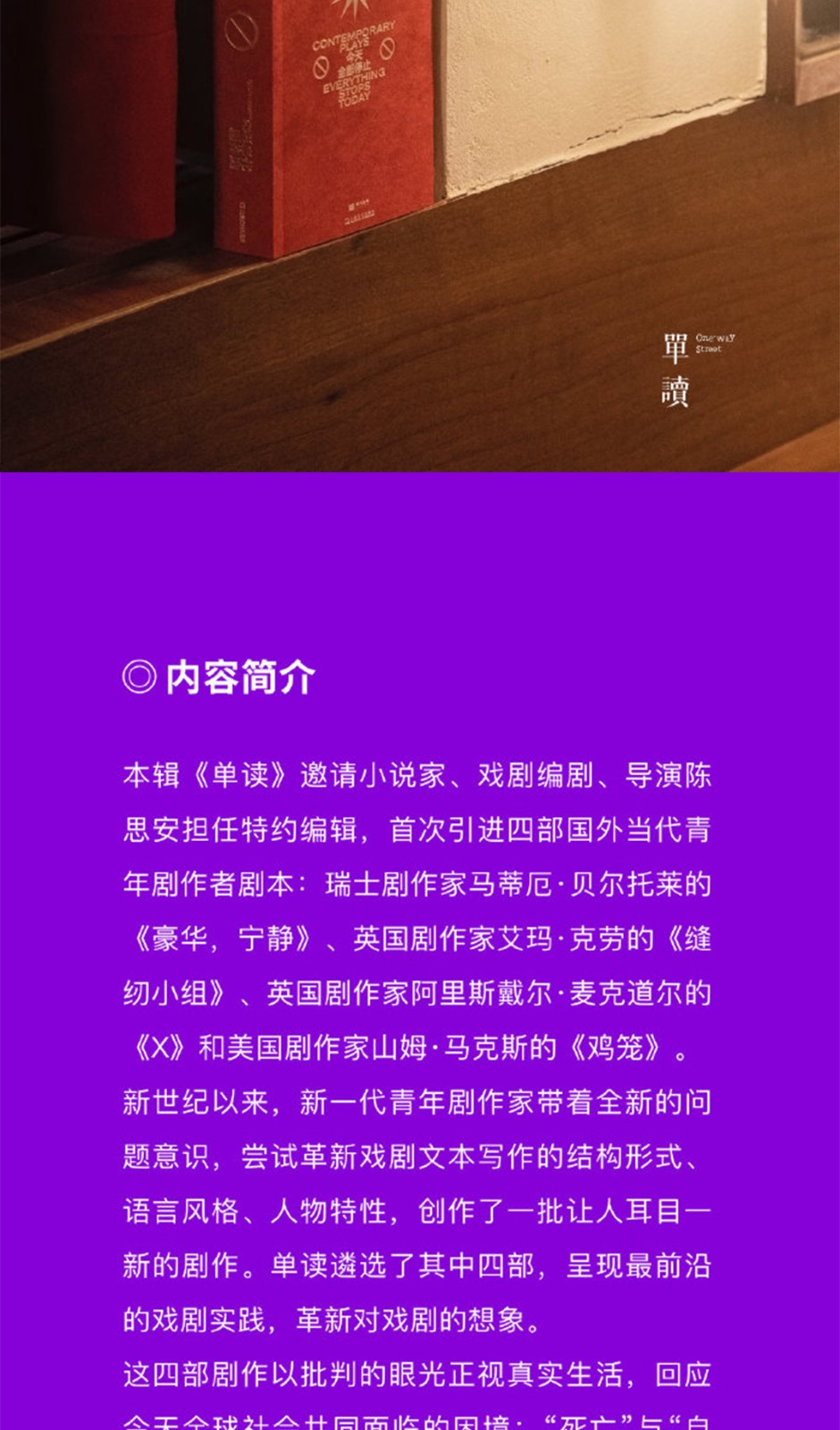 本辑《单读》邀请戏剧编剧、导演陈思安担任特约编辑,初次引进、完整出版四部国外当代青年剧作者剧本:瑞士剧作家马蒂厄·贝尔托莱的《豪华,宁静》、英国剧作家艾玛·克劳的《缝纫小组》、英国剧作家阿里斯戴尔·麦克道尔的《X》和美国剧作家山姆·马克斯的《鸡笼》。 新世纪以来,新一代青年剧作家带着全新的问题意识,尝试革新戏剧文本写作的结构形式、语言风格、人物特性,创作了一批反常规的独特剧作。单读遴选了其中四部剧作,呈现最前沿的戏剧实践,革新对戏剧的想象。 这四部剧作以批判的眼光正视真实生活,回应我们今天共同面临的困境:“死亡”与“自杀”之辩;高速发展的科技生活与普通人基本情感需求之间的对冲及相互改变;人类征服太空的渴望与故土覆灭的反思;个人成长与性别认同过程中难以摆脱的外部精神控制与个体内在的争斗。 本辑《单读》还收录了范西聚焦剧场的摄影作品,陈以侃为汤姆·斯托帕德撰写的评论,续写戏剧(剧场)的魅力;金特的小说、巫昂的随笔、毕晓的评论,延续本辑对于今天人类共同的生存危机的探讨。 |